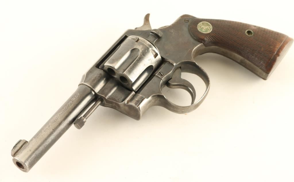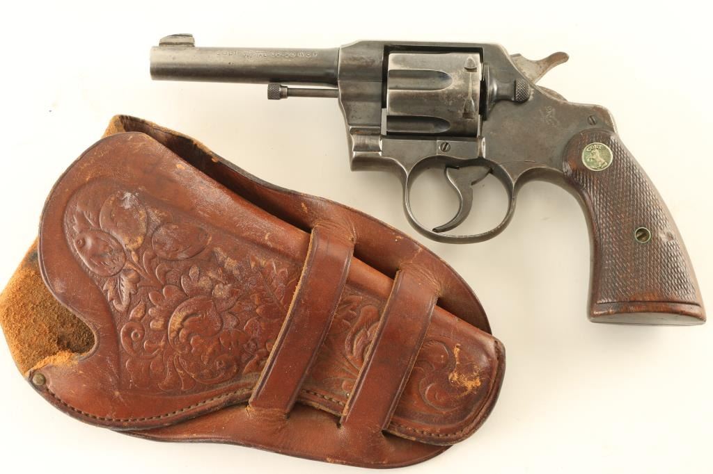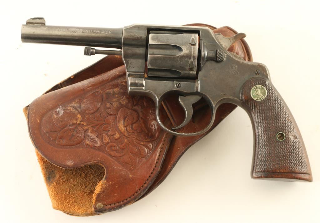 Medium frame double/single action revolver features blued finish, checkered wood grips with Colt medallions, 4" barrel, fixed sights. Bore is fir condition with dark grooves and light pitting throughout. Retains 25% blue with much bare metal on sharp edges, sides of barrel, high spots. Even coating of very thin rust on right side plate, back strap, sides of hammer. Grips are good condition with wear to checkered points. Action is stiff with a sticky hesitation in the middle of the trigger pull or when cocking the hammer. Includes fair condition floral carved western style brown leather drop loop holster. Condition is NRA Fair *** C&R Firearm ***