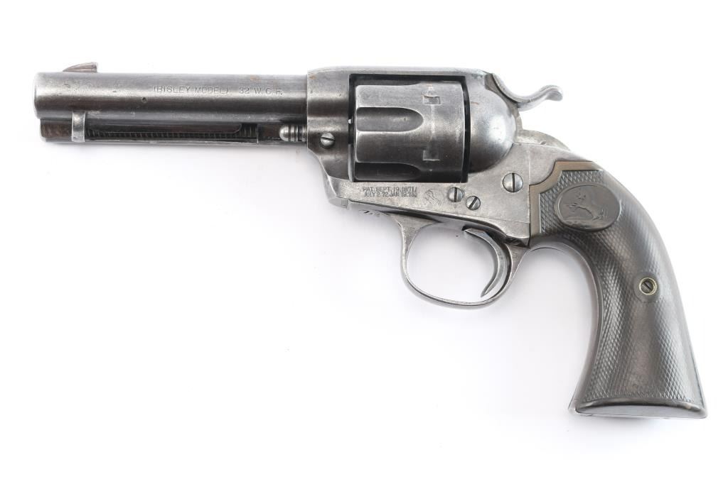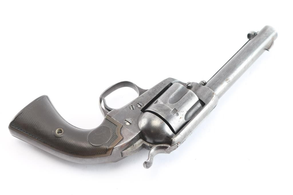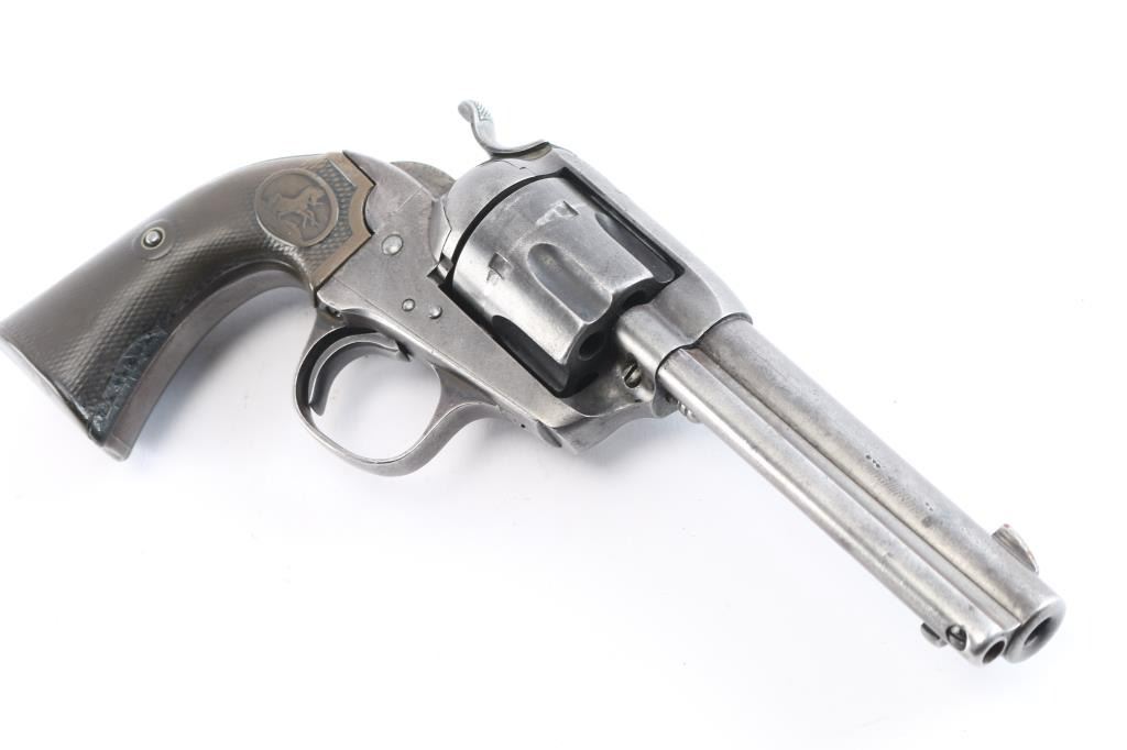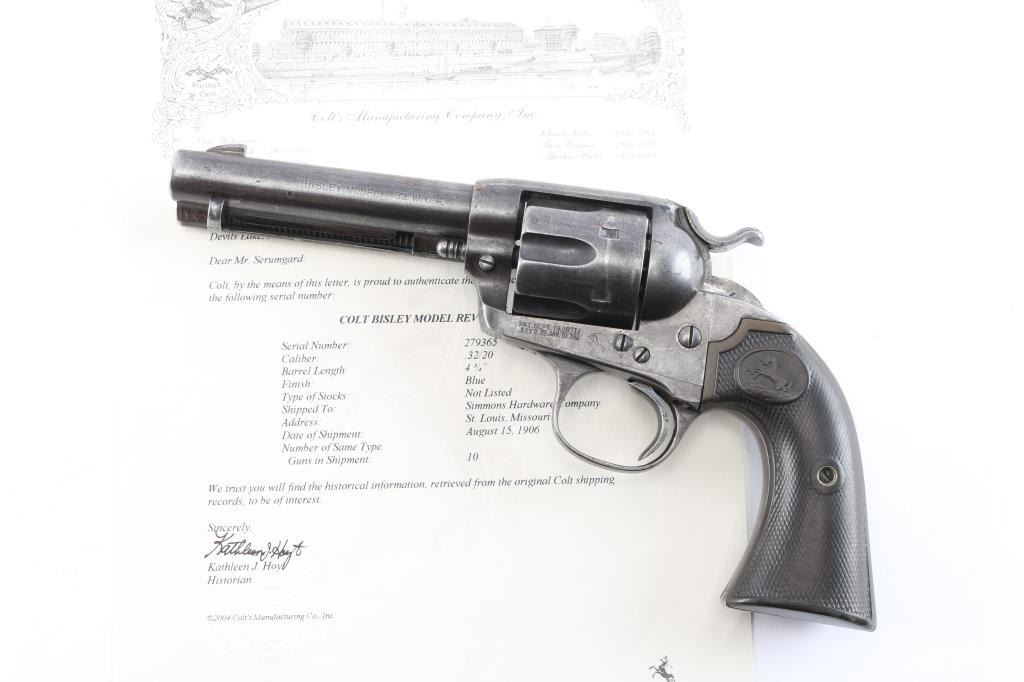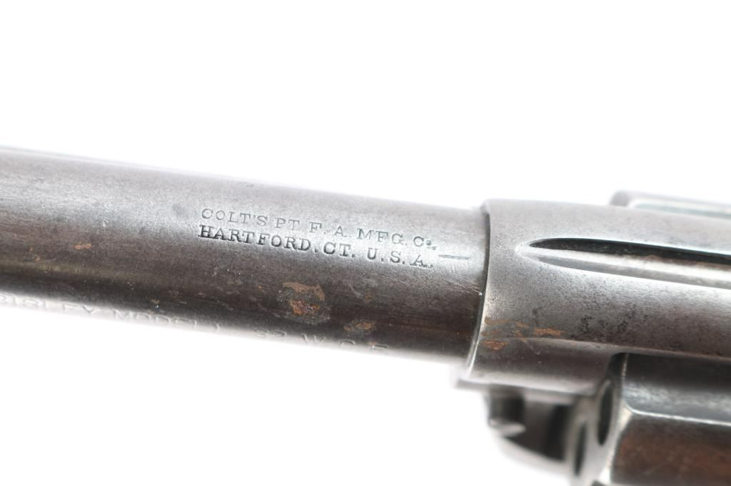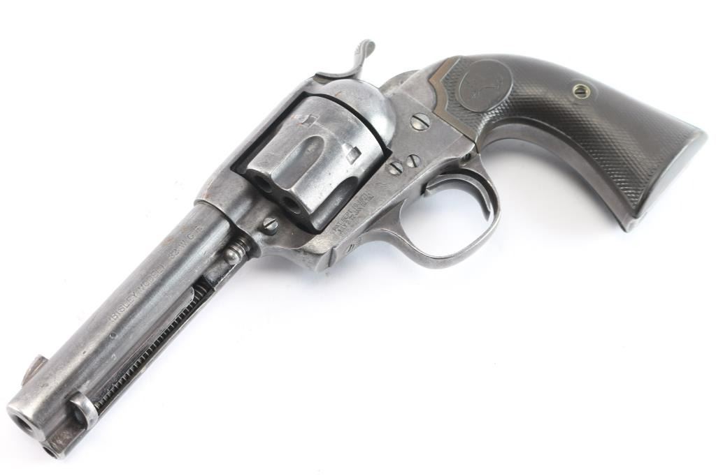 'First Generation' Single action six-shot revolver chambered in .32 Winchester Center Fire, circa 1906. Features a blued/case hardened finish, 4 3/4" barrel with two-line address, ejector rod, shortened blade front sight, 'v' notched rear sight, wide low-profile hammer spur, smooth trigger, fluted cylinder, and humped-back grip frame with Rampant Colt two-piece checkered black hard rubber grips. Includes a Colt factory letter which confirms it's configuration and states it was shipped to Simmons Hardware Company in St. Louis, Missouri on August 15, 1906 in a ten gun shipment. Markings are good and all serial numbers are matching. Revolver exhibits mid-light grey patina with remnants of a black painted finish visible in protected areas. Action is strong with three clicks, bore is good some scattered light pitting and grips are fair as worn smooth & the right panel showing a repair along the toe. The inside of the right grip panel is inscribed S. H. S./Worthington/Minn/RT 4 Box 30".