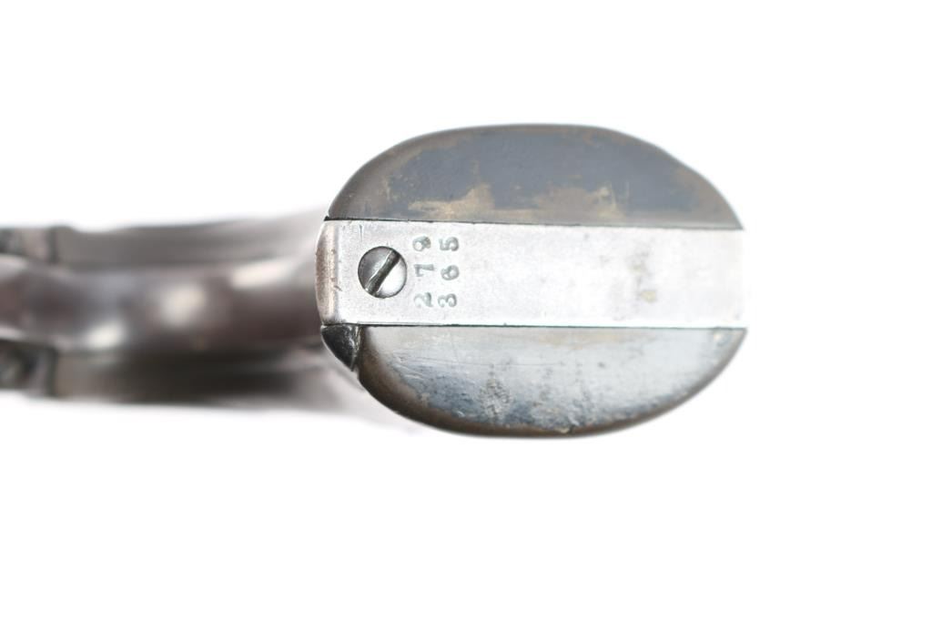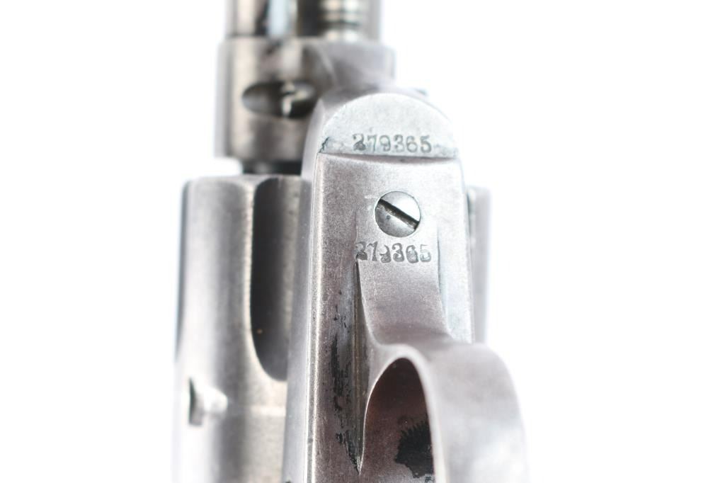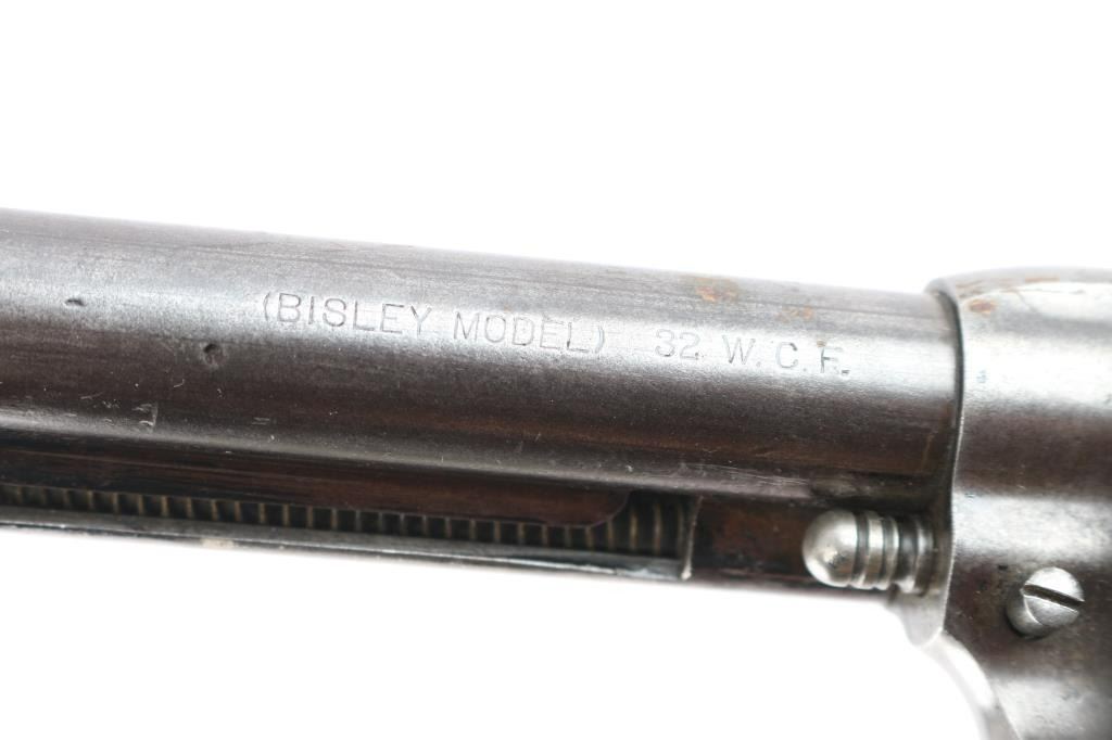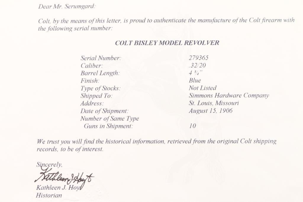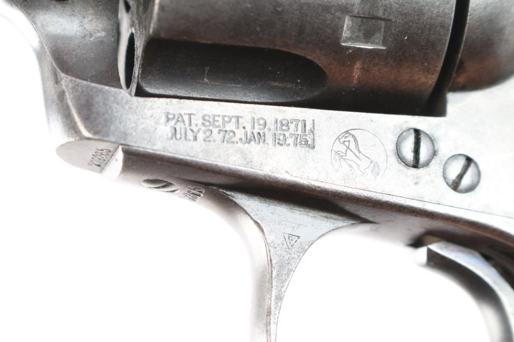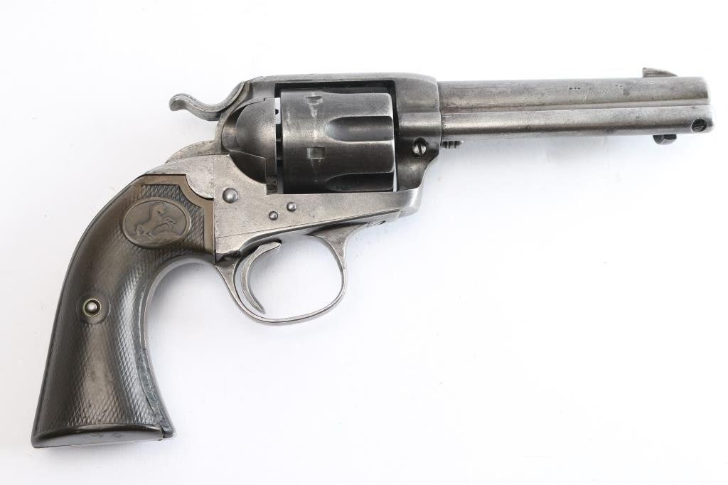 'First Generation' Single action six-shot revolver chambered in .32 Winchester Center Fire, circa 1906. Features a blued/case hardened finish, 4 3/4" barrel with two-line address, ejector rod, shortened blade front sight, 'v' notched rear sight, wide low-profile hammer spur, smooth trigger, fluted cylinder, and humped-back grip frame with Rampant Colt two-piece checkered black hard rubber grips. Includes a Colt factory letter which confirms it's configuration and states it was shipped to Simmons Hardware Company in St. Louis, Missouri on August 15, 1906 in a ten gun shipment. Markings are good and all serial numbers are matching. Revolver exhibits mid-light grey patina with remnants of a black painted finish visible in protected areas. Action is strong with three clicks, bore is good some scattered light pitting and grips are fair as worn smooth & the right panel showing a repair along the toe. The inside of the right grip panel is inscribed S. H. S./Worthington/Minn/RT 4 Box 30".