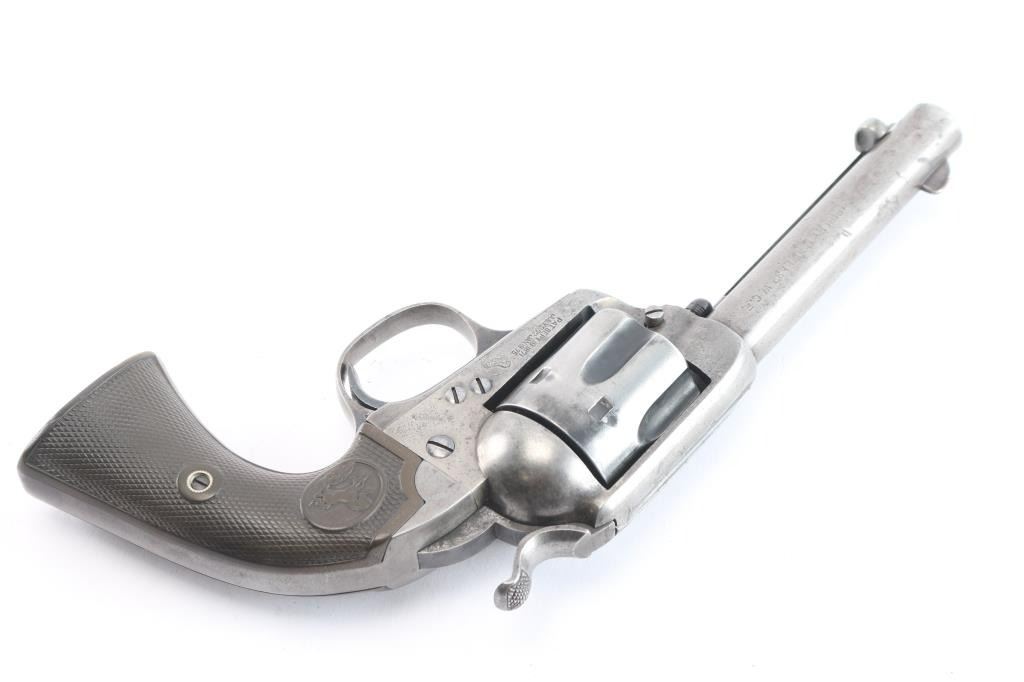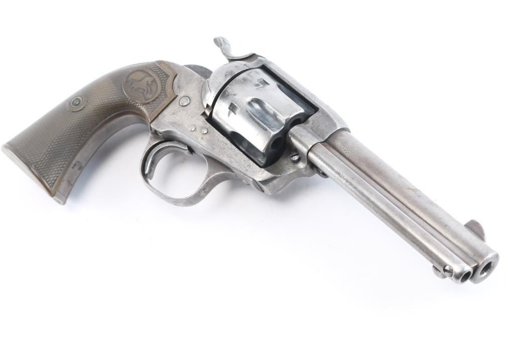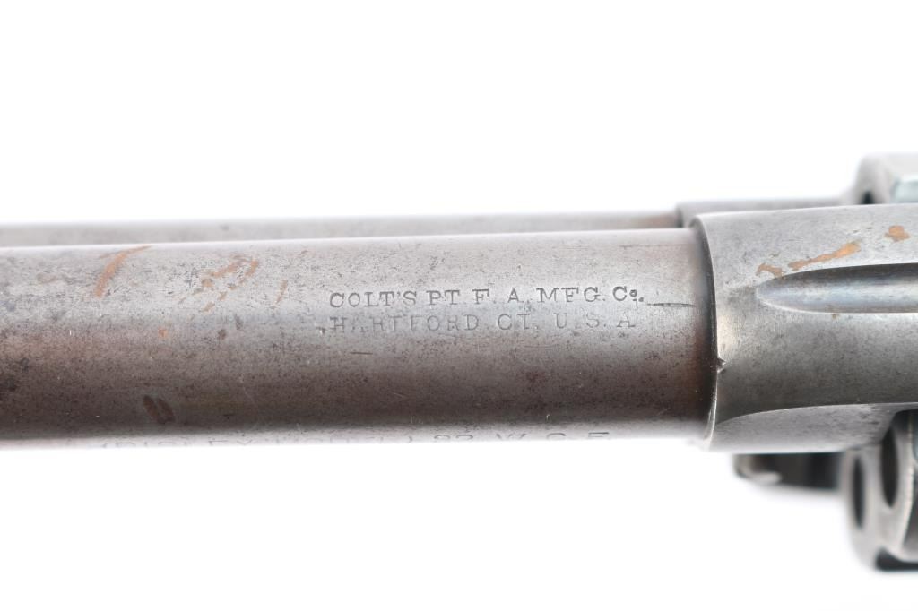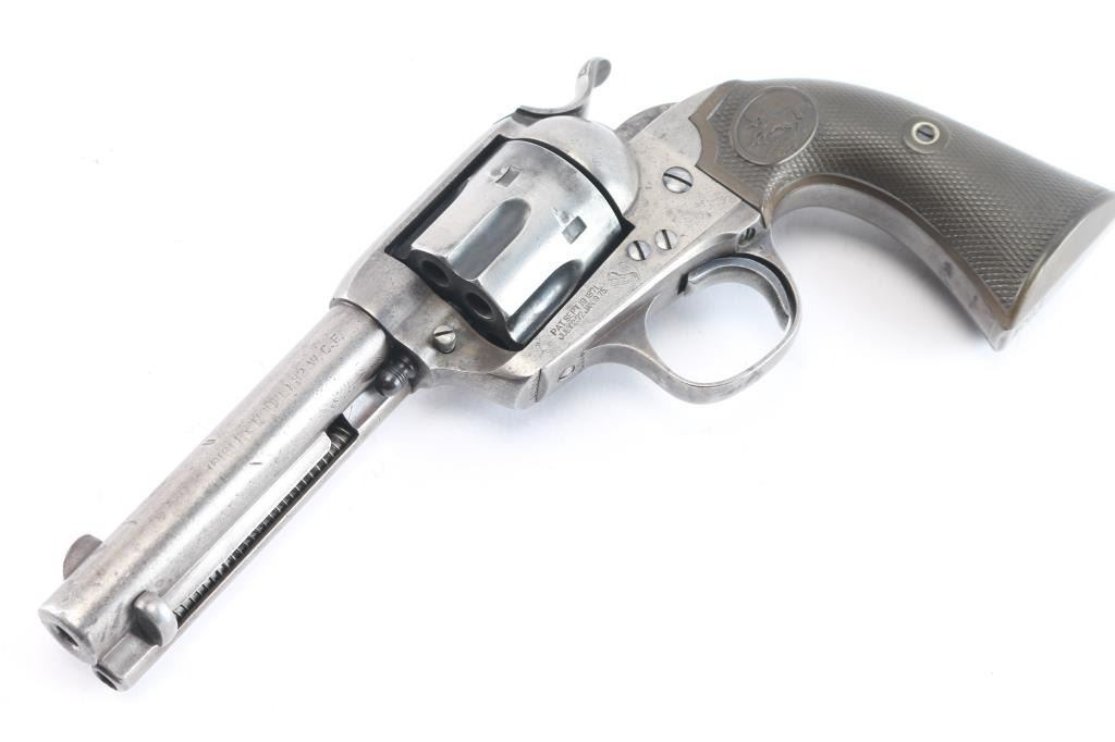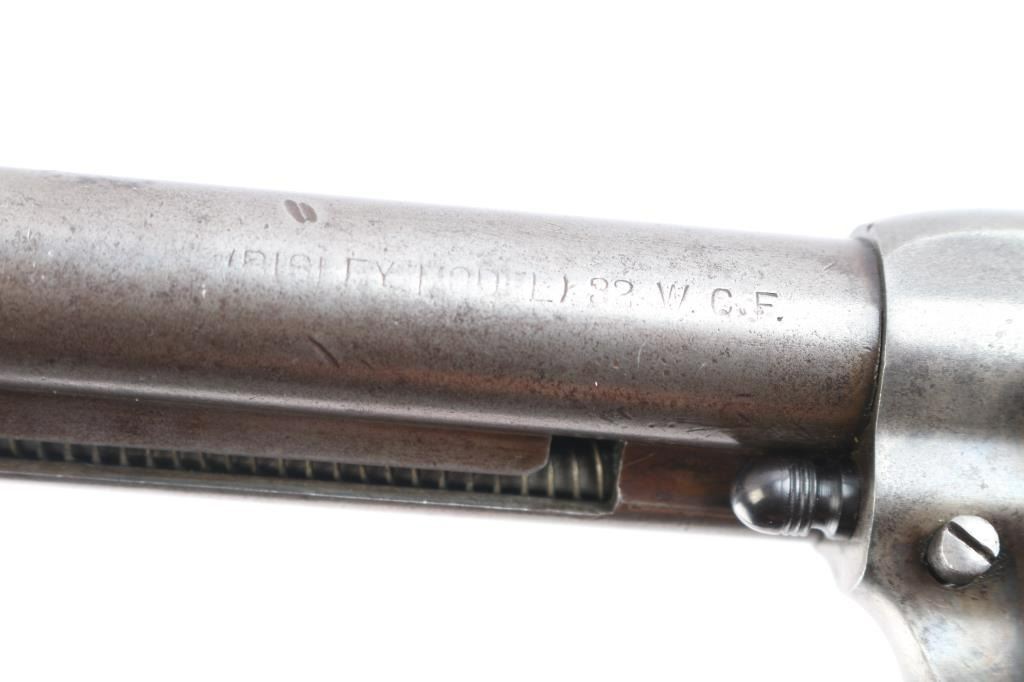'First Generation' Single action revolver chambered in .32 Winchester Center Fire, circa 1907. Features a blued & case hardened finish, 4 3/4" barrel with two line address, ejector rod, blade front sight, 'v' notched rear sight, wide low-profile hammer spur, smooth trigger, fluted six-shot cylinder, and two-piece Rampant Colt checkered black hard rubber grips. Revolver exhibits small amounts of it's original case hardened colors on the frame under the cylinder pin release and remnants of bluing in the cylinder flutes & in other protected areas with the balance of the revolver's metal surfaces turned to a mostly even light grey patina. The cylinder pin was likely replaced. The patent markings are clear, the barrel markings are faint and all serial numbers are matching with the last four digits scratched onto both grips. Triggerguard is stamped with 'VP' inside a triangle and '6'. Action is crisp with all four clicks & good lock-up, bore is good with some very shallow pitting and grips are very good.