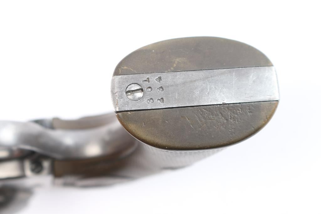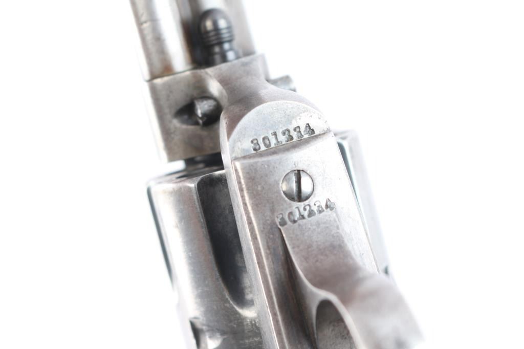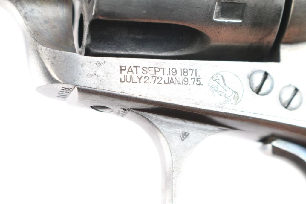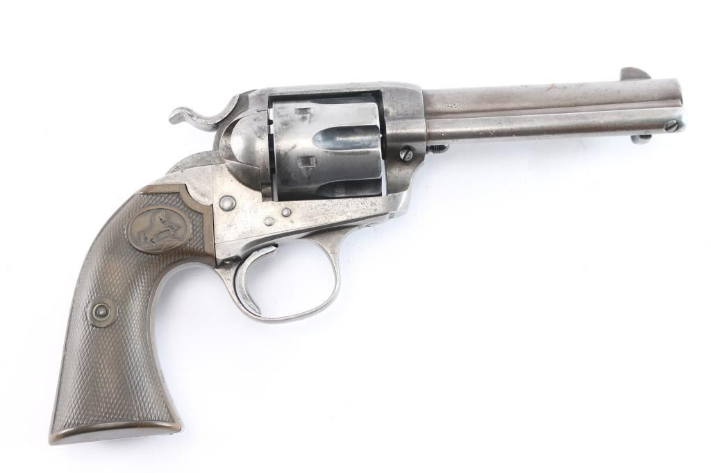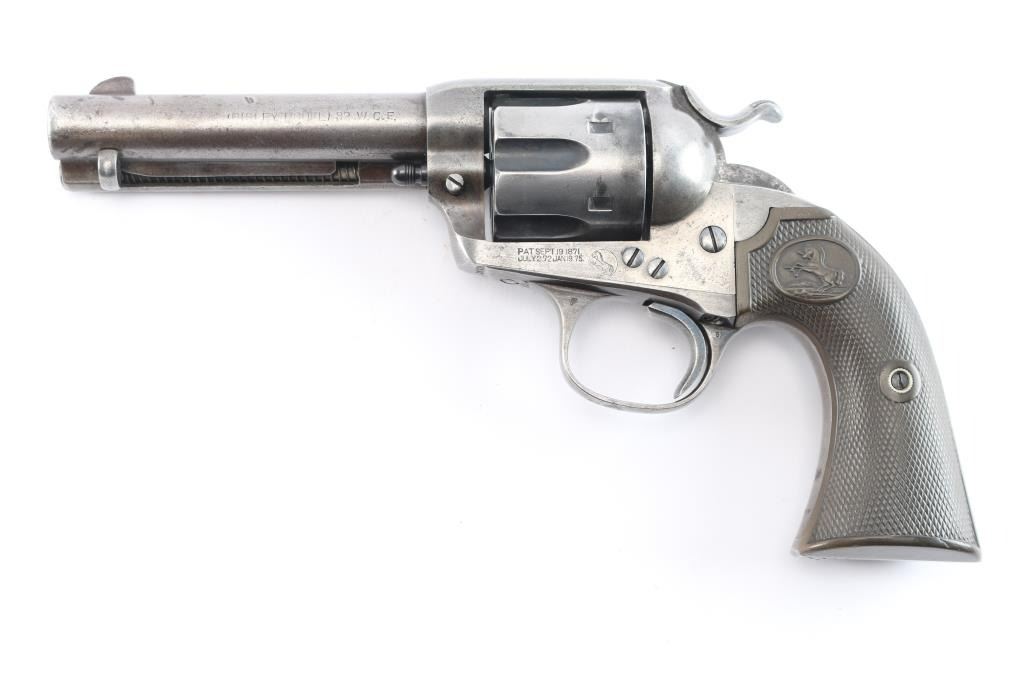 'First Generation' Single action revolver chambered in .32 Winchester Center Fire, circa 1907. Features a blued & case hardened finish, 4 3/4" barrel with two line address, ejector rod, blade front sight, 'v' notched rear sight, wide low-profile hammer spur, smooth trigger, fluted six-shot cylinder, and two-piece Rampant Colt checkered black hard rubber grips. Revolver exhibits small amounts of it's original case hardened colors on the frame under the cylinder pin release and remnants of bluing in the cylinder flutes & in other protected areas with the balance of the revolver's metal surfaces turned to a mostly even light grey patina. The cylinder pin was likely replaced. The patent markings are clear, the barrel markings are faint and all serial numbers are matching with the last four digits scratched onto both grips. Triggerguard is stamped with 'VP' inside a triangle and '6'. Action is crisp with all four clicks & good lock-up, bore is good with some very shallow pitting and grips are very good.