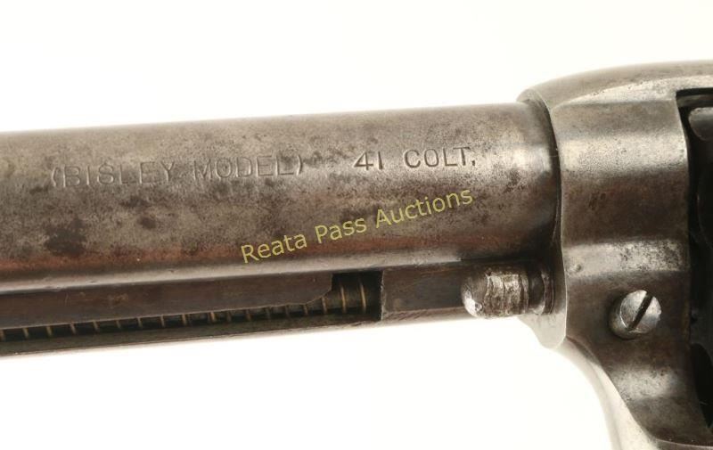 'First Generation' Single action six-shot revolver chambered in .41 Colt, circa 1909. Features a blued & case hardened finish, 4 3/4" barrel with two line address, ejector rod, blade front sight, 'v' notched rear sight, wide low-profile hammer spur, smooth trigger, fluted cylinder, and two-piece Colt checkered black hard rubber grips. Revolver exhibits small amounts of it's original finish in protected areas with a majority of it's metal surfaces turned to a grey/brown patina. All markings are clear and all serial numbers match. Triggerguard is stamped with 'VP' inside a triangle and 'W'. Action is strong, bore is good with some pitting near the muzzle and grips are very good. Condition is good+. ***C&R Firearm*** ***Modern Firearm***