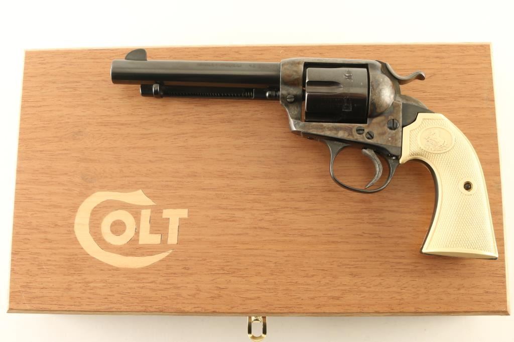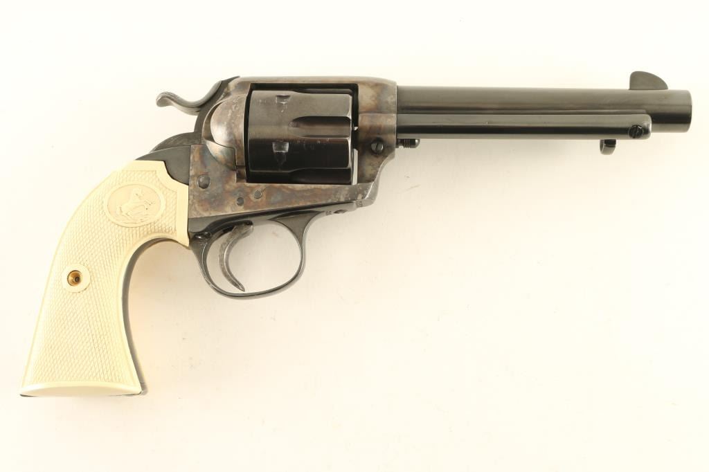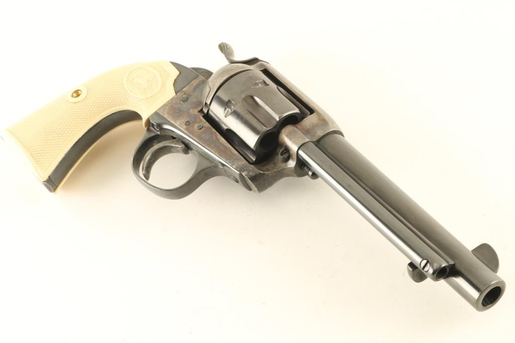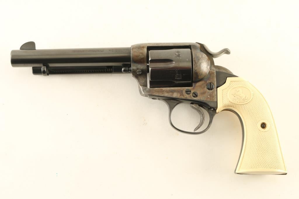 Vintage western style single action revolver chambered in .45 Colt, manufactured in Hartford, CT circa 1902 and subsequently restored. Features a blued & case hardened refinish, 5 1/2" barrel with machine cut single line address, blade front sight, ‘v’ notched rear sight, ejector rod with crescent head, fluted six-shot cylinder, smooth wide trigger, knurled wide low-profile hammer spur and checkered two-piece faux ivory grips with molded rampant Colt décor. Includes a custom made wood presentation case with inlayed “Colt” in the lid and foam lined interior with cartridge block. Matching serial numbers are found on the frame, triggerguard and backstrap. Revolver retains approximately 90% of its professionally applied refinish showing some high point edge wear, turn wear on the cylinder and scattered oxidation on the frame. Action is sound with four hammer clicks, the bore is very good and the faux ivory grips are good but are slightly ill-fitting. Condition is NRA Very Good as refinished. ***C&R Firearm***