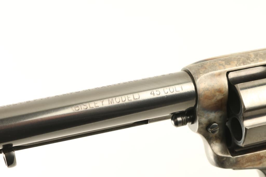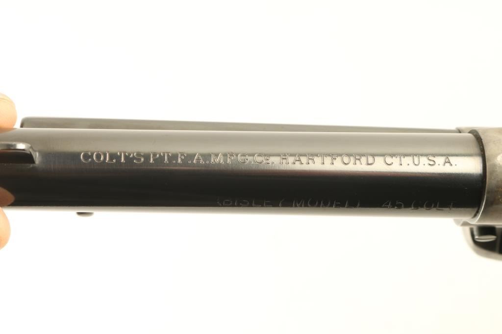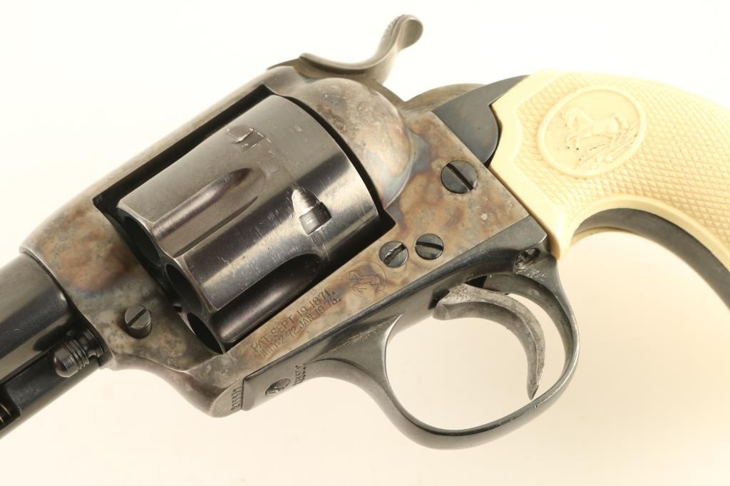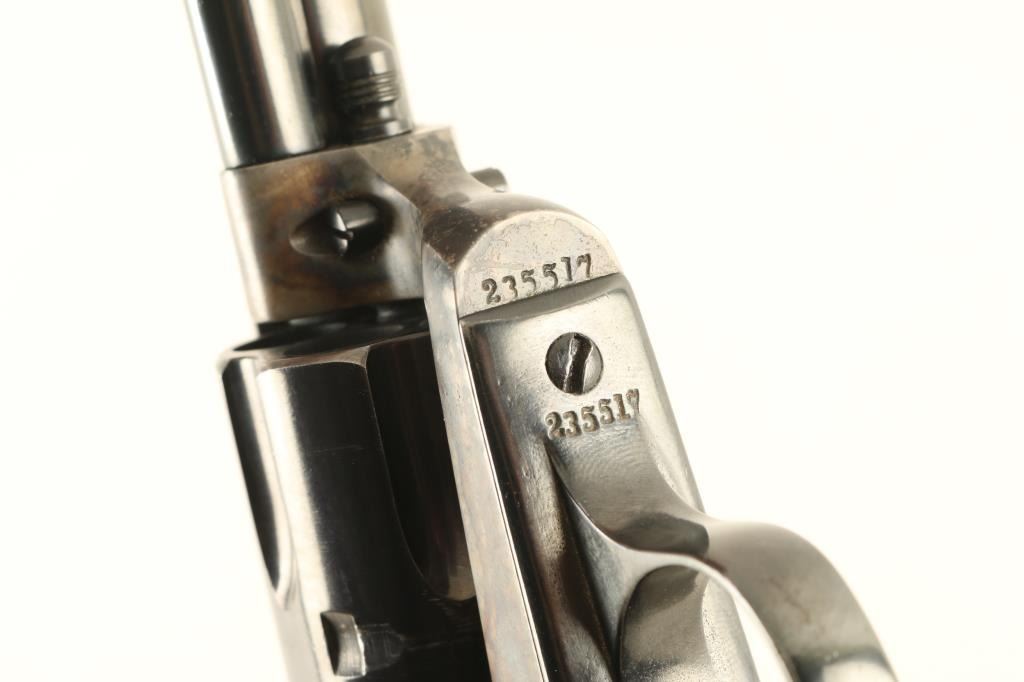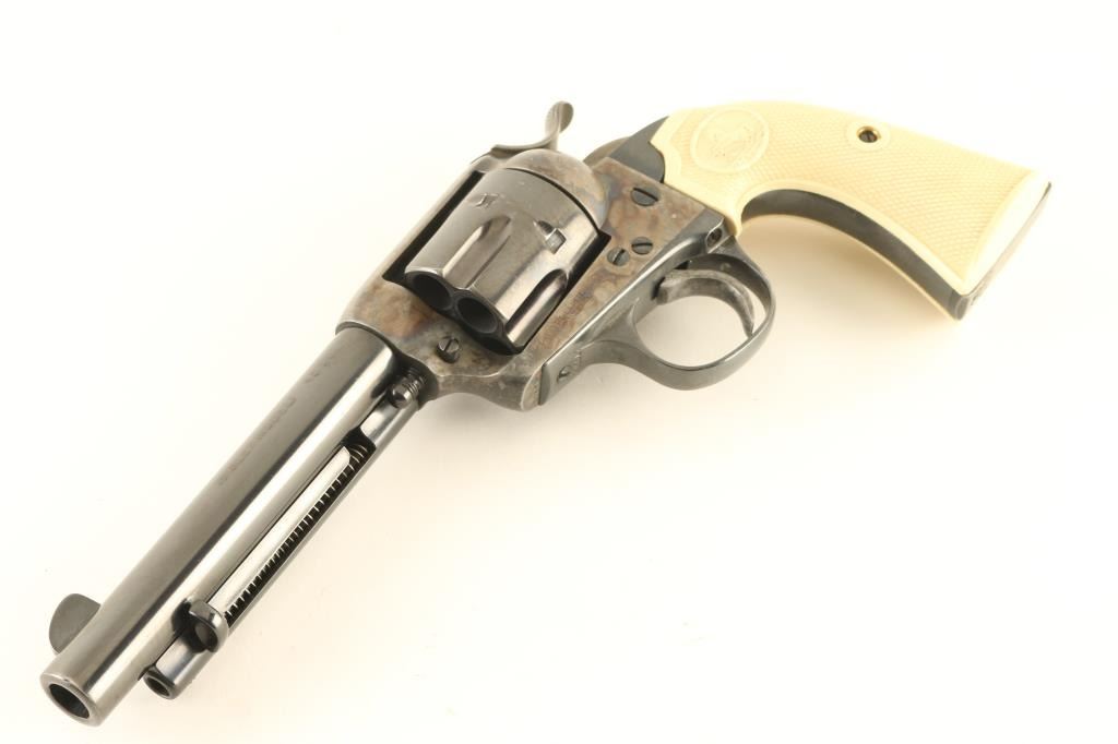 Vintage western style single action revolver chambered in .45 Colt, manufactured in Hartford, CT circa 1902 and subsequently restored. Features a blued & case hardened refinish, 5 1/2" barrel with machine cut single line address, blade front sight, ‘v’ notched rear sight, ejector rod with crescent head, fluted six-shot cylinder, smooth wide trigger, knurled wide low-profile hammer spur and checkered two-piece faux ivory grips with molded rampant Colt décor. Includes a custom made wood presentation case with inlayed “Colt” in the lid and foam lined interior with cartridge block. Matching serial numbers are found on the frame, triggerguard and backstrap. Revolver retains approximately 90% of its professionally applied refinish showing some high point edge wear, turn wear on the cylinder and scattered oxidation on the frame. Action is sound with four hammer clicks, the bore is very good and the faux ivory grips are good but are slightly ill-fitting. Condition is NRA Very Good as refinished. ***C&R Firearm***
