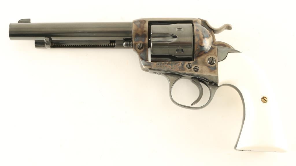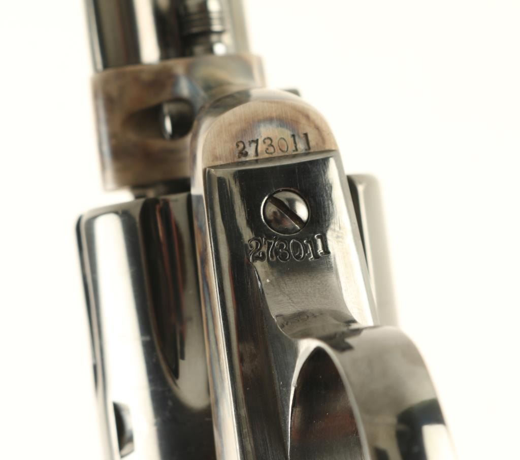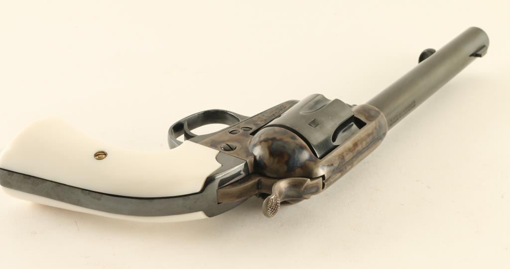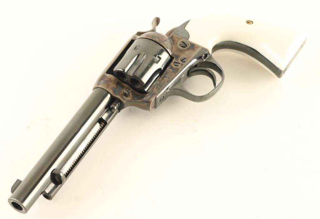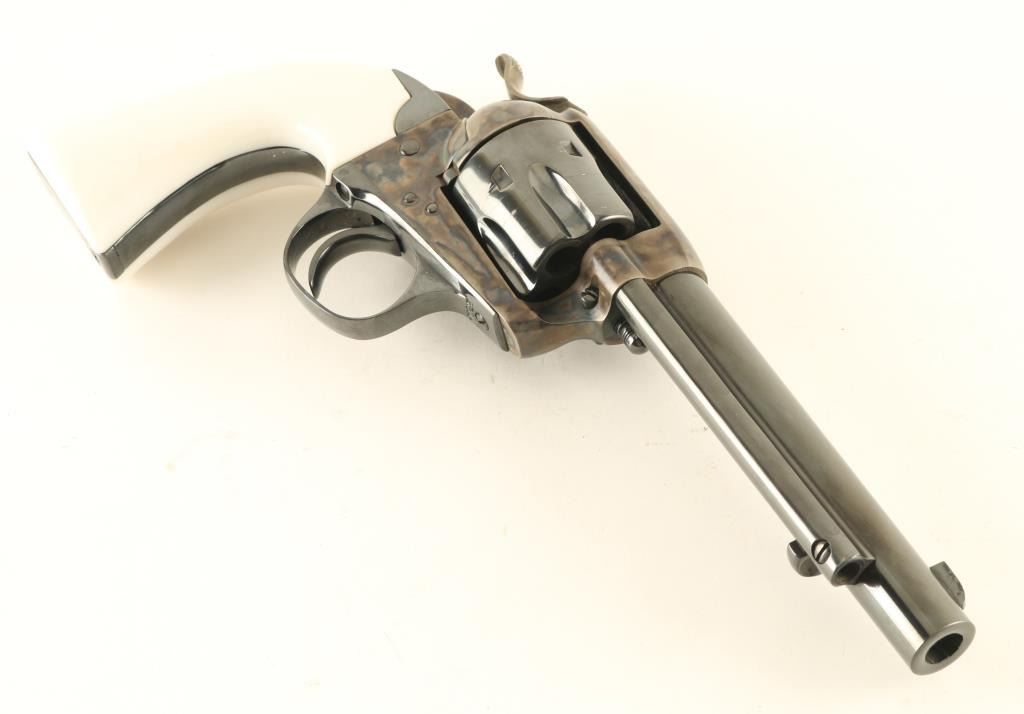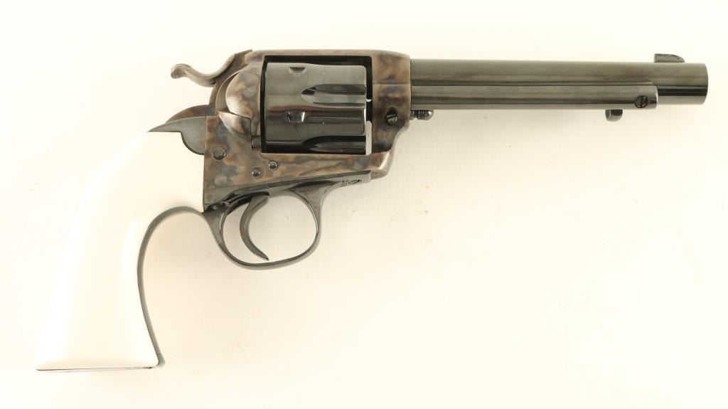 Single action revolver manufactured circa 1906, appears carefully restored. Features blued finish, case color frame & hammer, 5.5" barrel, fixed sights, smooth white polymer grips, Bisley shaped grip. Bore is very good to excellent. Charge holes are very good. Retains 95% finish with some light scuffing on barrel & cylinder, light drag line, few visible scratches on barrel. Case color is bright and vivid. Grips are excellent. Action is smooth with tight lock-up. Numbers match on frame, grip straps. Loading gate door numbered "2008". Receiver markings & barrel address line are crisp. Condition is NRA Excellent (as restored) *** C&R Firearm ***