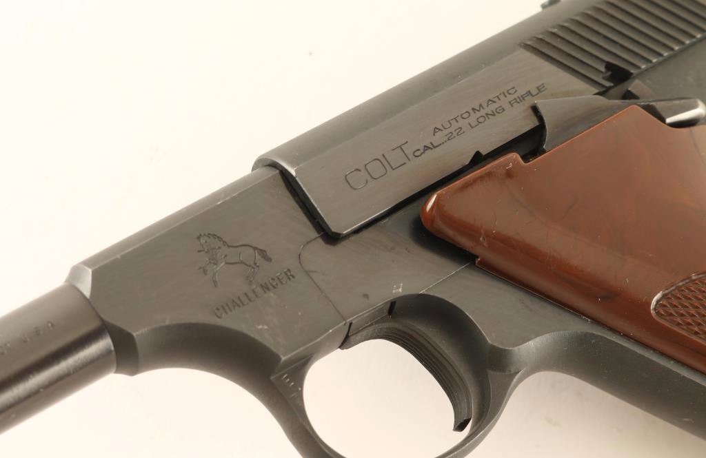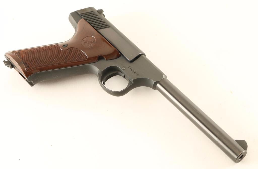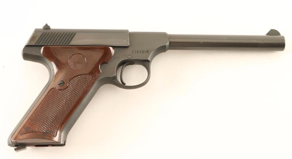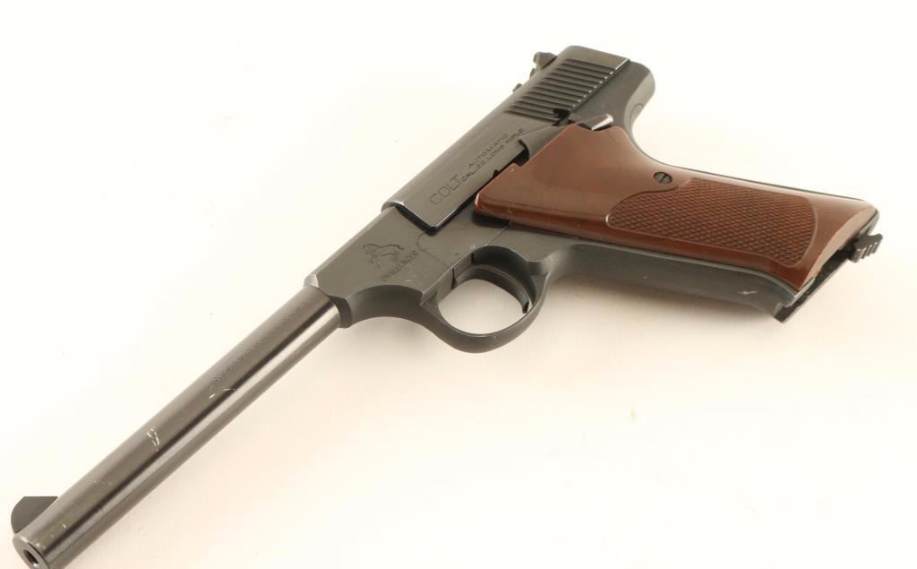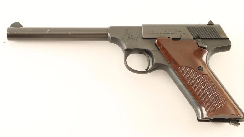 'Second Series' Single action semi-automatic target pistol chambered in .22 Long Rifle, circa 1950(first year production). Features a blued finish, 6" straight taper barrel, patridge front sight, dovetailed rear window sight, serrated trigger, no magazine, thumb safety/slide stop, and two-piece faux wood checkered brown plastic grips with Rampant Colt decor on the right panel. Pistol exhibits approximately 95% of it's original blued finish showing slight muzzle wear, some bright scratches and a minute amount of scattered emerging rust found on the frame & a dot found on the right side of the barrel near the muzzle. Action is smooth, bore is pristine, and plastic grips are very good+. Condition is very good. ***Modern Firearm***