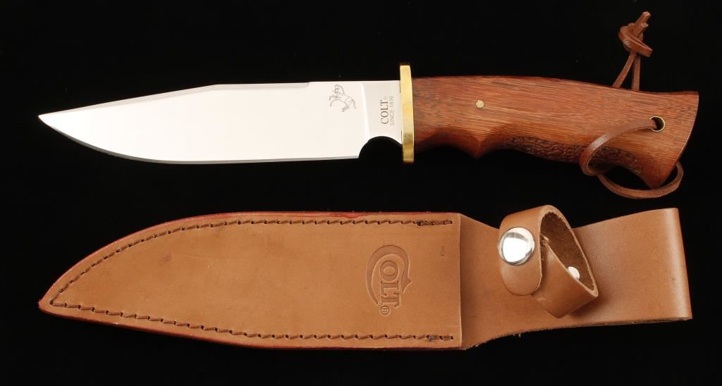 Wooden finger grooved handle, stainless steel blade which measures 6". Includes leather sheath and original box.