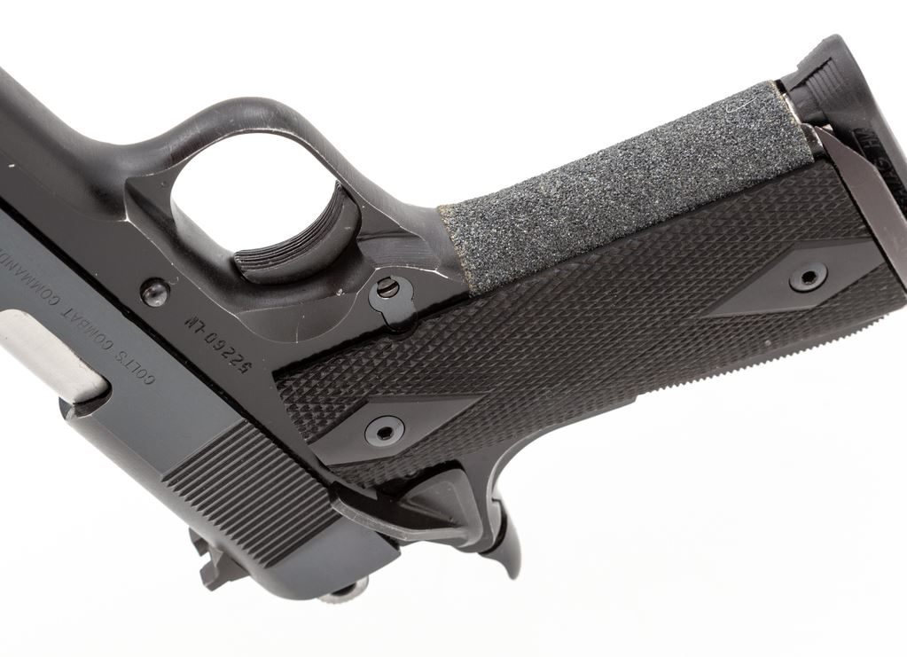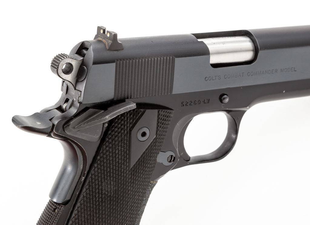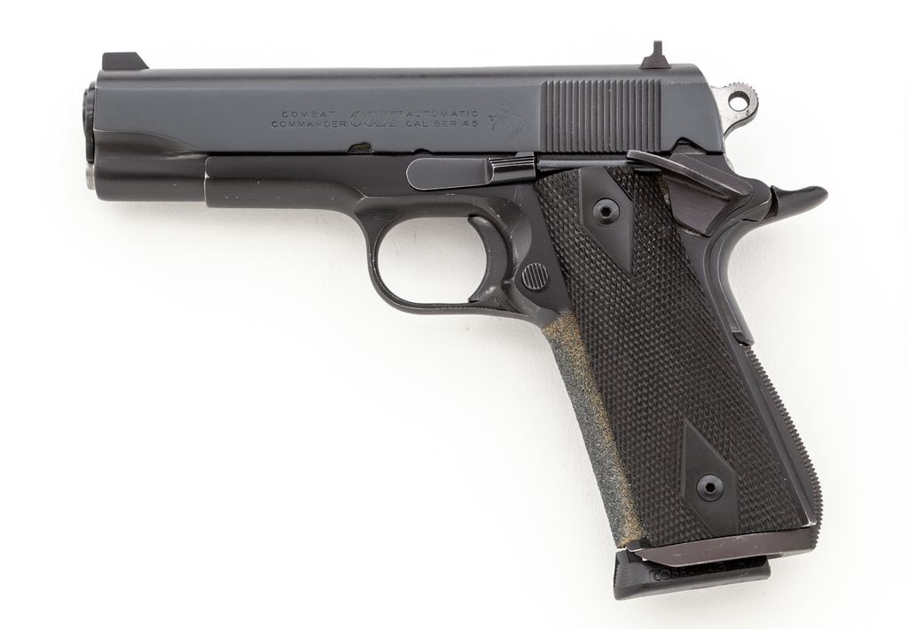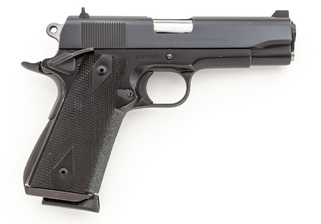 Colt Combat Commander Semi-Automatic Pistol, #52260-LW, .45 ACP cal., 4.25'' barrel, blue finish, checkered ebony grips. Pistol with upgrades including special mainspring housing, coarse tape treatment to front strap, three-dot sights, spring guide tube, beavertail grips safety and ambidextrous thumb safety. Mfg'd 1967. Condition is excellent as modified, retaining approx. 96% original finish. Crisp grips and action, tuned trigger, bright bore. Est.: $750-$1,000. (Modern/PPT)