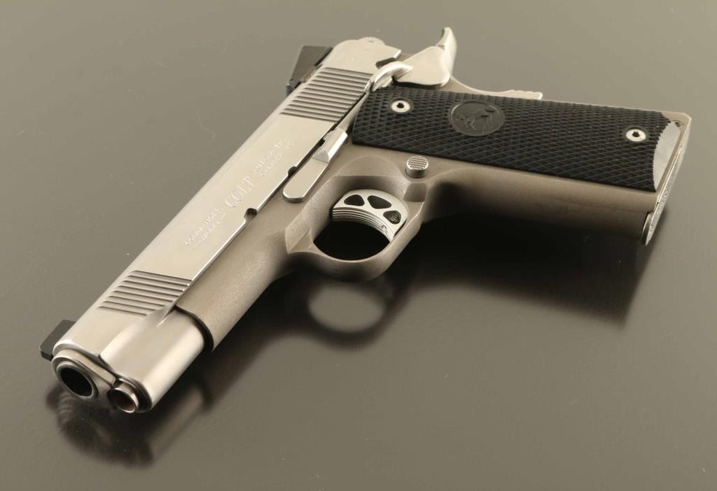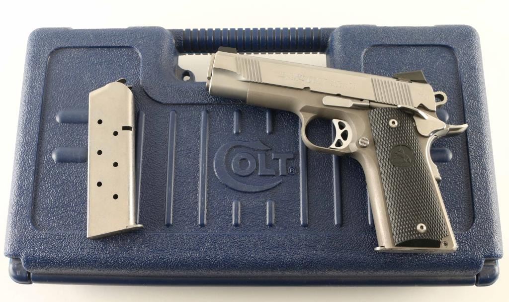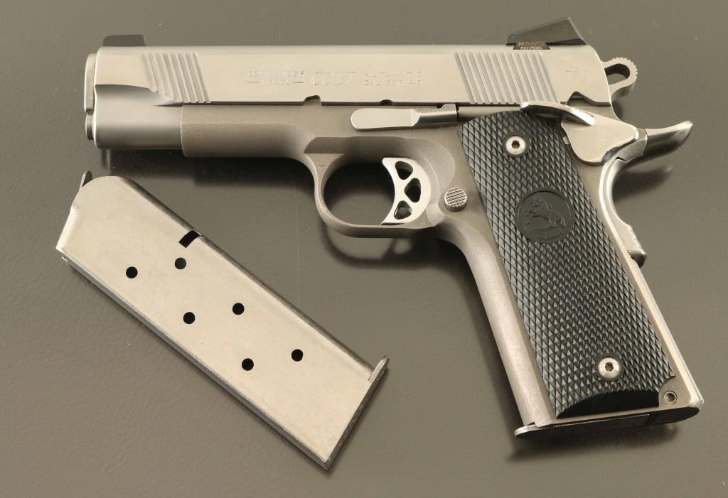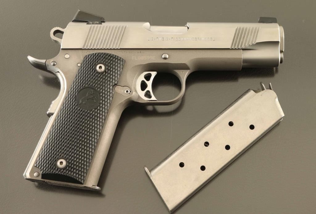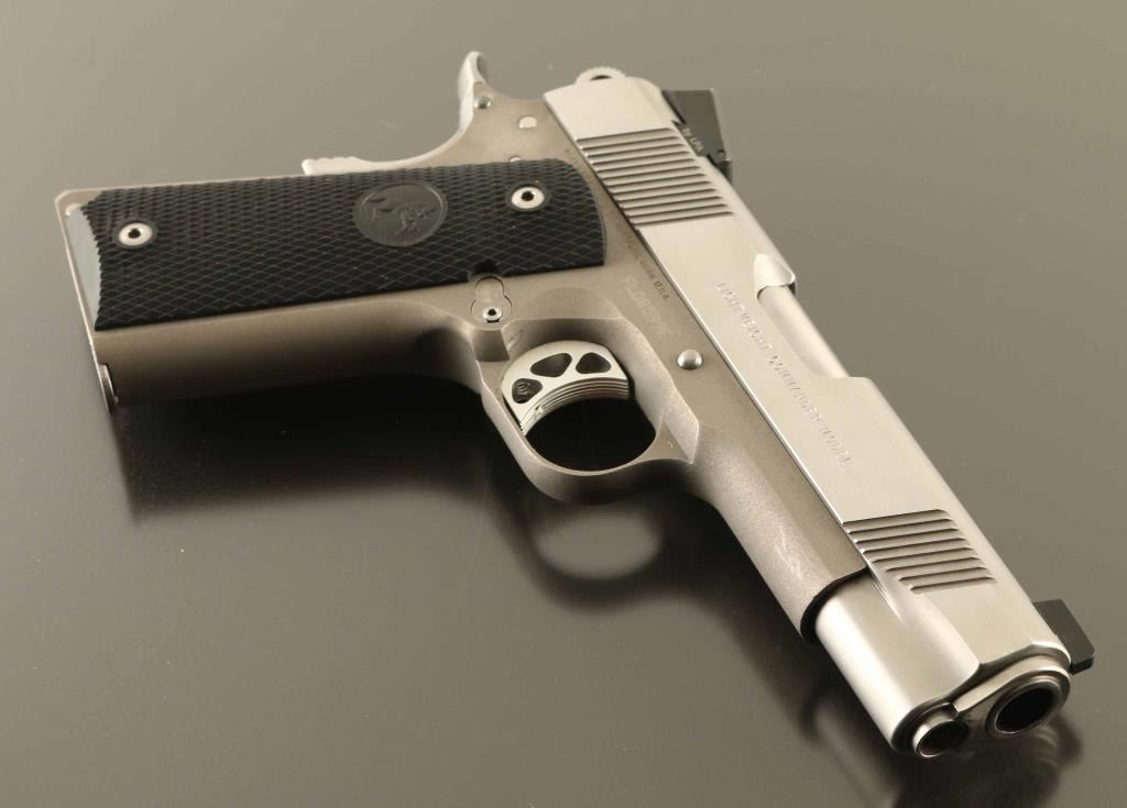 'Lightweight' Semiautomatic pistol features stainless steel construction with matching color lightweight alloy frame, 4.25" barrel, 3 dot Novak night sights in dovetails, beavertail grip safety with memory groove hump, frame mounted manual safety, black plastic checkered grips. Overall condition is excellent with few signs of handling, few scuffs to right side of slide. Night sights have little or no remaining glow. Includes (2) magazines, manual, factory plastic case. Condition is NRA Excellent *** Modern Firearm ***