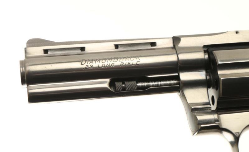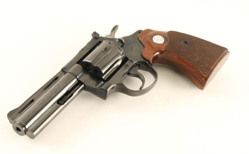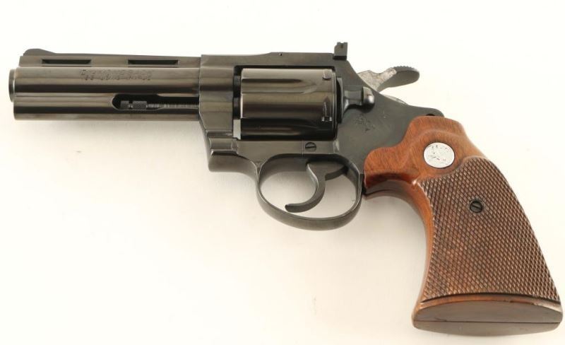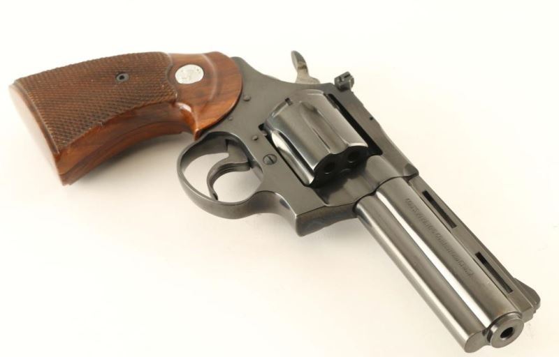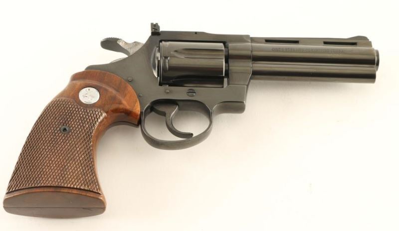 Desirable medium frame double-action revolver chambered in .22 Long Rifle, circa 1969. Features a blued finish, 4" ventilation ribbed barrel with full underlug, raised ramp front sight, adjustable rear window sight, serrated trigger, fluted six-shot cylinder, large serrated hammer spur and two-piece checkered walnut grips with silver Colt medallions. Revolver exhibits approximately 92% of it's original finish showing light holster wear and scattered handling marks. Action is smooth with solid lock-up, bore is pristine and wood grips are fine with only minor blemishes. Condition is near NRA excellent. ***Modern Firearm***