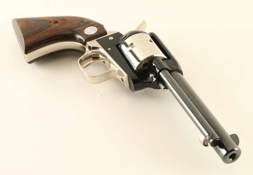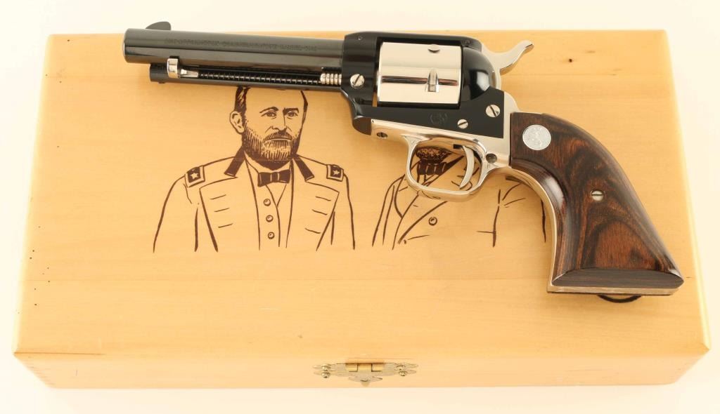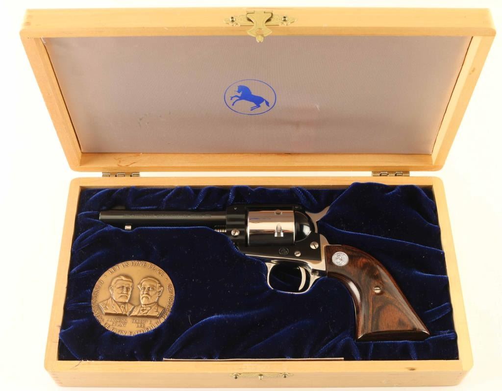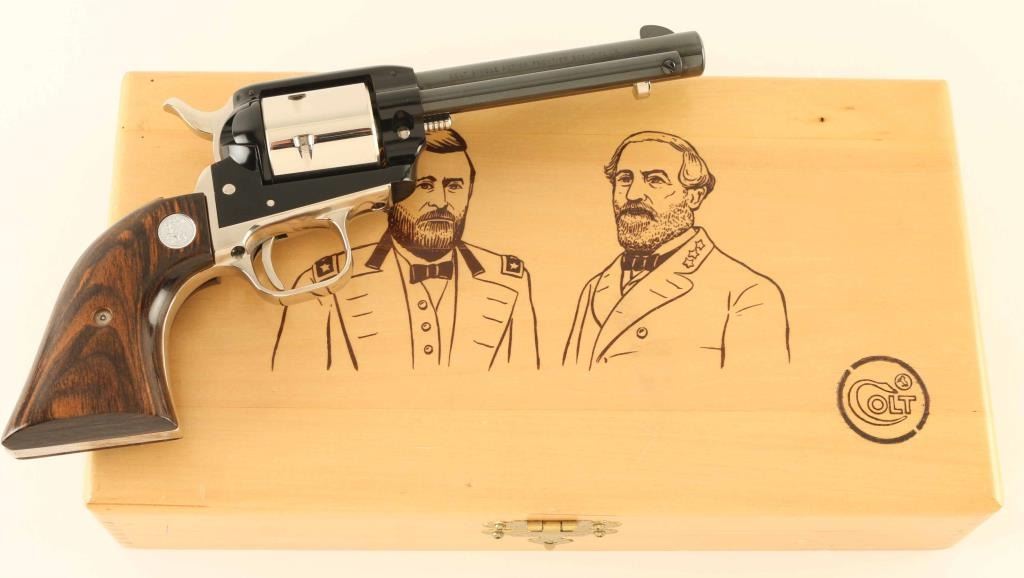 "Appomattox Commemorative" Small frame single-action revolver celebrating the 100 year anniversary of the end of the Civil War. Manufactured in 1965 with only 1,001 reported to have been produced. Features a blued, black & nickel plated finish, 4 3/4" barrel, ejector rod, blade front sight, square notched rear sight, non-fluted six shot cylinder, smooth trigger, knurled hammer spur, alloy frame, roll stamped engraved butt and two-piece smooth laminated wood grips with silver Colt medallions. Includes a factory wood presentation case with blue velvet lined interior and busts of Robert E. Lee & Ulysses S. Grant impressed into the top. Overall condition is like new with few signs of handling. Condition is like NRA Excellent - like new *** C&R Firearm ***