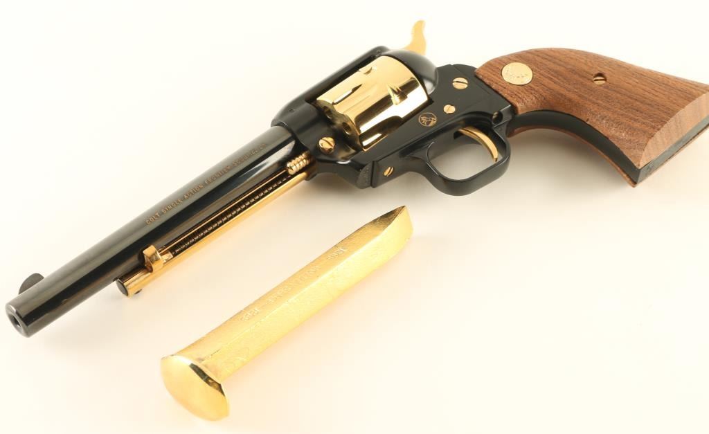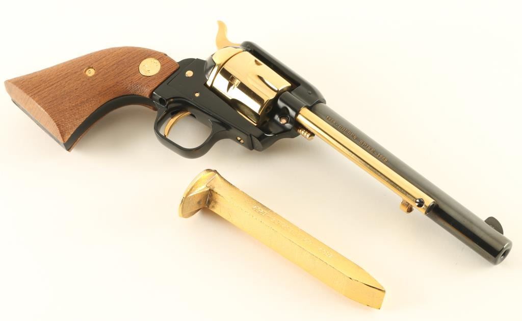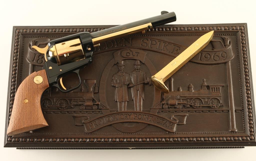 SN: 4501GS Cased commemorative rimfire revolver features two tone finish (blued with gold colored cylinder, loading gate, ejector rod housing, trigger, hammer, screws), slightly rough wood grips with gold color Colt medallions, 6" barrel, fixed sights. Overall condition is like new, with few signs of handling. Right side of barrel is marked "1869 - GOLDEN SPIKE - 1969". Bottom of grip frame is engraved with a scroll motif. Fancy faux walnut case features relief molding on top with "1869 GOLDEN SPIKE 1969", "COLT", "PROMONTORY POINT, UTAH", images of the train engines present at the event, and likenesses of the railroad company presidents. Inside the case, the revolver and a gold color plated miniature railroad spike are inlaid in dark green velvet; the lid has a cardboard inset (loose - needs to be re-glued) describing the driving of the last spike and an artist rendering of the railroad crews and meeting of the engines. Case is good condition with chip missing from lower right side of lid. Also includes a historical booklet about the event. Only 11,000 made. Condition is NRA Excellent *** C&R Firearm ***