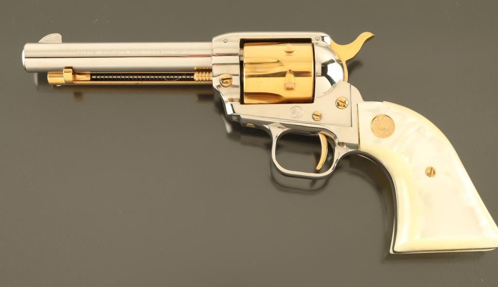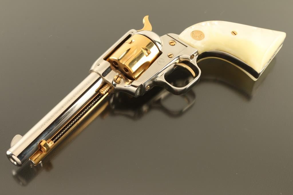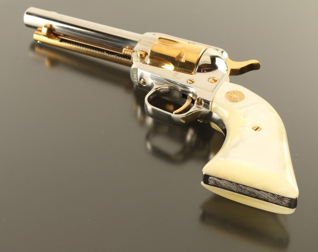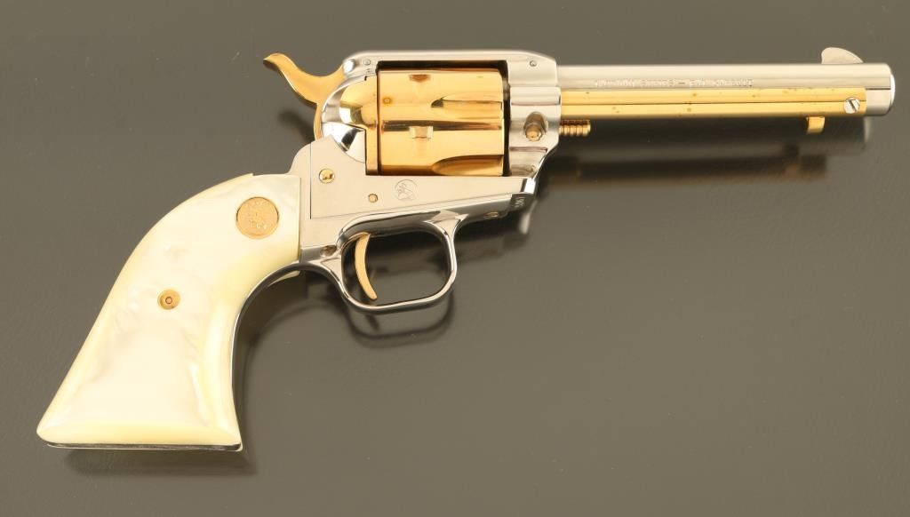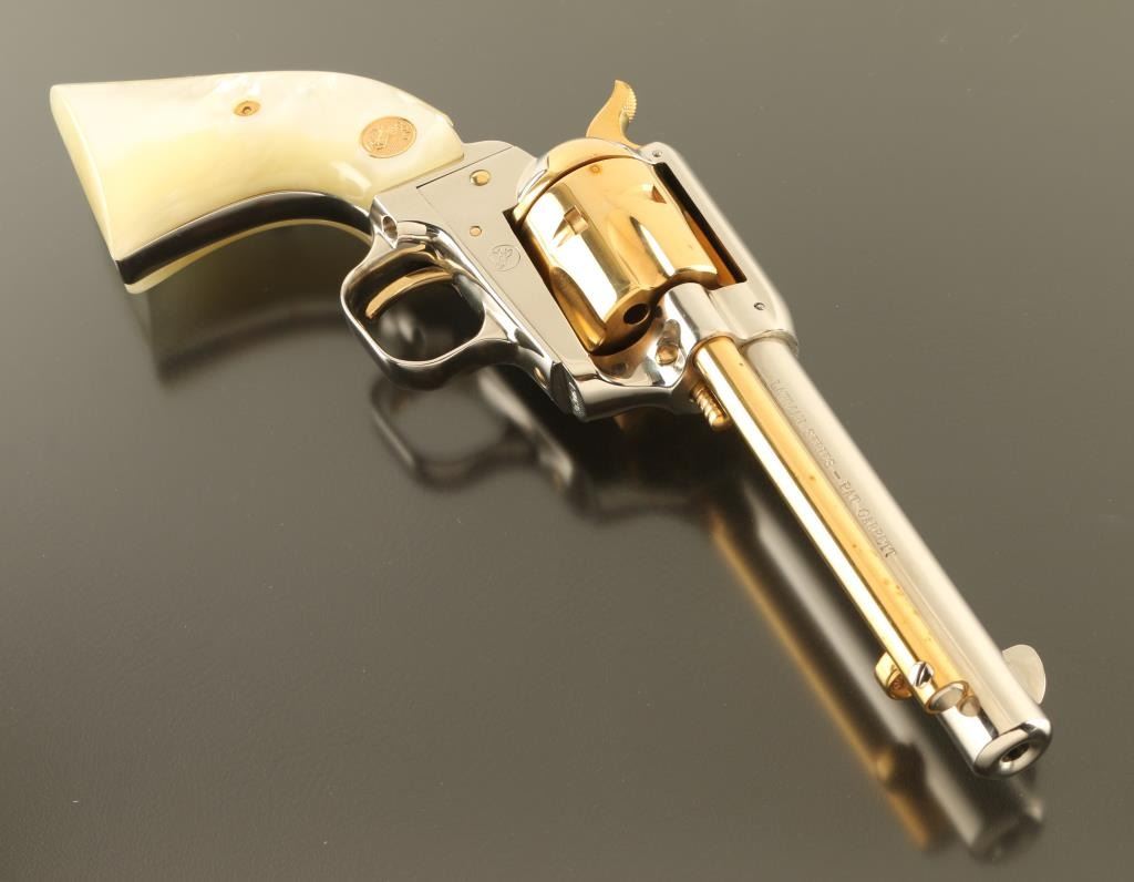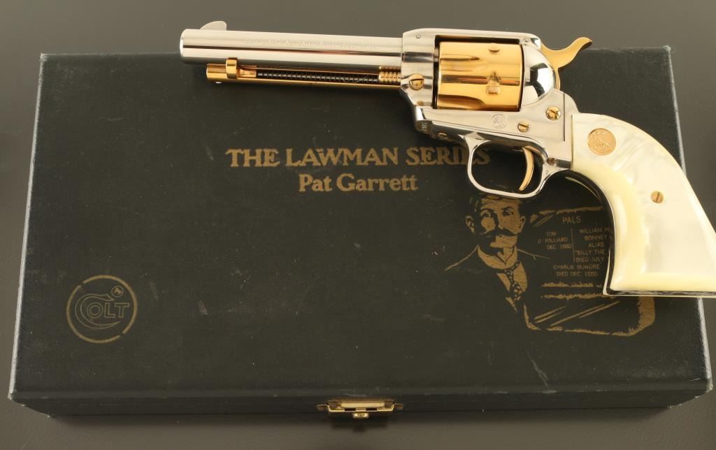 SN: 190PG Cased commemorative rimfire revolver features two tone finish (nickel plated with gold colored barrel & receiver), pearlescent composite grips with gold color Colt medallions, 4.75" barrel, fixed sights. Overall condition is like new, with few signs of handling. Right side of barrel is marked "LAWMAN SERIES - PAT GARRETT". Bottom of grip frame is engraved with a scroll motif. Case features black faux leatherette covered exterior, gold color felt inlay for revolver, locking hinged lid with gold color inner lining, lid top and inside are printed with Colt logo and entitled "THE LAWMAN SERIES / Pat Garrett". Manual, Colt biographical booklet about Pat Garrett are present in case under the inlay insert. Only 3000 made. Condition is NRA Excellent *** C&R Firearm ***