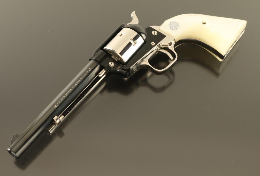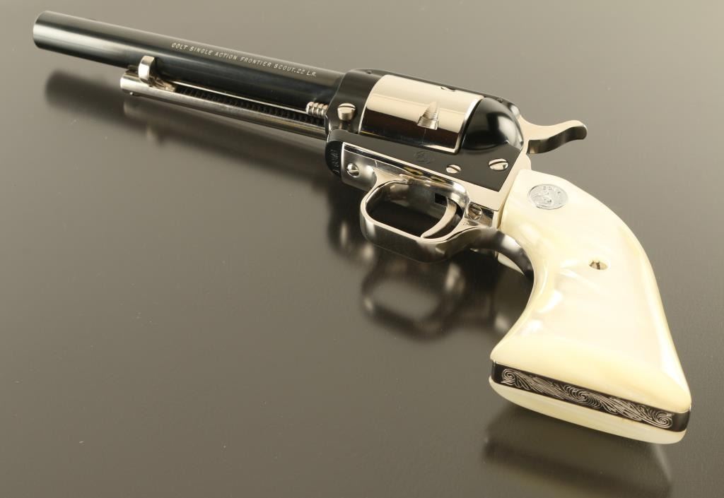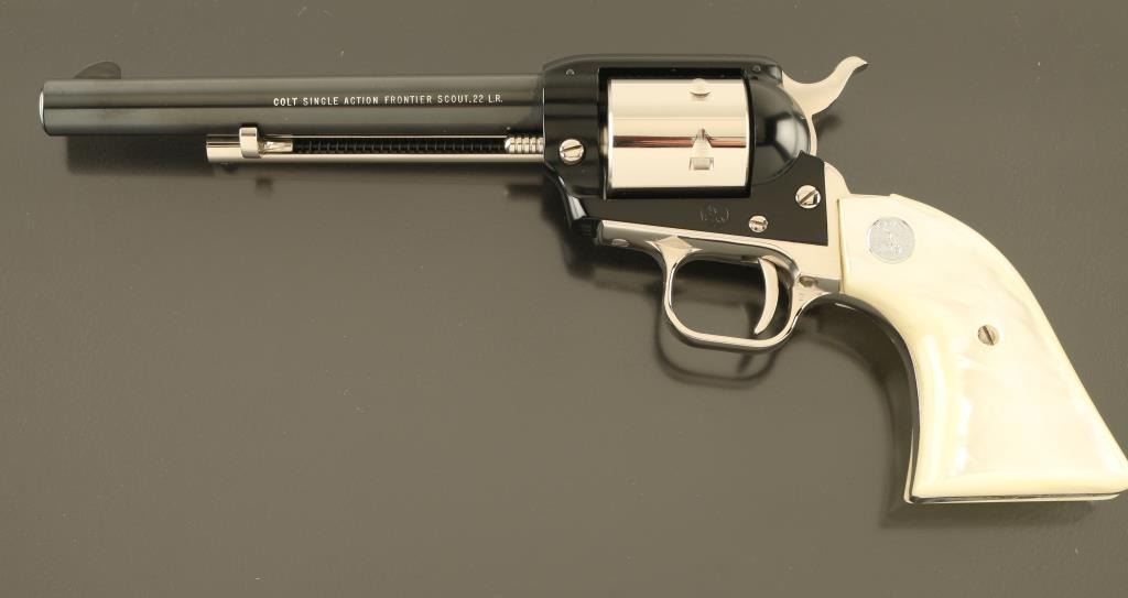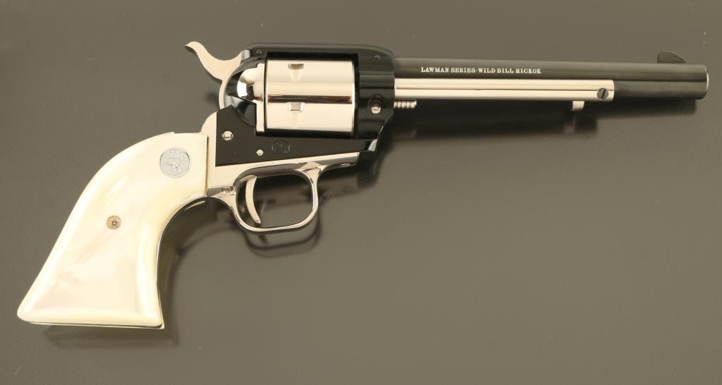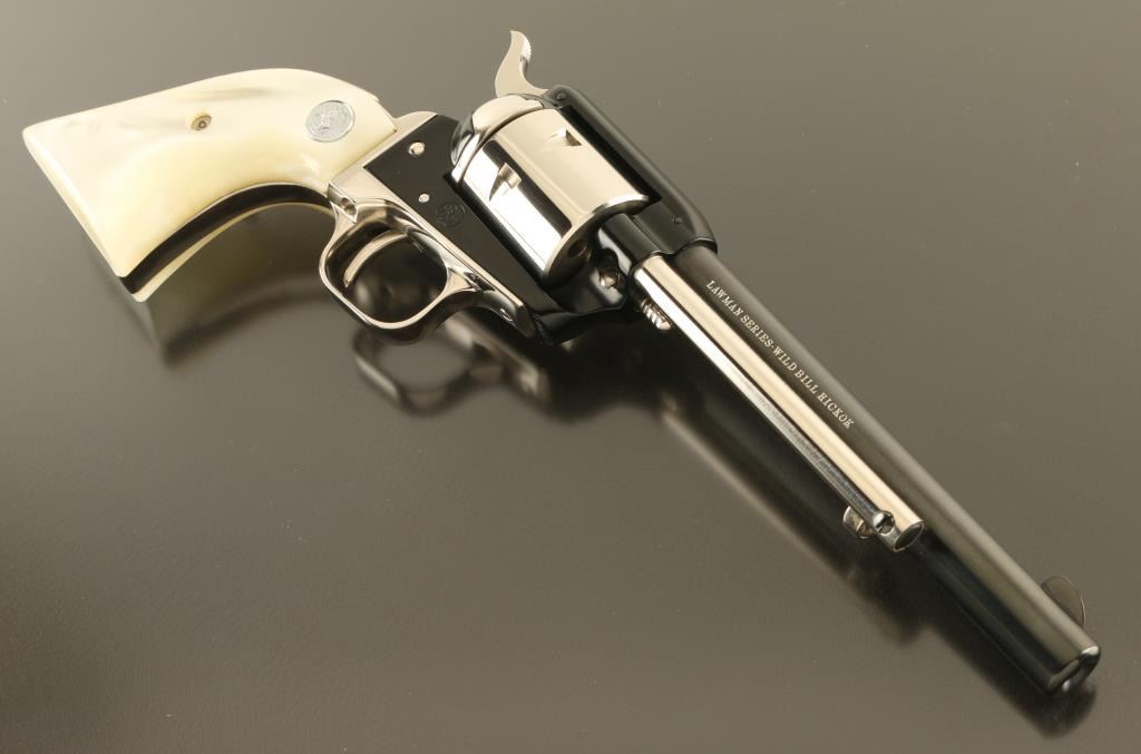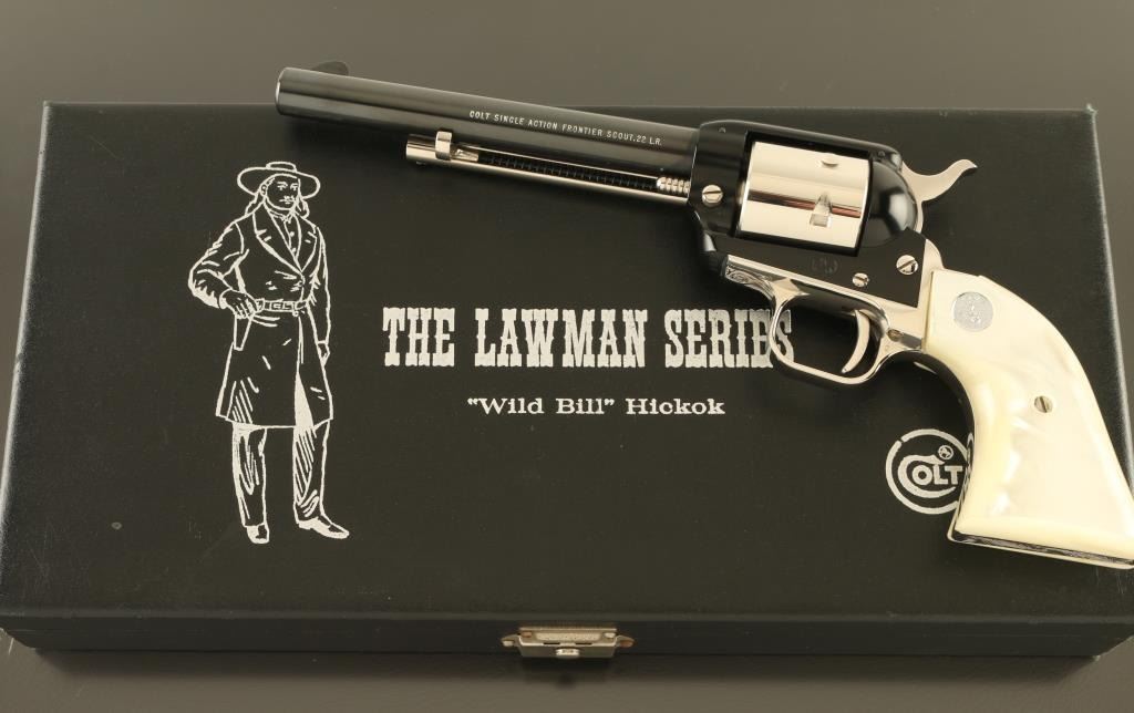 SN: 190WB Cased commemorative rimfire revolver features two tone finish (nickel plated with blued barrel & receiver), pearlescent composite grips with nickel Colt medallions, 6" barrel, unfluted cylinder, fixed sights. Overall condition is like new, with few signs of handling. Right side of barrel is marked "LAWMAN SERIES - WILD BILL HICKOK". Bottom of grip frame is engraved with a scroll motif. Case features black leatherette covered exterior, light blue felt inlay for revolver, locking hinged lid with white color inner lining, lid top and inside are printed with a likeness of Wild Bill Hickok, with Colt logo and entitled "THE LAWMAN SERIES / "Wild Bill" Hickok". Manual, factory advertisement, key for case are present in case under the inlay insert. Only 3000 made. Condition is NRA Excellent *** C&R Firearm ***