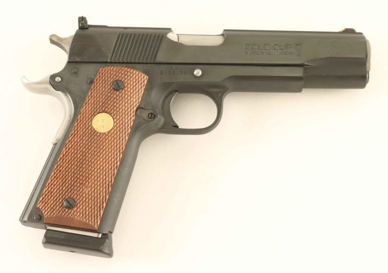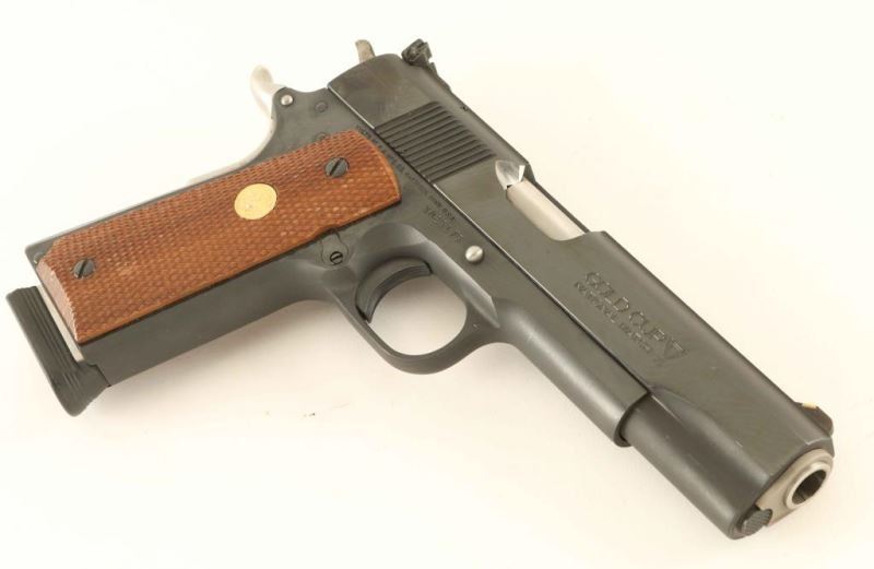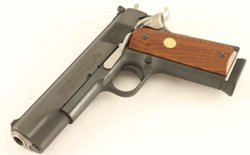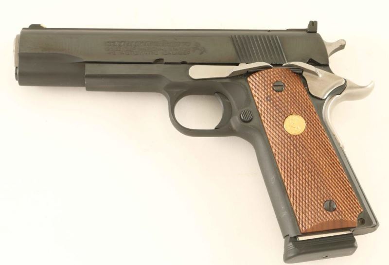 Single action semi-automatic target pistol comprised of a desirable MK IV Series 70 National Match slide and 1979 vintage Service Model Ace frame as indicated by the serial number. Features a blued finish, 5" Bar-Sto barrel, ramp front sight with white insert, adjustable rear sight with white outline, serrated trigger, serrated hammer spur, stainless thumb safety, upswept beavertail grip safety, push button magazine release, 8 round magazine, serrated flat mainspring housing and two-piece checkered walnut grips with gold Colt medallions. Pistol exhibits approximately 97% of it's factory blued finishes showing minor handling marks and a small amount of rust in the mainspring housing serrations. Action is strong, bore appears excellent but dirty and the wood grips are fine. Condition is near NRA Excellent as modified. ***Modern Firearm***
