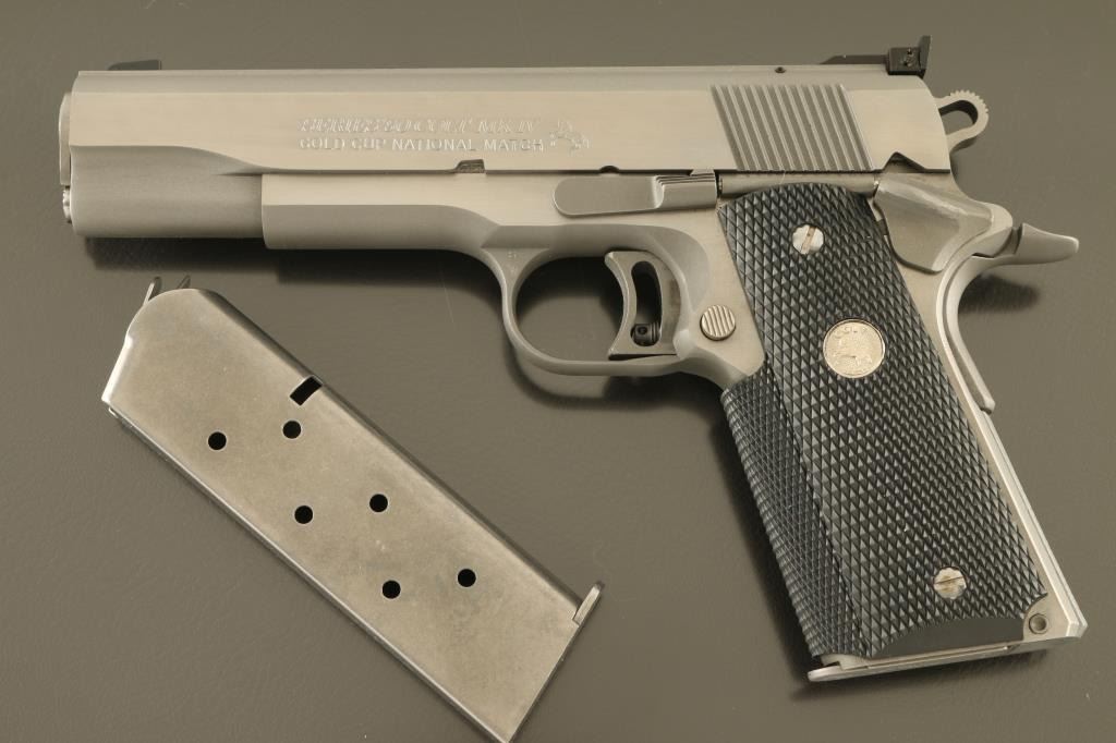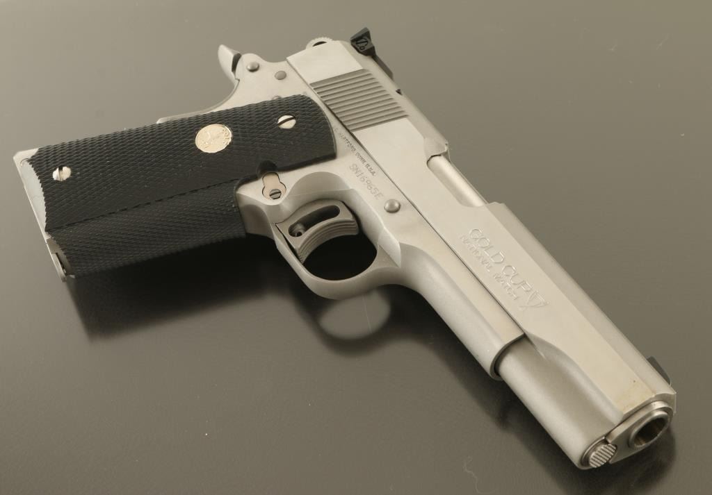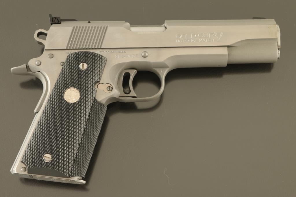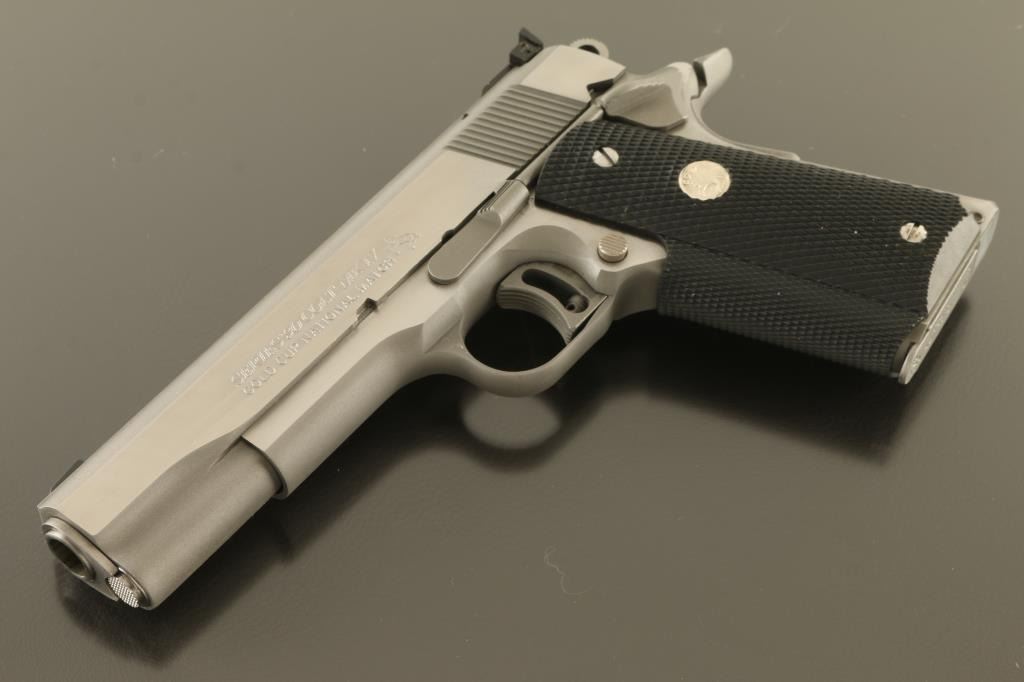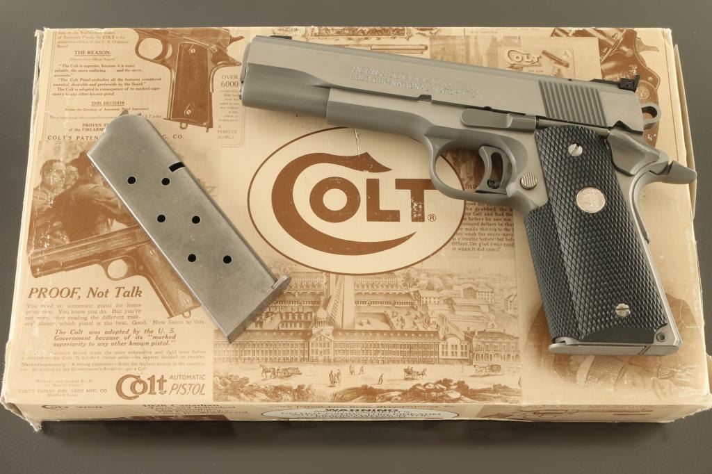 SN: SN16965E 'Series '80 MK IV' Semiautomatic pistol features stainless steel construction, wrap around checkered black rubber grips with nickel colt medallions, adjustable sights, manual safety, grip safety, single action trigger, push button magazine release. Overall condition is like new with few signs of handling. Includes (2) magazines, replacement green colored recoil spring with lighter spring weight for target ammunition, manual, factory paperwork, blue color hard plastic Colt carry case. Condition is NRA Excellent - like new *** Modern Firearm ***