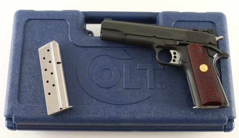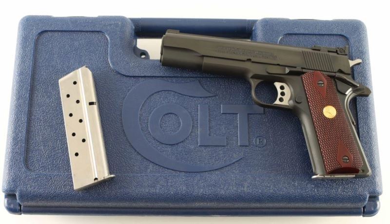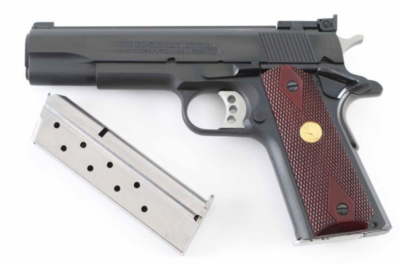'MK IV/Series 70' Desirable 1911A1 pattern single action semi-automatic target pistol. Features a matte blued finish with polished flats, 5" N.M. barrel, patridge front sight, fully-adjustable rear sight, serrated trigger with overtravel adjustment, serrated hammer spur, manual safety on the left side of the frame, grip safety, push button magazine release, factory 7 round magazine, steel frame with serrated front strap, serrated flat mainspring housing and checkered walnut grips w/ gold Colt medallions. Bore is excellent. Overall condition is like new. Includes factory hard plastic case, manual, spare magazine. Condition is NRA Perfect - like new *** Modern Firearm ***