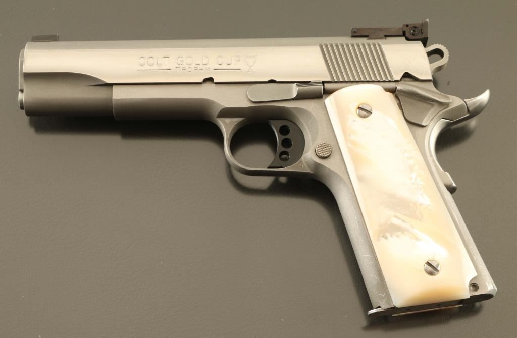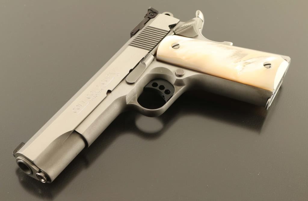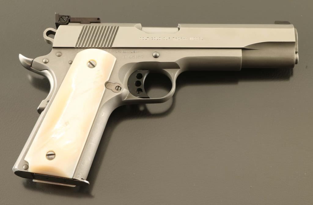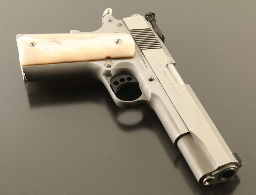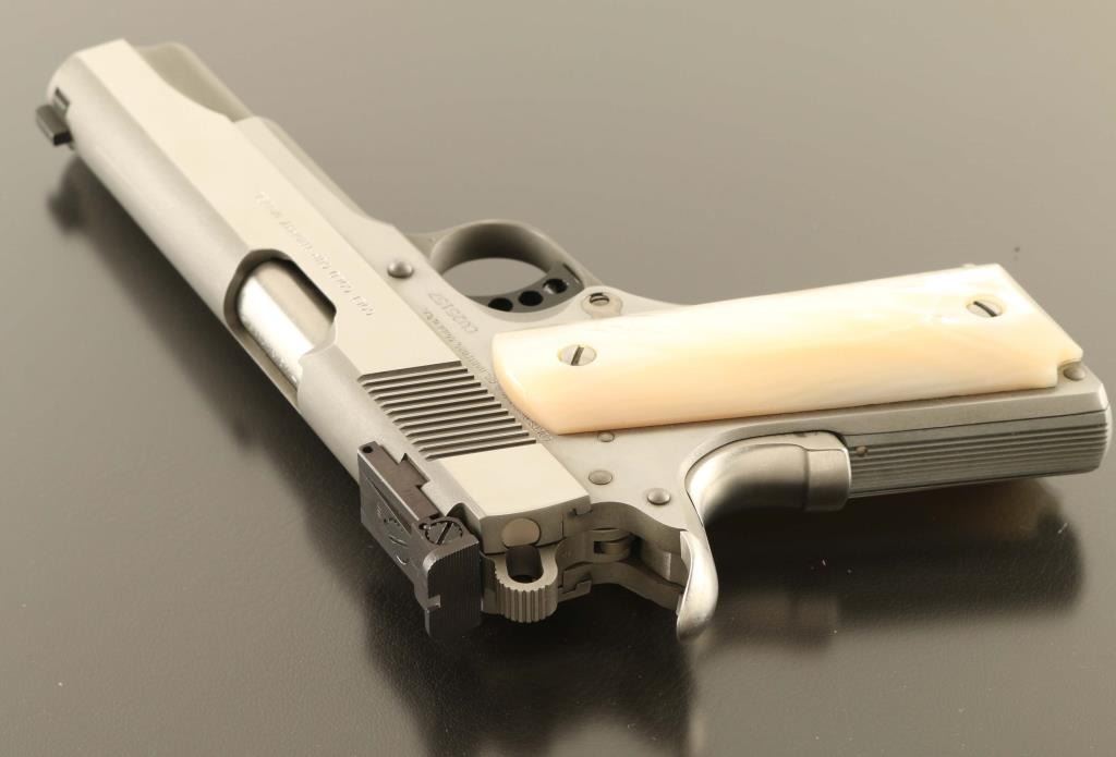 Stainless steel 1911A1 pattern single action semi-automatic target pistol chambered in .45 Auto, manufactured in Hartford, CT circa 2006. Features a matte finish with satin finished frame flats & bright polished slide flats, 5" N.M. barrel, dovetailed patridge front sight, full-adjustable Colt branded rear sight, serrated trigger adjustable for overtravel, skeletonized hammer, manual safety on the left side of the frame, upswept grip safety with memory bump, push button magazine release, 8 round magazine, serrated flat mainspring housing and genuine mother-of-pearl grips. Pistol exhibits light handling marks/superficial scratches with no major wear observed. Action is smooth, the bore is pristine and the mother-of-pearl grips are near fine showing some non- detrimental cracks in the left panel. This pistol was the former property of Pete at Little John's and he purportedly put an extra $3,500.00 in having it accurized. Condition is NRA Excellent. ***Modern Firearm***