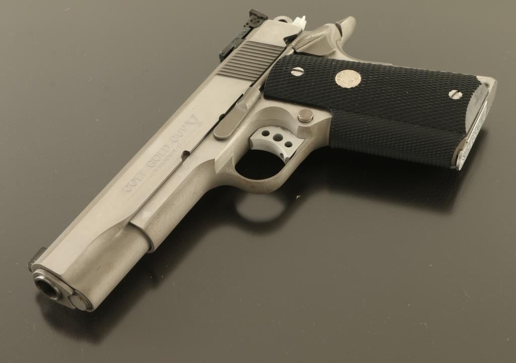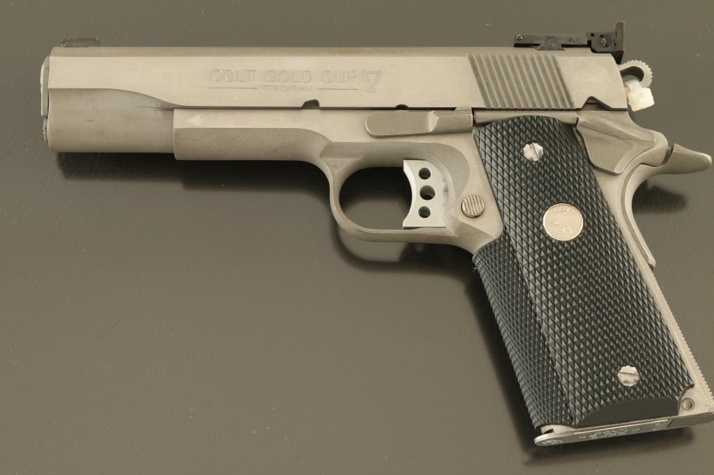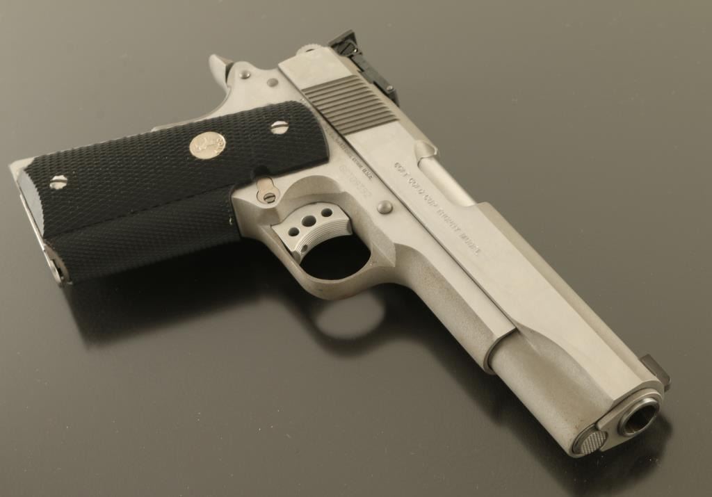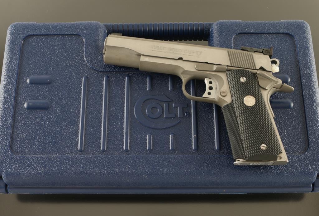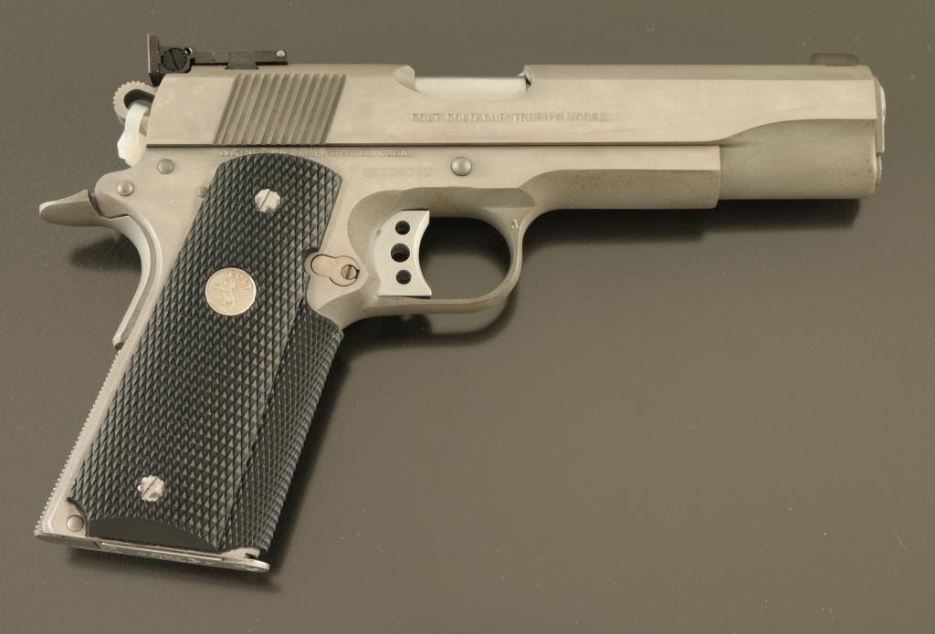 Semiautomatic Target pistol features stainless steel construction, checkered black rubber wrap-around grips with Colt medallions, 5" barrel, adjustable target sights, manual safety, grip safety. Bore is excellent. Overall external appearance is like new with few small signs of handling. Includes (1) magazine, bushing wrench, cleaning rod, manual, Colt hard plastic case. Condition is NRA Excellent - like new *** Modern Firearm ***