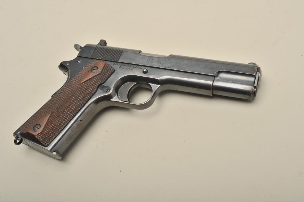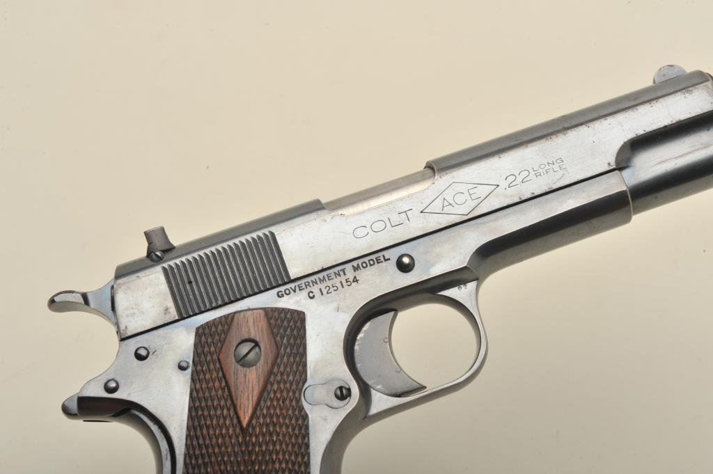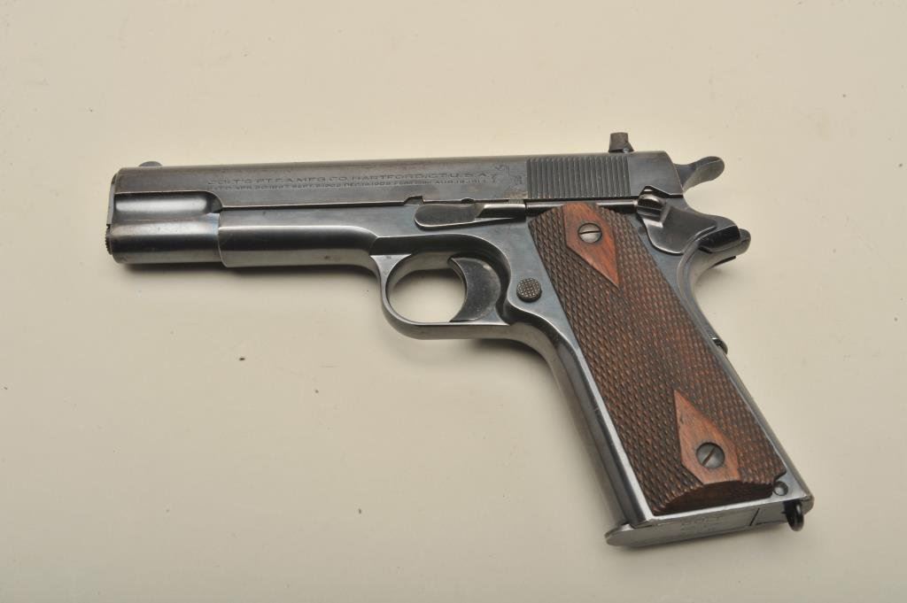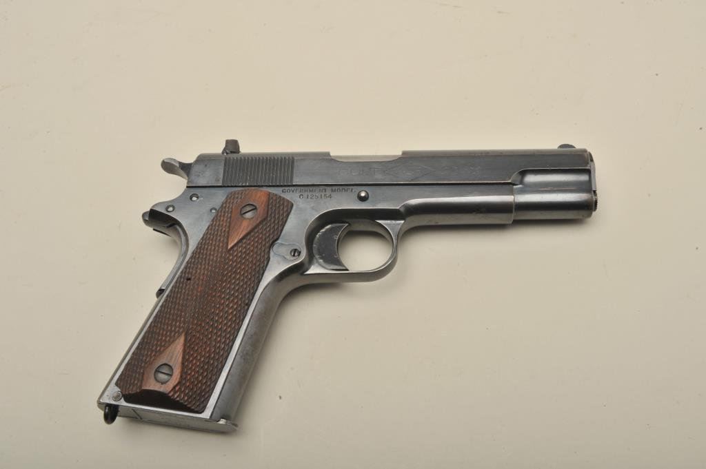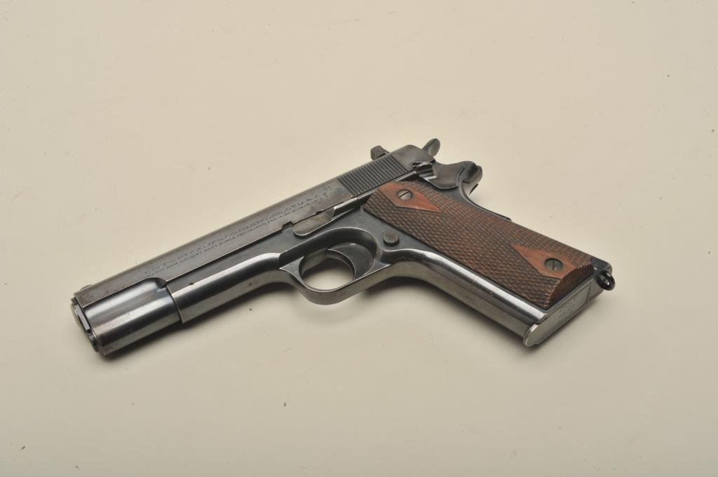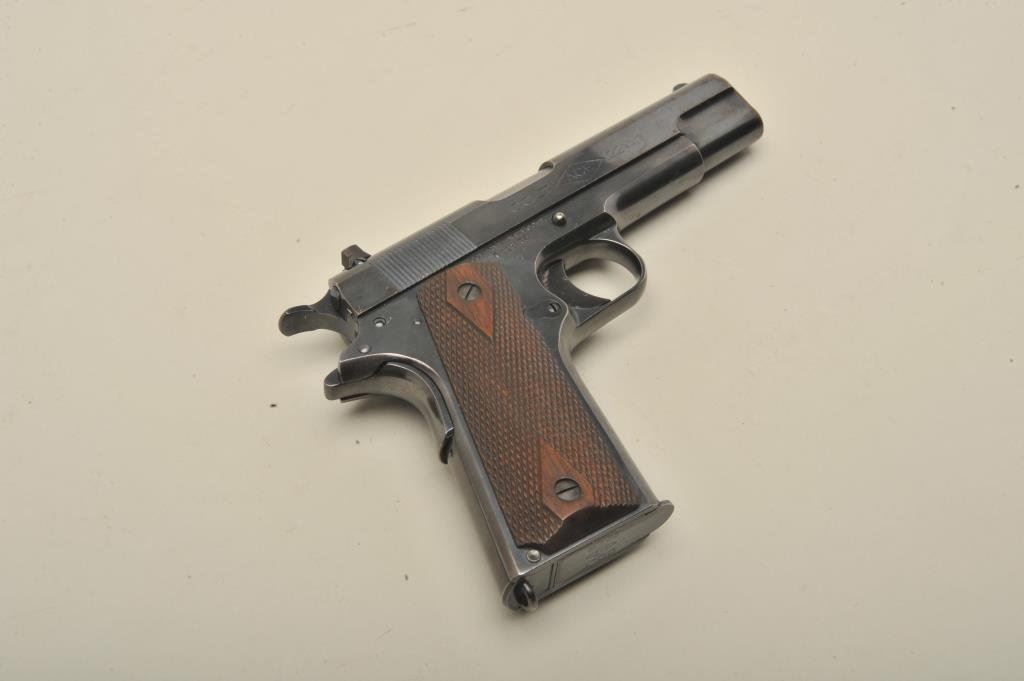 slide, 5” barrel, blued finish, checkered wood grips, two tone magazine, S/N C125154, in overall very good to near fine as “married”; majority of original finish, fine bore, crisp action, sharp markings and very good to fine grips. (C&R/PPT). Est.: $1,500-$3,000.
