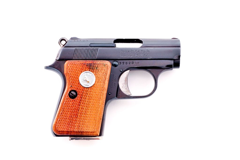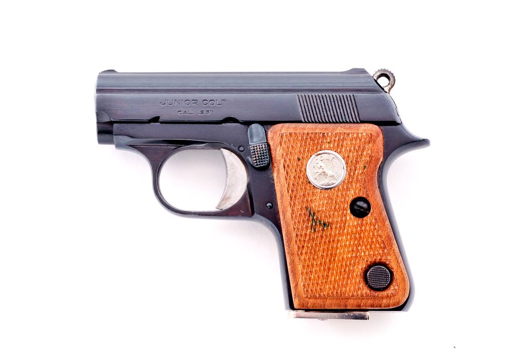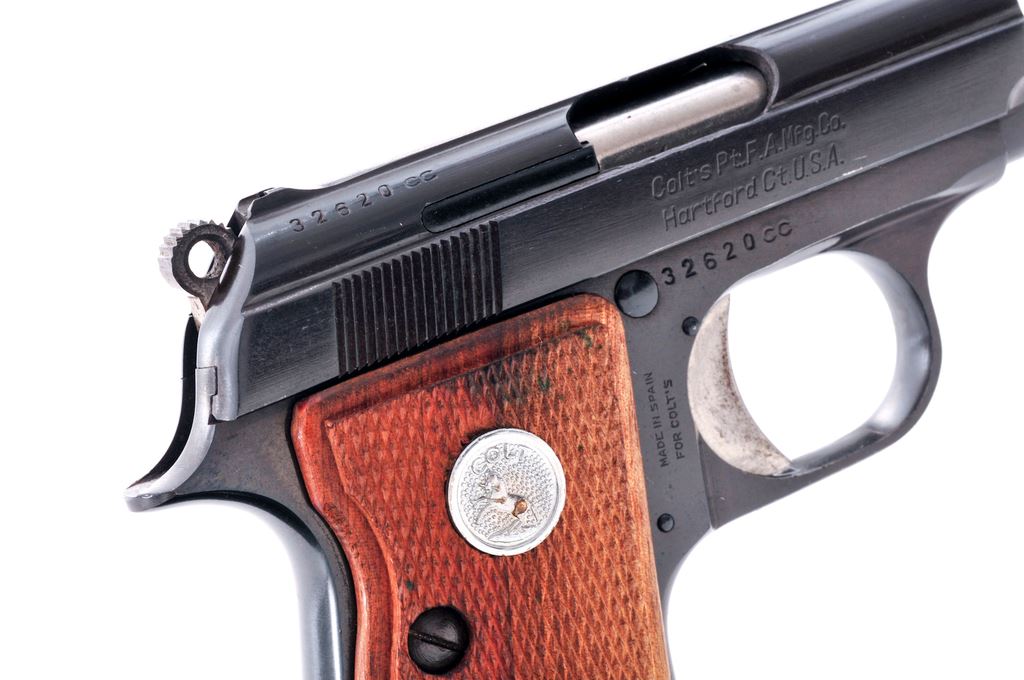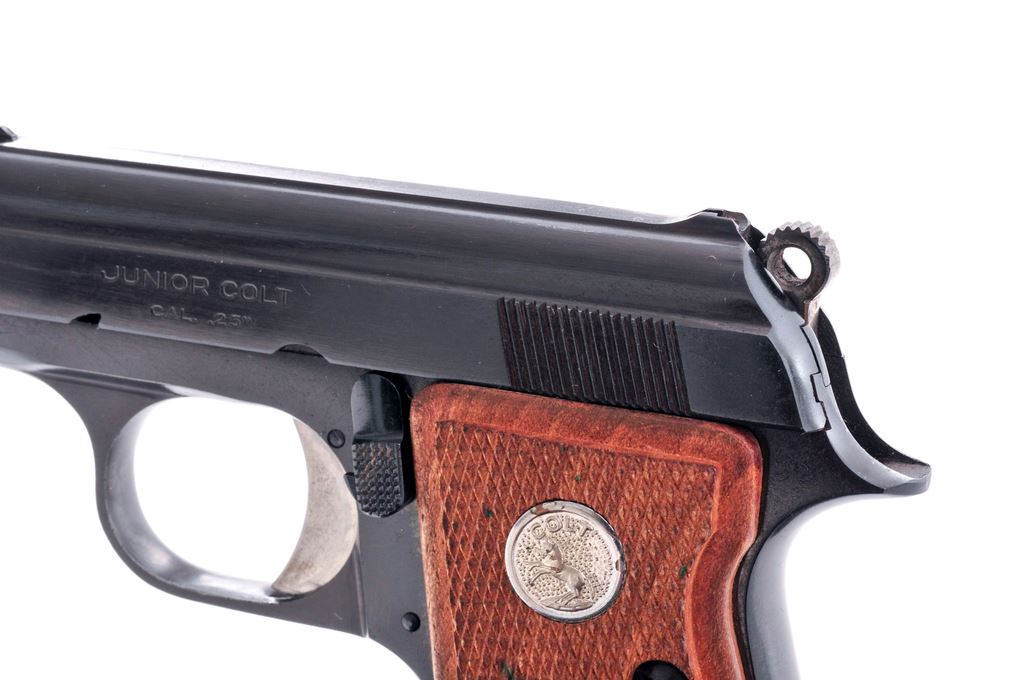 Colt Junior Semi-Automatic Pocket Pistol, #32620CC, .25 ACP cal., 2.25'' barrel, blue finish, checkered walnut grips with silver Colt medallions, standard fixed sights, with one ''Colt'' marked magazine. Mfg'd in Spain by Astra. Frame and slide with visible matching numbers. Condition is very good with approx. 97% original blue. Frame and slide with scattered fine handling marks. Grips with sharp checkering, bright medallions, and a few small spots of darkening to the wood. Action is smooth with an excellent bore. Est.: $200-$350. (C&R/PPT)