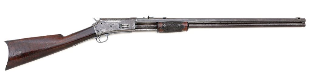 serial #6003, 45-85, 28" octagon barrel with a very good bore being relatively bright and with strong rifling its entire length. This is a nice honest example of Colt's largest slide action repeater. The barrel shows a nice clean address with the caliber designation being "45-85-285", all remaining clean and fully legible. The metal surfaces of the rifle bear a mostly even gray brown patina overall with some scattered fine pitting here or there along with some scattered patches of oxidation staining. The Rampant Colt on the left side of the frame is a little light but remains fully visible. The plain walnut buttstock and checkered two-piece forend rate very good plus with a good deal of original finish remaining, strong checkering and nice raised grain feel on the surface. The stocks fit beautifully and have never been sanded or refinished. The stock screw is a replacement but looks period. The rifle is sighted with a German silver blade Rocky Mountain front and a semi-flattop rear which seems a bit later. This rifle shows use but was well-cared-for and remains in very honest and almost untouched condition. (1B11625-4) {ANTIQUE} (3000/5000)