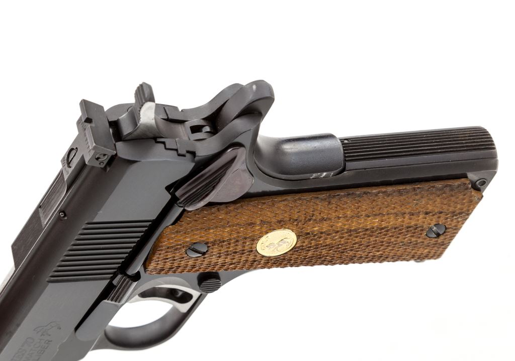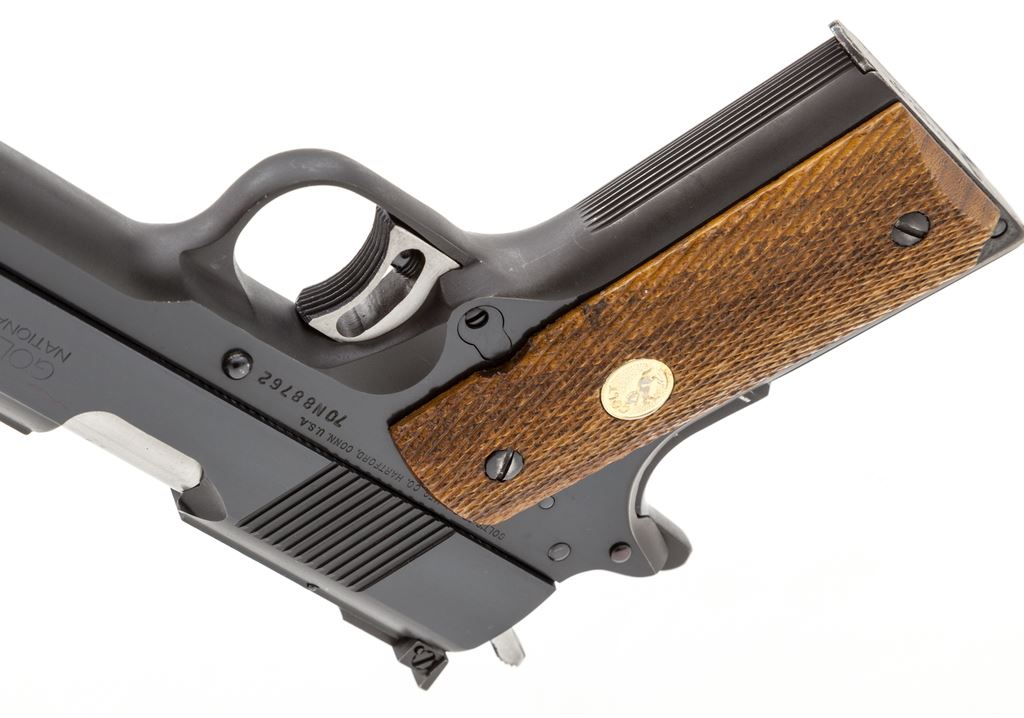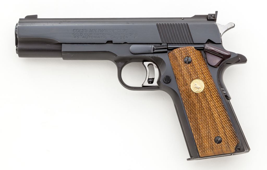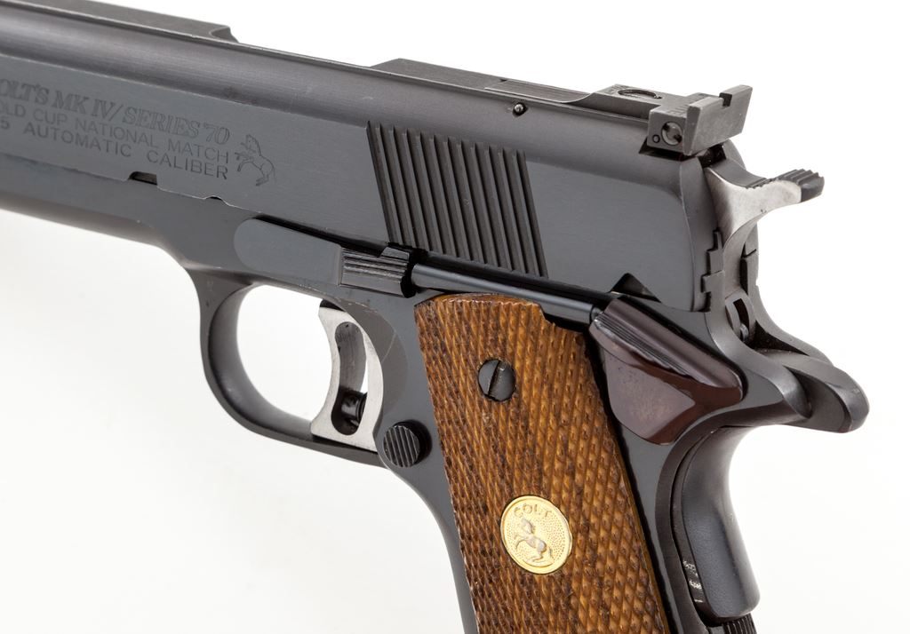 Colt MK IV Series 70 Gold Cup National Match Semi-Automatic Pistol, #70N88762, .45 ACP cal., 5'' barrel, blue finish, checkered walnut grips with gold Colt medallions, lightweight trigger, fixed front sight, Elliason fully adjustable rear sight, with two (2) magazines; one blue Colt marked magazine and a second factory magazine with matte stainless bottom. Barrel bushing, slide stop and safety with a high polished blue finish; safety with moderate plum-colored toning. Right side of triggerguard is stamped ''Z''. In black plastic MTM case. Mfg'd 1980. Condition is near excellent with approx. 97% blue. Grip safety shows some thinning and tiny specks of freckling; left side near the slide stop with a shallow arch and small surface nicks. Matte edges of slide with a few small spots of slight darkening. Grips are excellent with bright medallions. Action is smooth and tight with a mirror bright bore. Est.: $900-$1,400. (C&R/PPT)