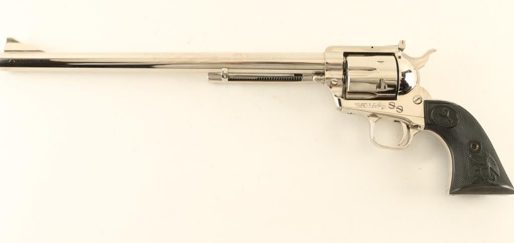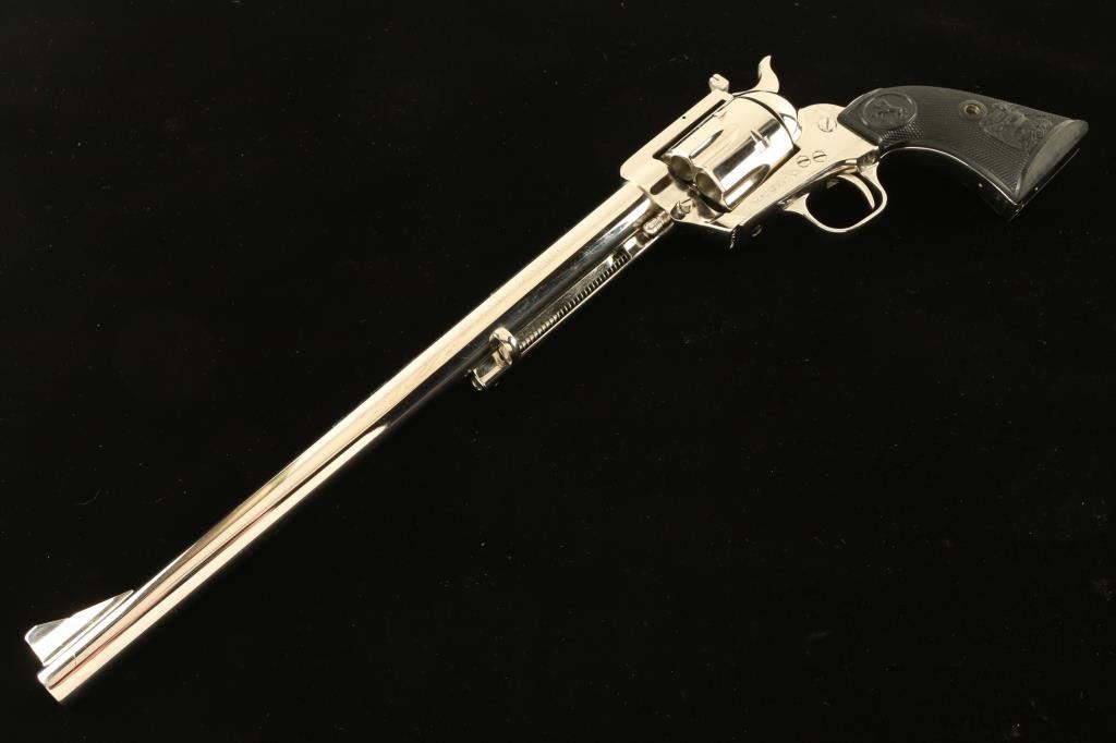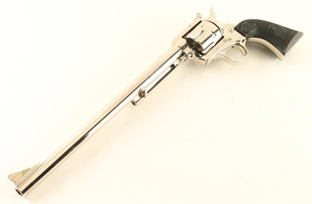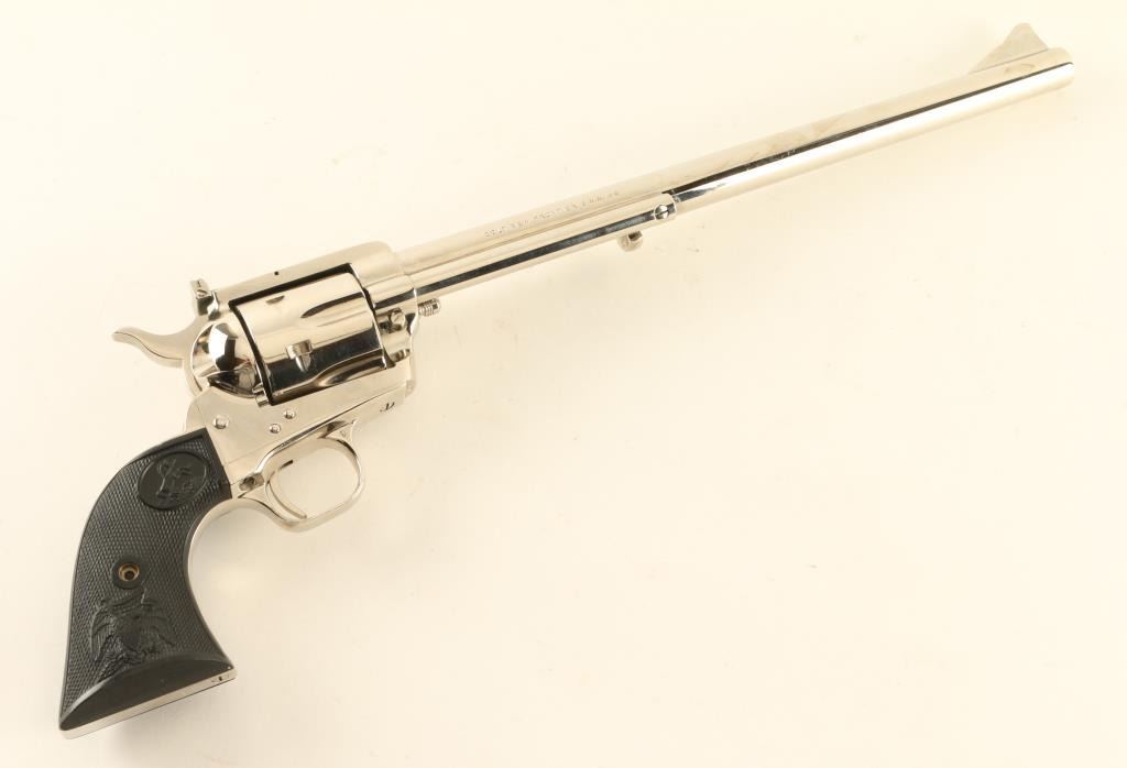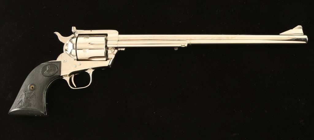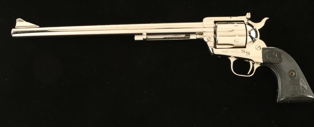 'Ned Buntline Commemorative' Single Action revolver manufactured circa 1979, with only 3000 produced. Features 12" barrel, adjustable sights, nickel finish, checkered black plastic grips with embossed Rampant Colt and Eagle. Left side of barrel is marked "NED BUNTLINE COMMEMORATIVE". Bore is excellent. Nickel finish is overall very good, full coverage without cracking or peeling, some cloudiness visible on sides of barrel, few small scuffs on frame and cylinder. Grips are excellent. Condition is Very Good ++ *** C&R Firearm ***