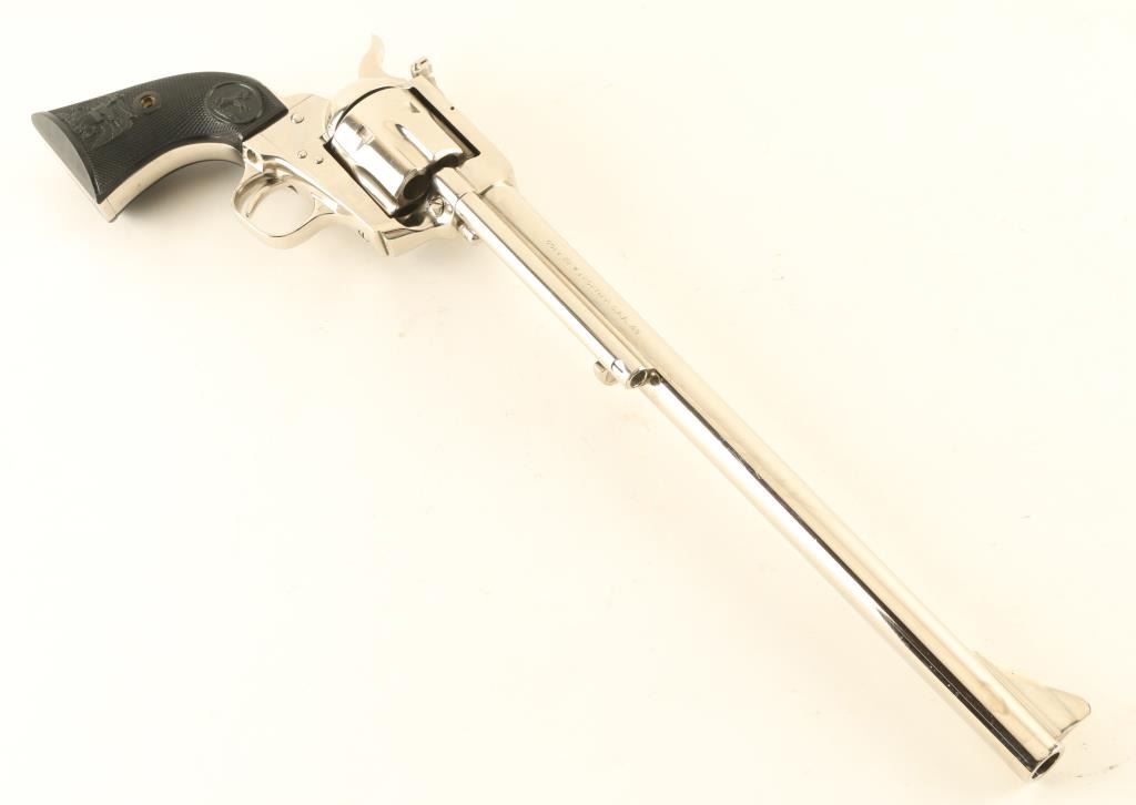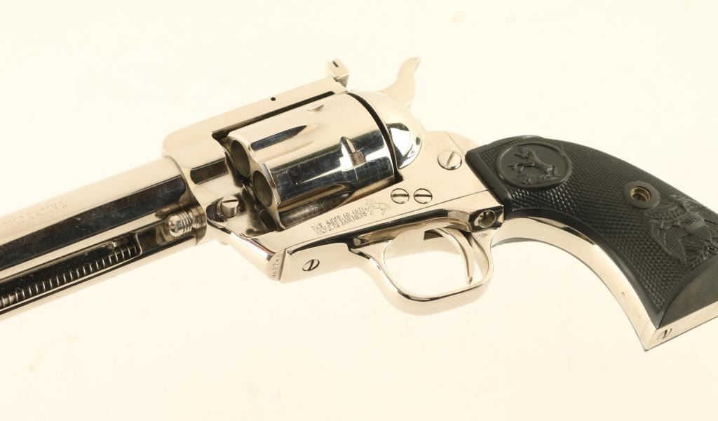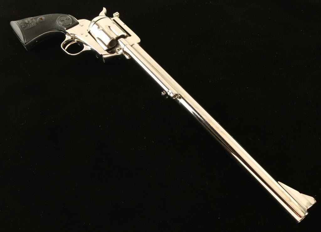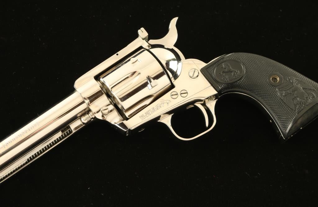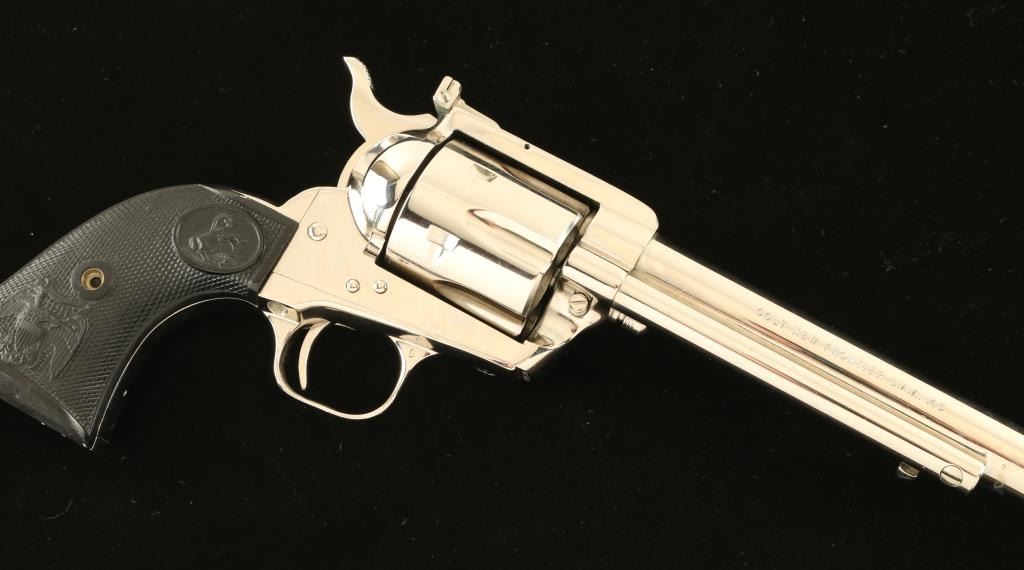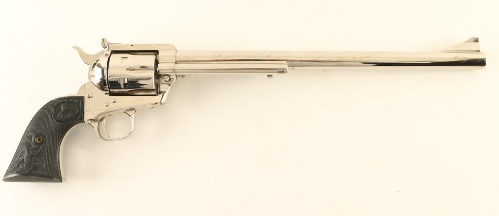 'Ned Buntline Commemorative' Single Action revolver manufactured circa 1979, with only 3000 produced. Features 12" barrel, adjustable sights, nickel finish, checkered black plastic grips with embossed Rampant Colt and Eagle. Left side of barrel is marked "NED BUNTLINE COMMEMORATIVE". Bore is excellent. Nickel finish is overall very good, full coverage without cracking or peeling, some cloudiness visible on sides of barrel, few small scuffs on frame and cylinder. Grips are excellent. Condition is Very Good ++ *** C&R Firearm ***