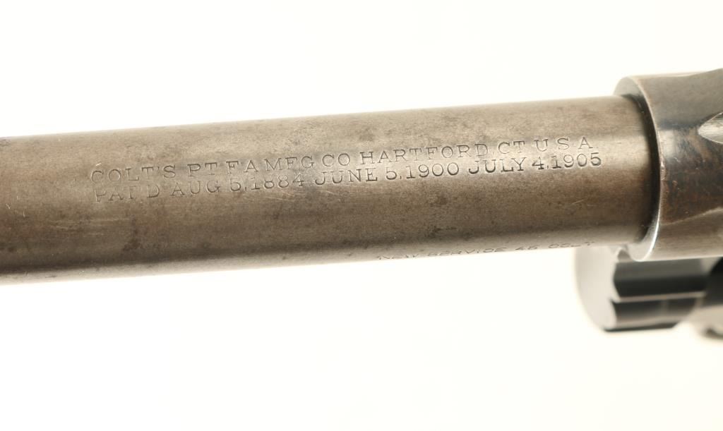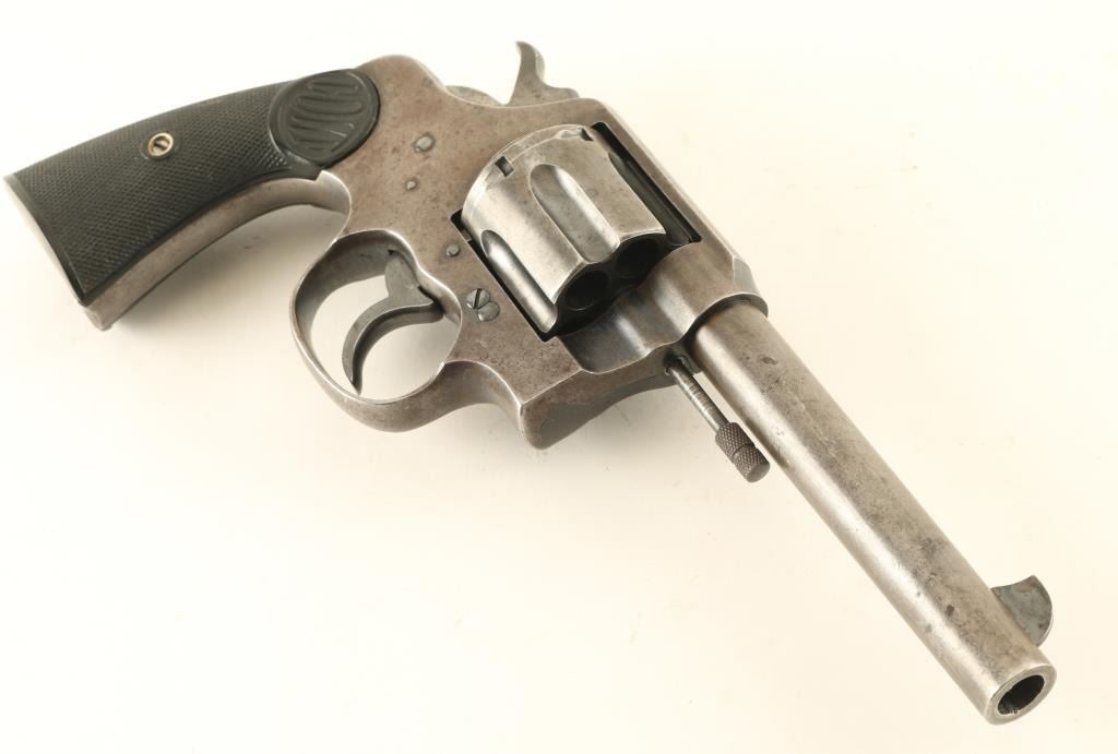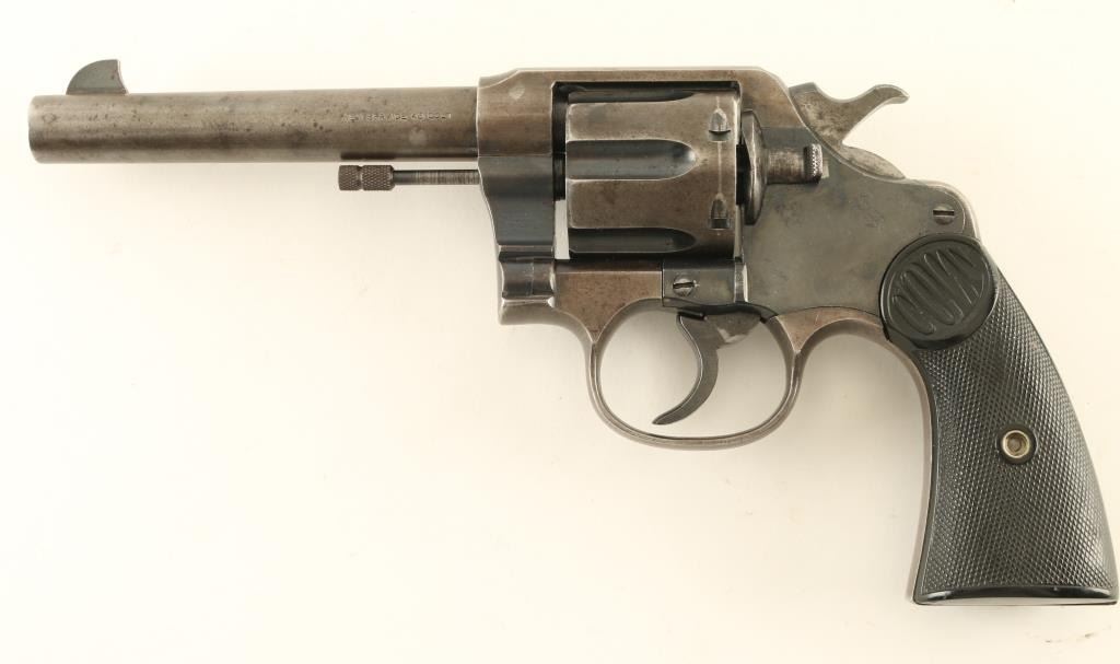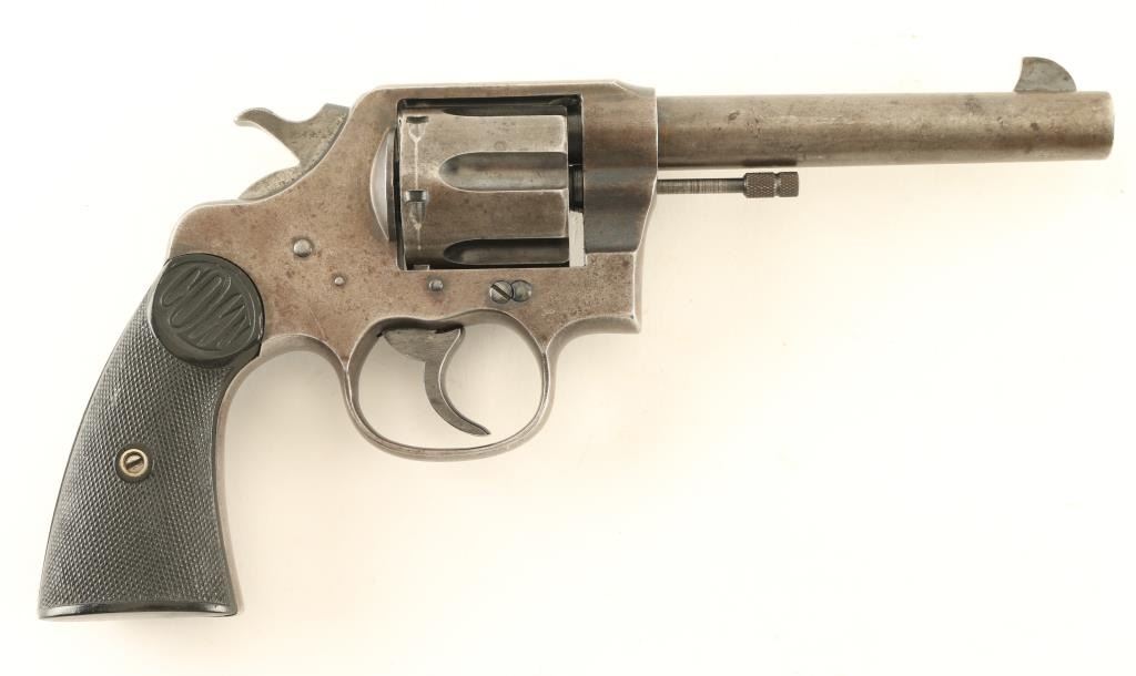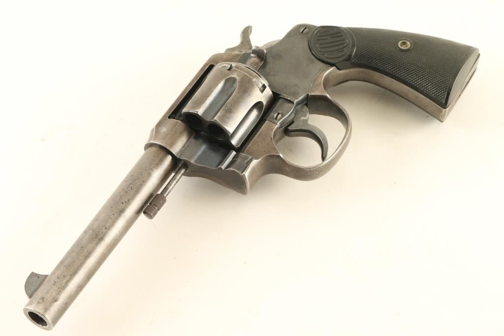 Revolver. 6-Shot Capacity. Large frame revolver produced 1898-1946. This one manufactured in 1933. 5.5" barrel, with fixed front, and notch rear sights. Two line address on barrel. "New Service 45 Colt" on side of barrel . Rampant colt on left frame. Bore appears very good/bright. Checkered hard rubber grips with "Colt" on them. All markings are clear. Action is crisp/tight, and cylinder indexes properly. Grips are very good. Blued metal finish is about 40%, in recessed areas, and the left side frame. NRA Condition-Good. C&R Firearm.