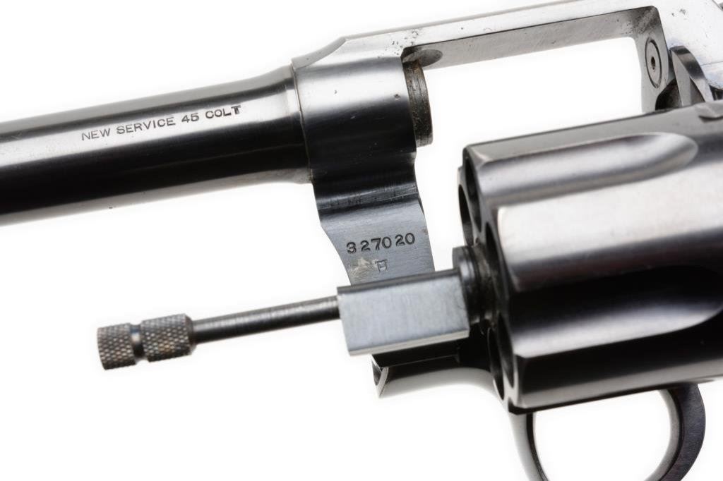 **Colt New Service DA revolver, .45 caliber, 7.5” barrel, S/N 327020, blued finish, checkered wood Colt medallion grips in overall excellent condition with fine bore, crisp action and sharp markings; fine grips. Accompanied by factory cardboard box and Colt factory letter confirming features including stocks; shipped to J.B. Varick Co., Pleasant St. Pharmacy, Concord, NH on April 30, 1928, one gun in shipment. Est.: $2,000-$4,000.