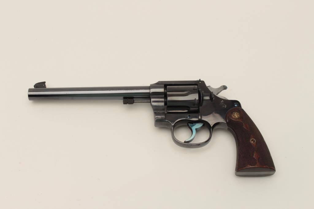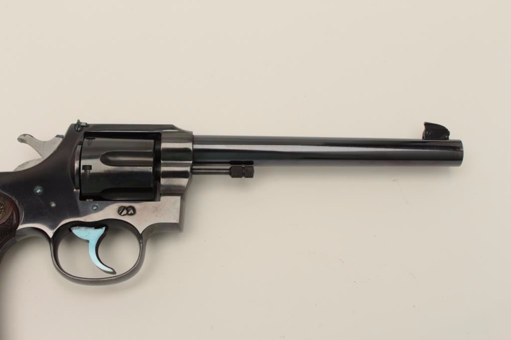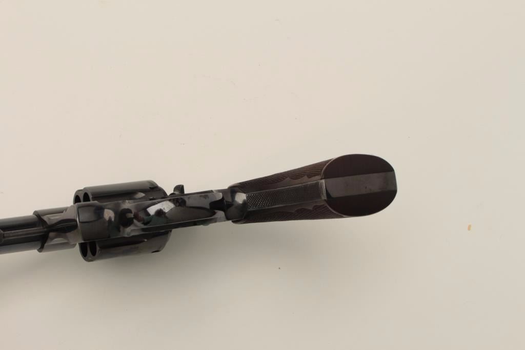 Colt New Service Target revolver, .44 Russian and .44 S&W Special caliber, Serial #59496. The pistol is in excellent overall condition with a 7 ½” barrel. The pistol retains approximately 98% of its original factoryblue with light handling and storage marks. The trigger, exterior screw heads and back of the hammer show bright nitre blue finish, while the Rampant Colt emblem is clear and crisp on the left side of the frame. Boththe front and back strap are hand checkered. The checkered wood inset gold medallion grips are in fine condition with sharp checkering and light handling marks. The bore is very good, the action crisp andmarkings are sharp. According to the consignor’s notes, the pistol was shipped on December 2, 1913 to Phil Bekeart Co., San Francisco, California. According to Colt New Service Revolvers by Bob Murphy, onlyapproximately 5% of the New Service Improved Model were manufactured in the .44 Russian caliber, the number produced with the 7 ½” barrel was significantly less, from the Gil Newton Collection. Est.: $2,500-$5,000.