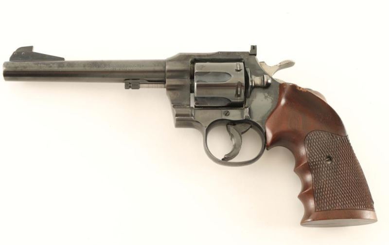 Vintage large frame double action target revolver chambered in .38 Special, circa 1957. Features a blued finish, 6" barrel, ramped patridge front sight, adjustable rear sight, non-shrouded ejector rod, fluted six-shot cylinder, serrated trigger with wide trigger shoe installed, knurled hammer spur, flat-top frame and custom two-piece checkered walnut target grips. Revolver exhibits approximately 90% of it's original finish showing heavy gun powder residue on the cylinder & frame, muzzle & handling wear, and some scattered light surface rust(mostly on the top of the gun.) Action is super smooth with a tight lock-up, bore is very good+ and the wood stocks are good showing a chip on the thumb rest. Condition is NRA good to very good. ***C&R Firearm***