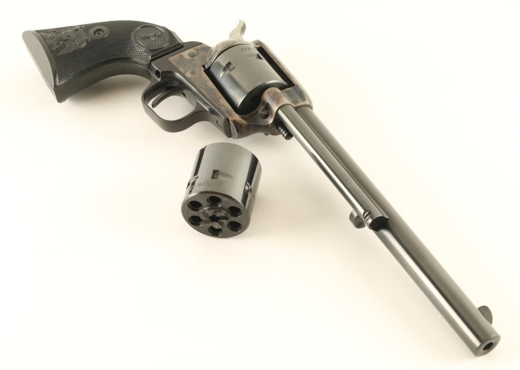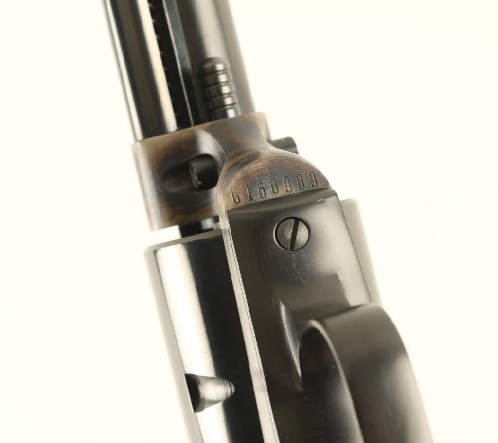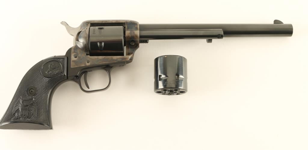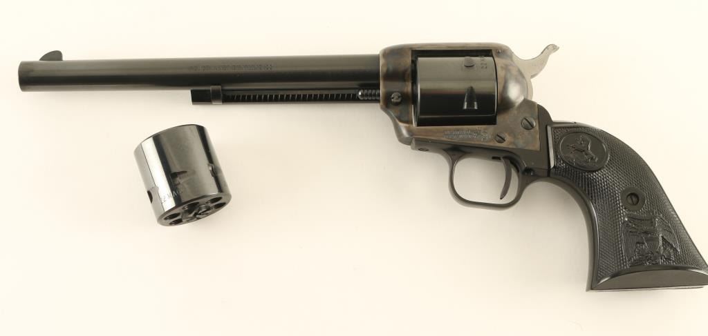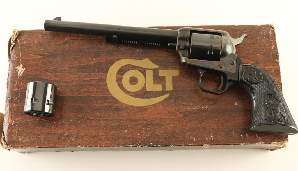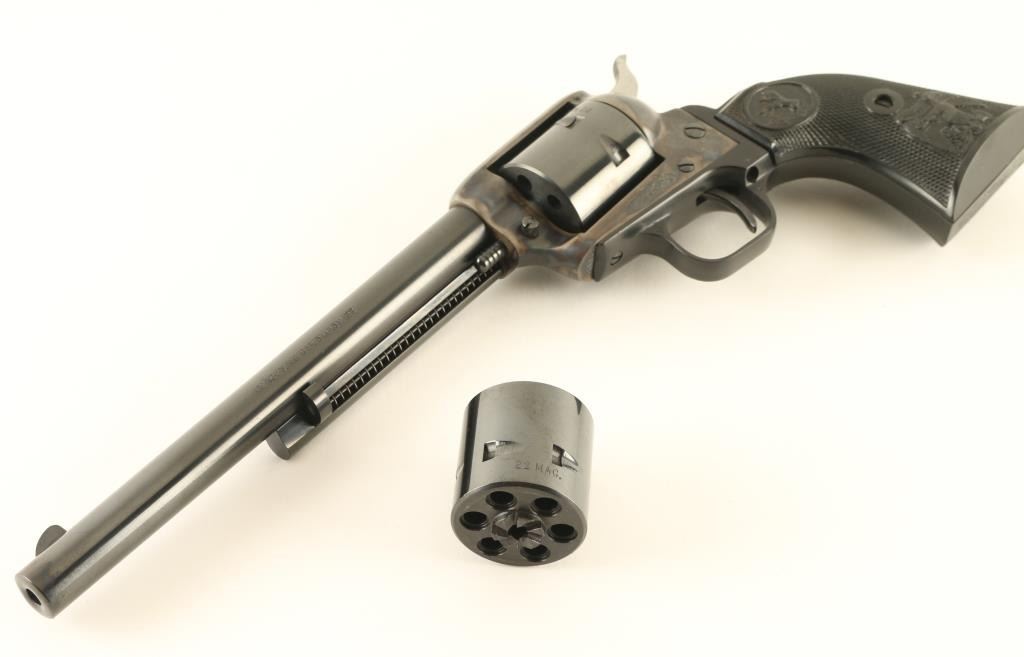 Single action rimfire revolver features blued finish, case colored receiver, black plastic grips with Rampant Colt logo and embossed eagle, 7.5" barrel, unfluted cylinder, fixed sights. Overall condition is like new. Left side of barrel is marked "PEACEMAKER BUNTLINE 22". Includes Colt styrofoam/cardboard box in fair condition, extra 22 Mag cylinder. Condition is NRA Excellent - Like New *** Modern Firearm ***