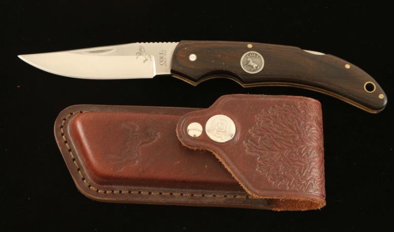 Wood handle with rampant Colt medallion, single stainless steel blade marked 'Colt' with logo. Measures 8" overall with a 3" blade. Comes in Colt embossed brown leather sheath.
