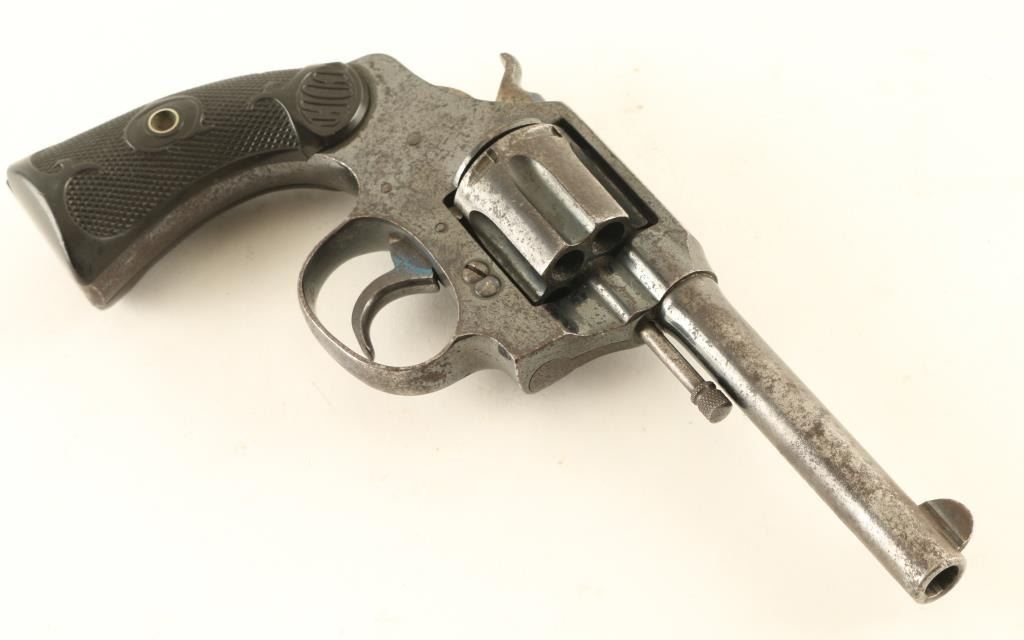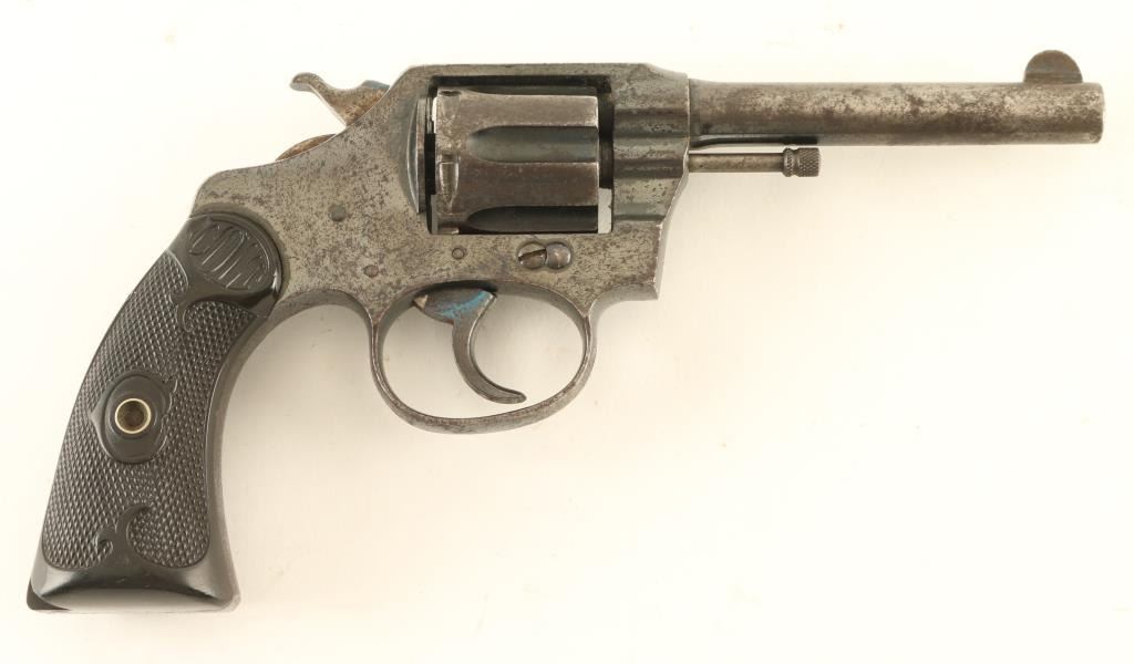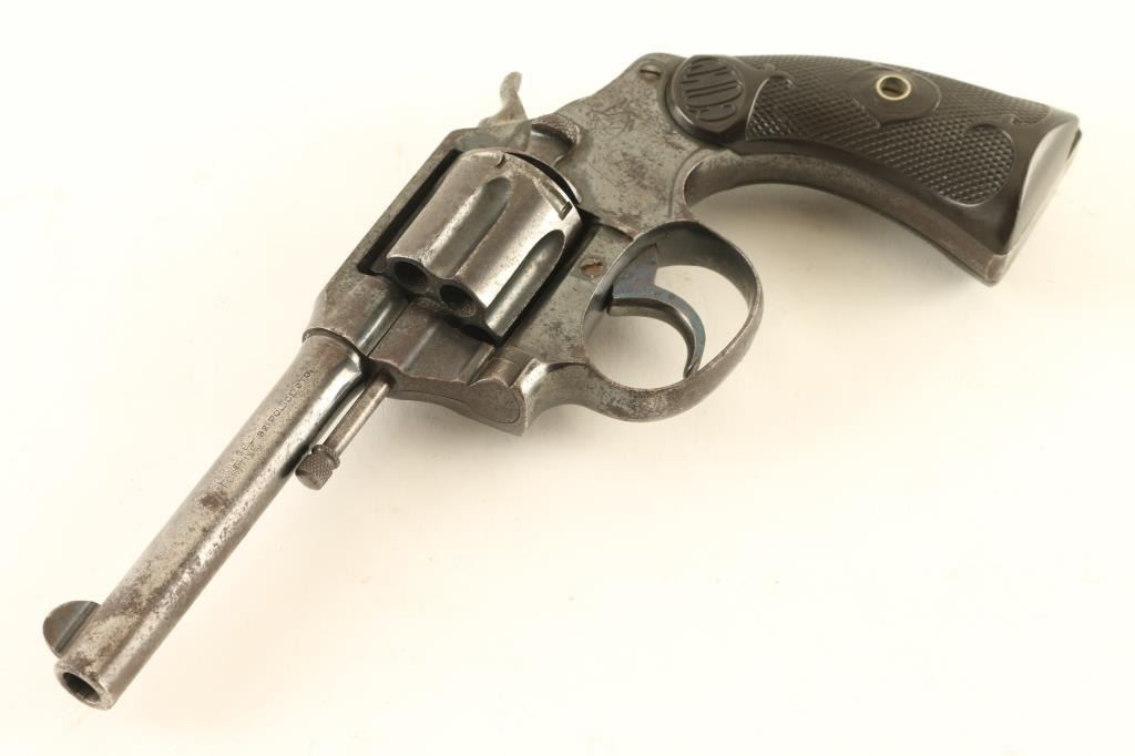 Double/single action revolver features blued finish, checkered black gutta percha grips embossed with "COLT", 4" barrel, fixed sights. Bore is good, lightly pitted with strong rifling. Charge holes are dark, need cleaning. Retains 60% coverage of dark bluing, thinning to gray on barrel and other places. Cylinder, receiver sides and grip straps have a rough texture from deep scratches and from patina formation. Grips are fair condition, missing chips out of both sides at heel. Action is smooth but sluggish, locks up tight, does not time up properly in single action. Condition is NRA Poor *** C&R Firearm ***