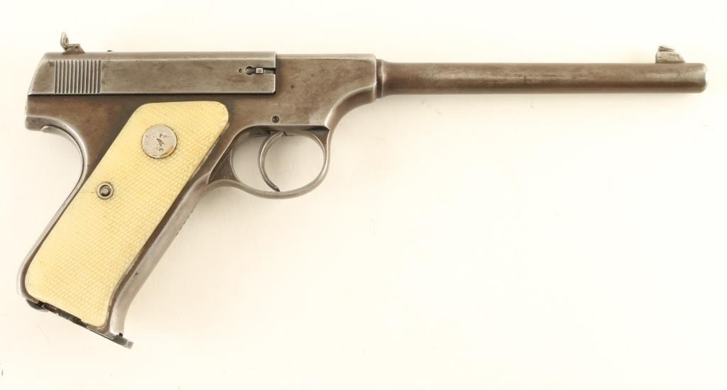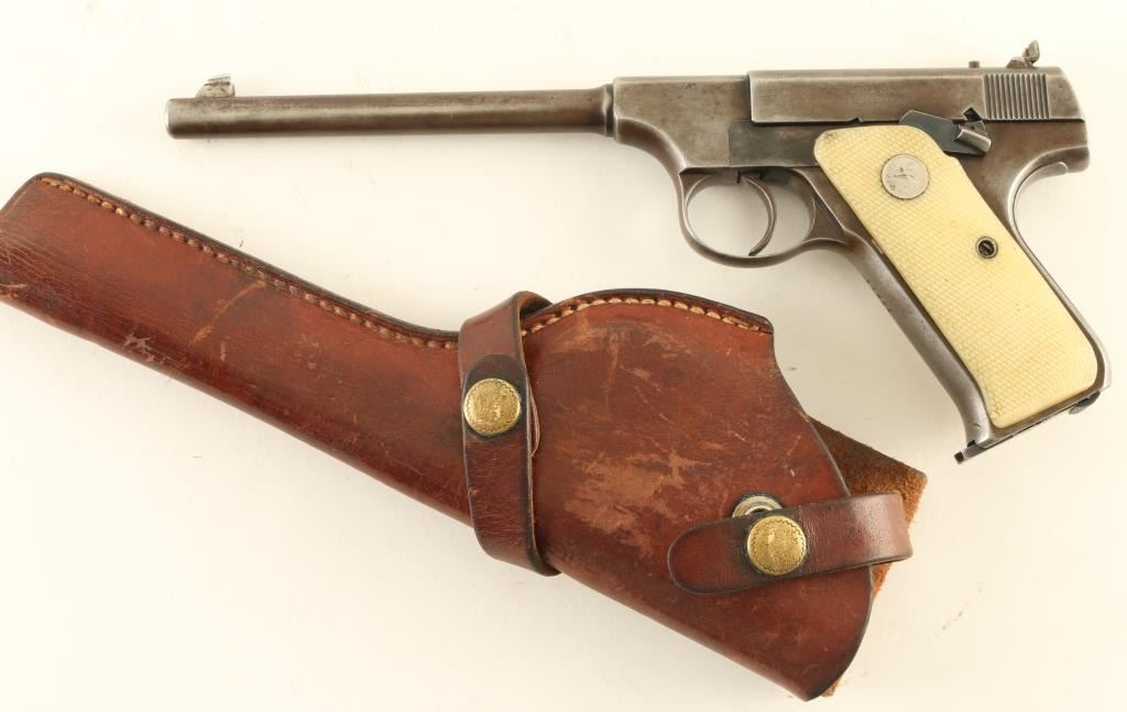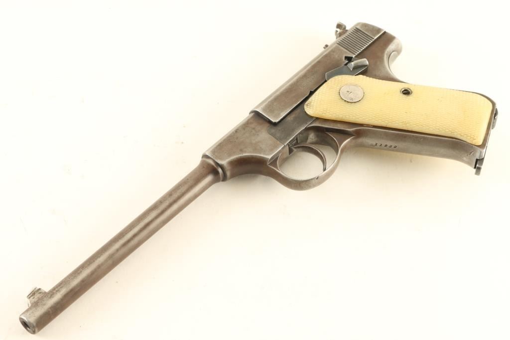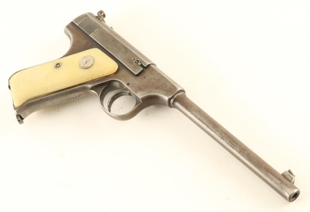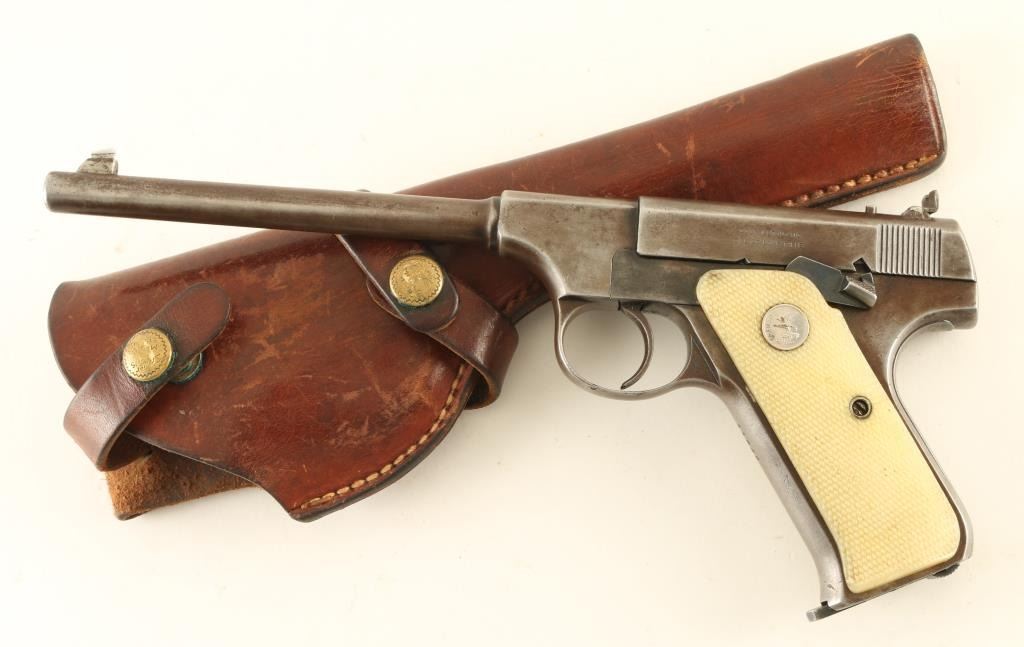 Early Colt Pre-Woodsman Semi-Auto Pistol in .22 caliber with vintage Bauer Bros. slim Jim holster, S/N 11930 and made in 1919 (Over 100 years old). Fair to good overall showing traces of blue drifting to patina. The grips have been replaced and the sights are period added with large “V” notch rear and high blade front sight to match. The mag has been repaired by a gunsmith with brass braze (Vintage repair). The bore is slightly rough. Condition is NRA Good ****C&R Firearm****
