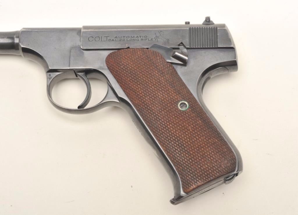 Colt Pre-Woodsman semi-auto pistol. .22 Long Rifle caliber, serial #49279. The pistol is in very good overall condition with a 6 ¾” barrel. The pistol retains the majority of its thinning blued finish with lossesalongboth sides of the barrel and wear at the muzzle. The checkered wood grips are in good condition with some flattening of the checkering noted. The bore is good, the action crisp and markings are sharp onthisearly, desirable Colt. Est.: $750-$1,000. (C+R).