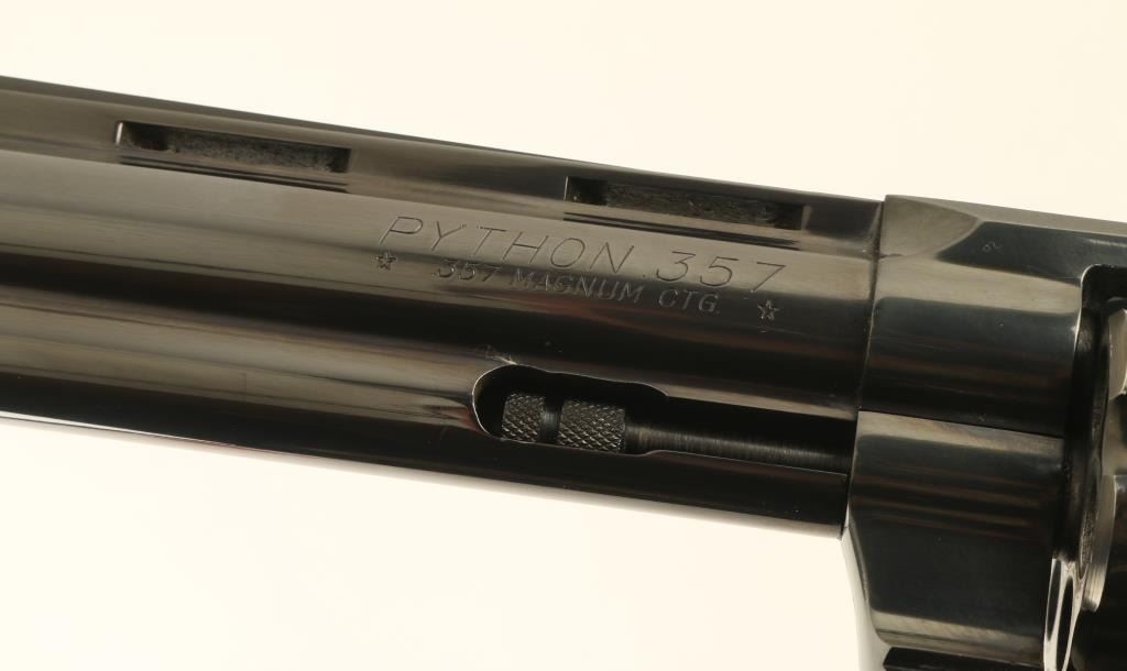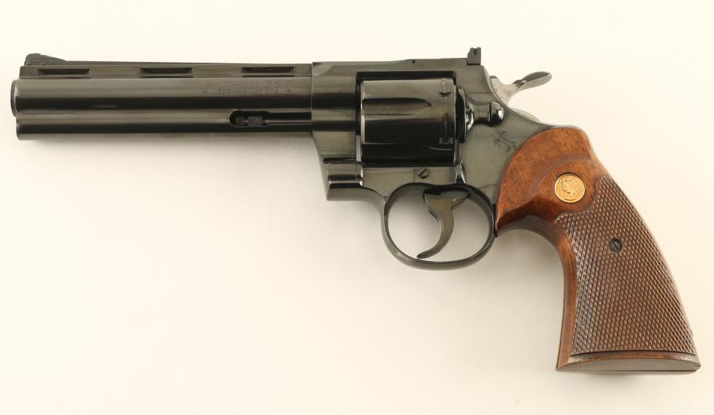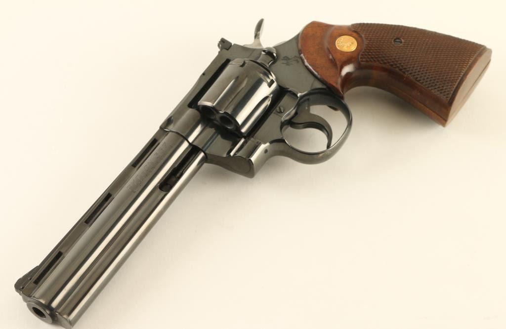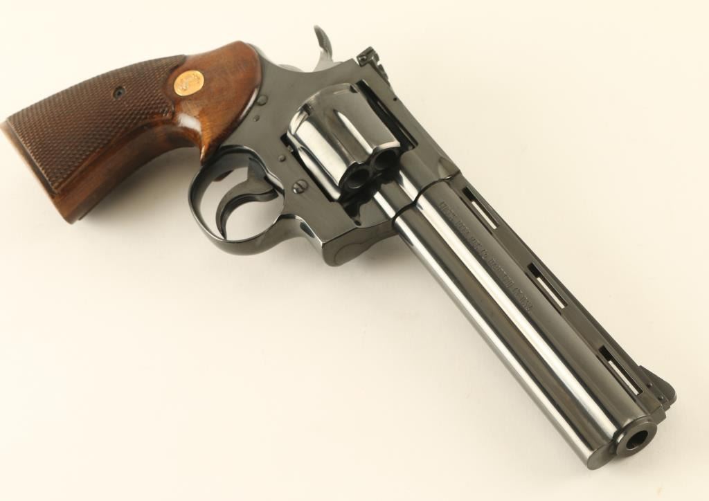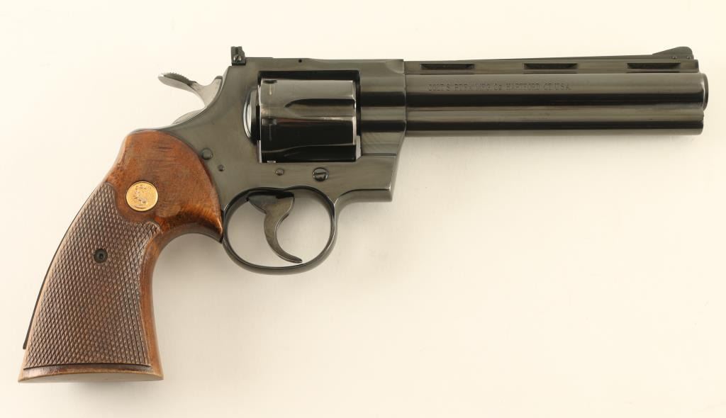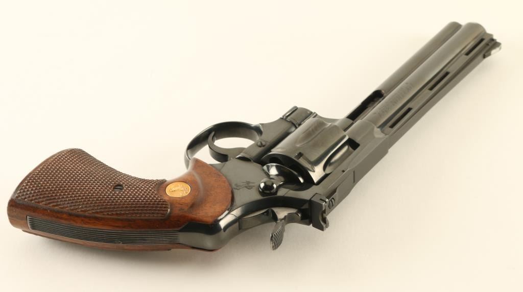 Double/single action revolver manufactured circa 1963. Features blued finish, checkered wood target type grips with gold color Colt medallions, 6" barrel, adjustable sights, grooved narrow trigger, checkered wide spur hammer. Bore is excellent. Retains 90% blue, with visible drag line on cylinder, bare metal at edges of muzzle & places on cylinder, thinning on sides of barrel & at back strap, other signs of use. Rear face of front sight painted white. Sides of hammer polished bright. Grips are very good condition, with finish loss to top of right panel. Action is smooth, locks up tight. Condition is NRA Very Good ++ *** C&R Firearm ***