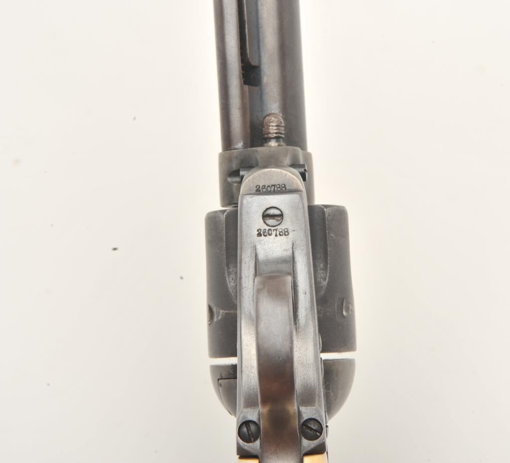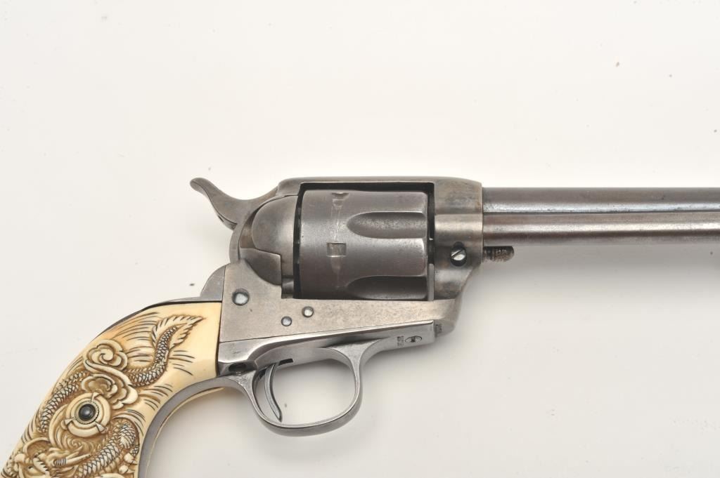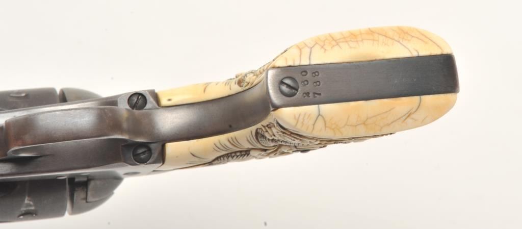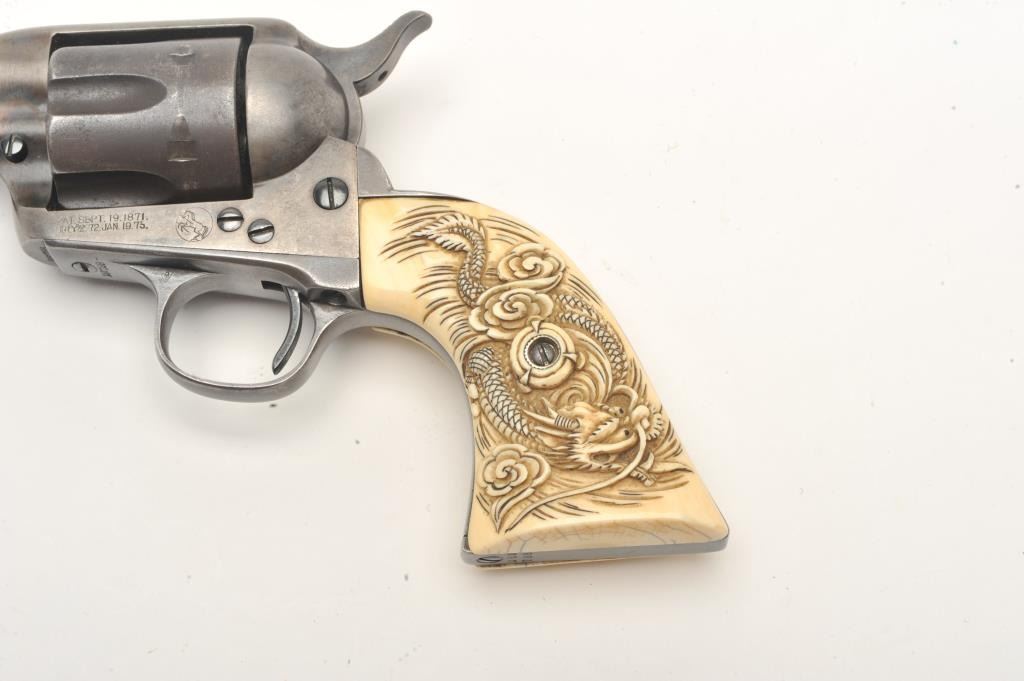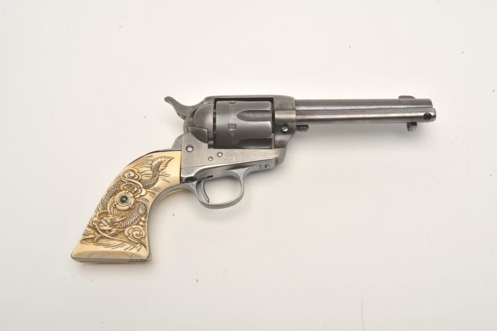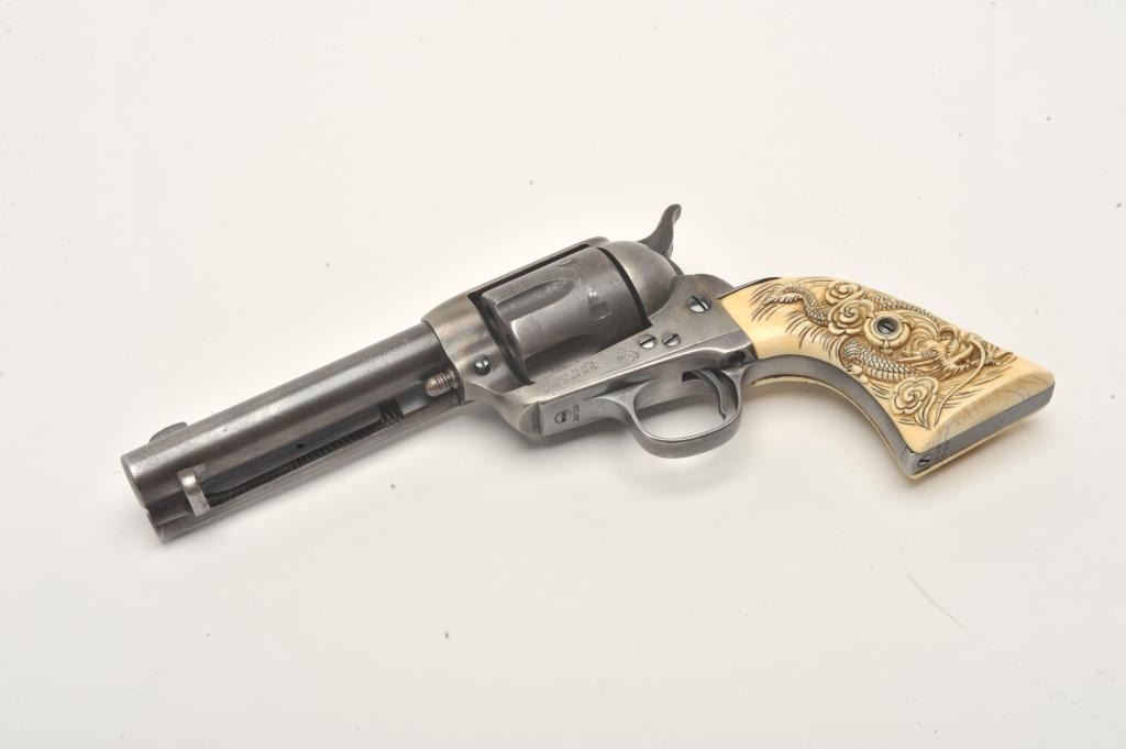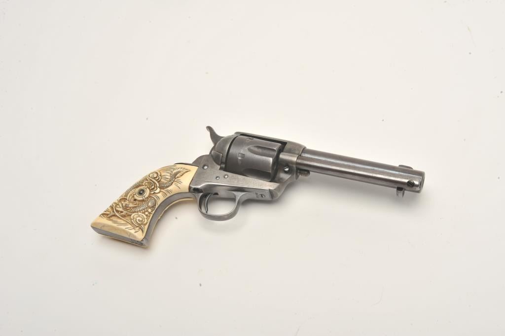 Colt SAA revolver, .32 W.C.F. caliber, 4.75” barrel, blued finish, old raised carved ivory grips, S/N 260788, in overall good to very good condition with a dark patina, traces of original case colors on the frame, crispaction, overall good bore, sharp markings and beautifully carved grips. Accompanied by a Colt factory letter confirming features (stocks “Not Listed”), shipped to A. Baldwin & Co., New Orleans, Louisiana on Nov. 15,1904, five guns in shipment. (C&R/No PPT). Est.: $1,000-$2,000.