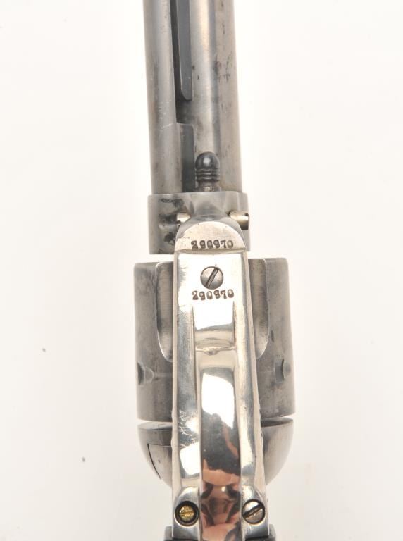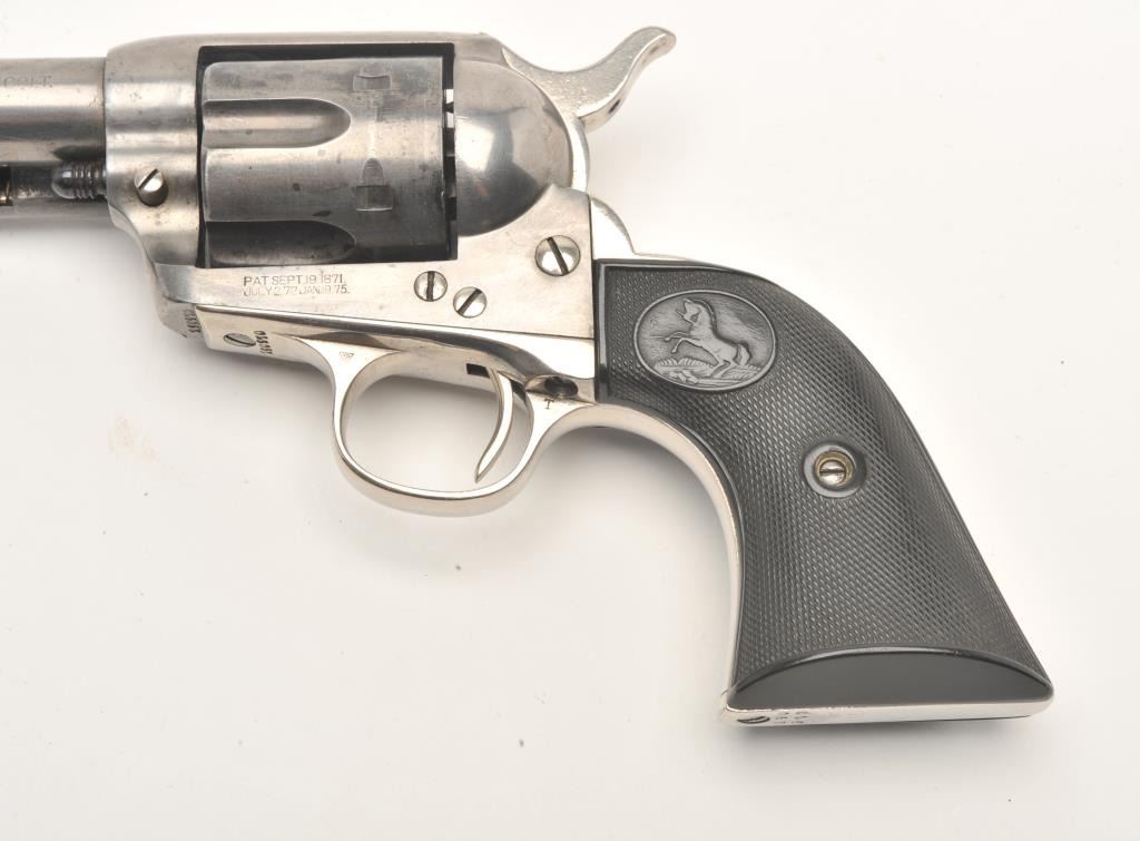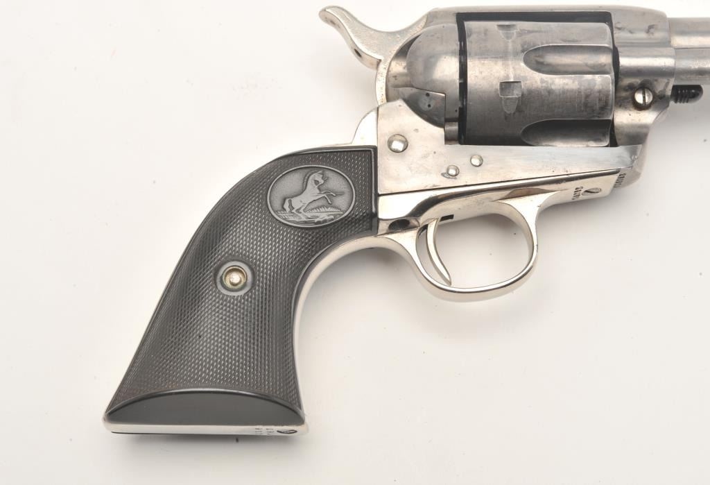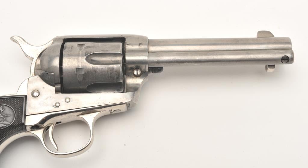 Colt SAA revolver, .41 caliber, 4.75” barrel, blued finish, checkered hard rubber grips, S/N 290970, in overall very good condition, cleaned metal surfaces, very good bore, crisp action, very good markings and grips,accompanied by a Colt factory letter confirming feature with type of stocks “Not Listed”; shipped to Dunham, Carrigan & Hayden Co., San Francisco, California on March 20, 1907; 4 guns in shipment. (C&R/No PPT). Est.: $1,250-$2,500.