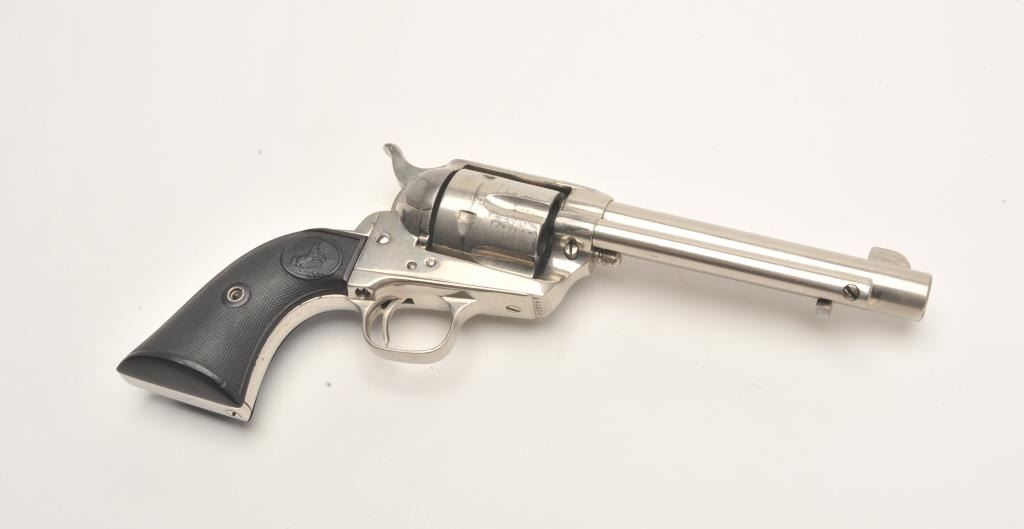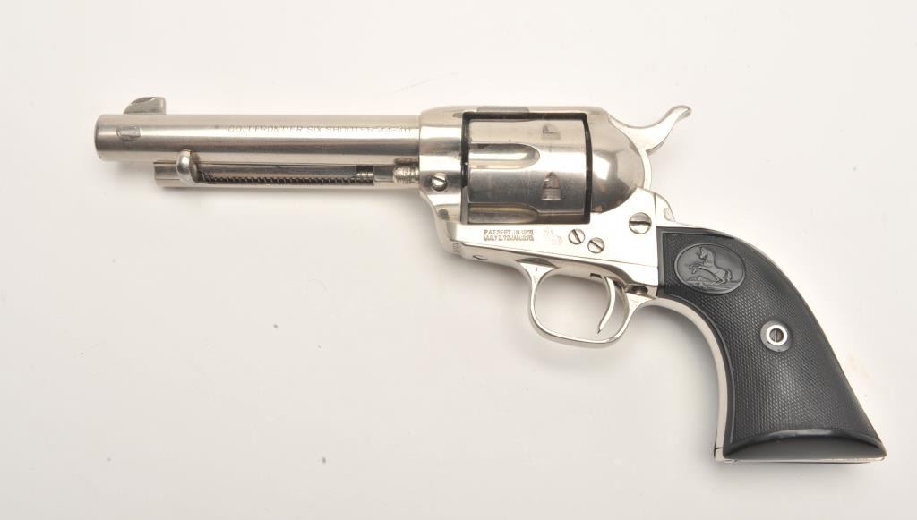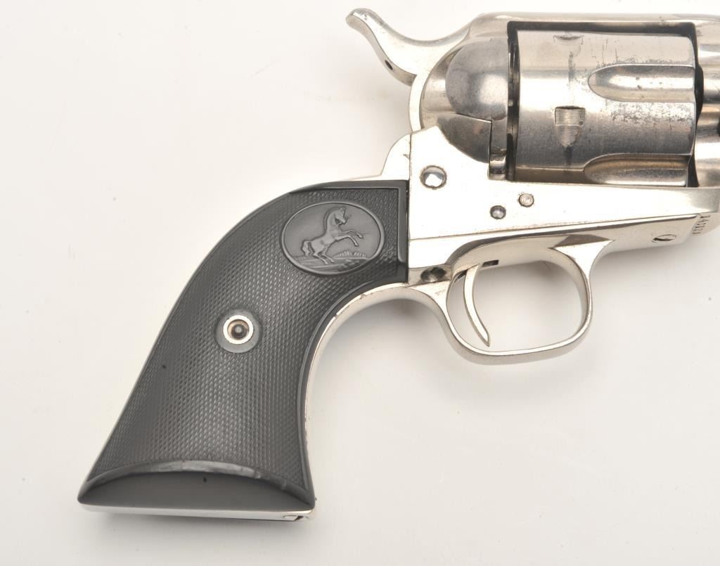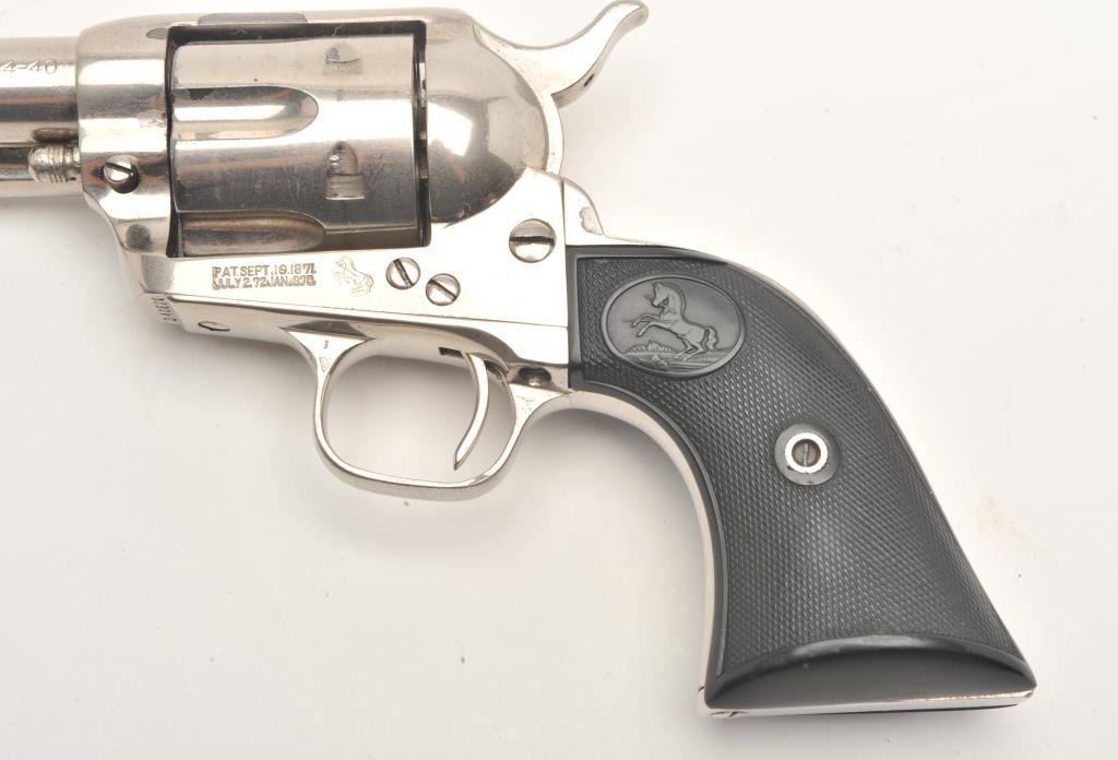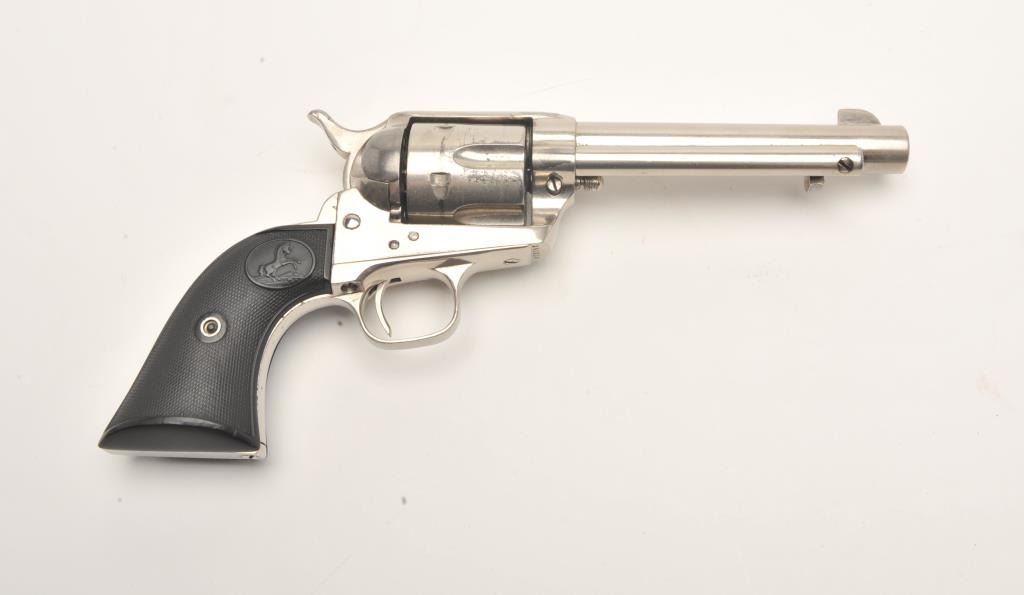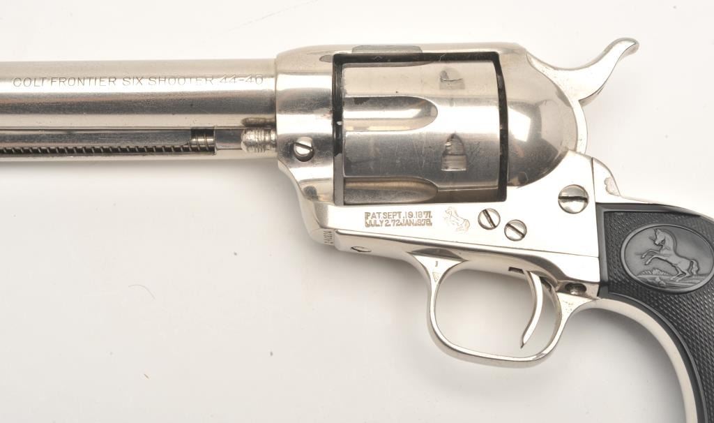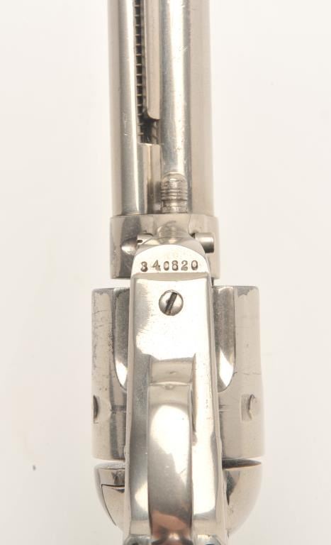 Colt SAA revolver, .44-40 caliber, 5.5” barrel, re-finished nickel, checkered black hard rubber grips, S/N 340820, in overall very good condition as re-finished, crisp action, very good markings, good bore andvery good grips. Accompanied by a Colt factory letter confirming caliber and barrel length, finish noted as “Blue” with type of stocks “Not Listed”; shipped to Momsen, Dunnegan, Ryan Co., El Paso, Texas onSeptember 17, 1920, three guns in shipment. Another “Gone to Texas” Single Action revolver! (C&R/No PPT). Est.: $1,400-$2,800.