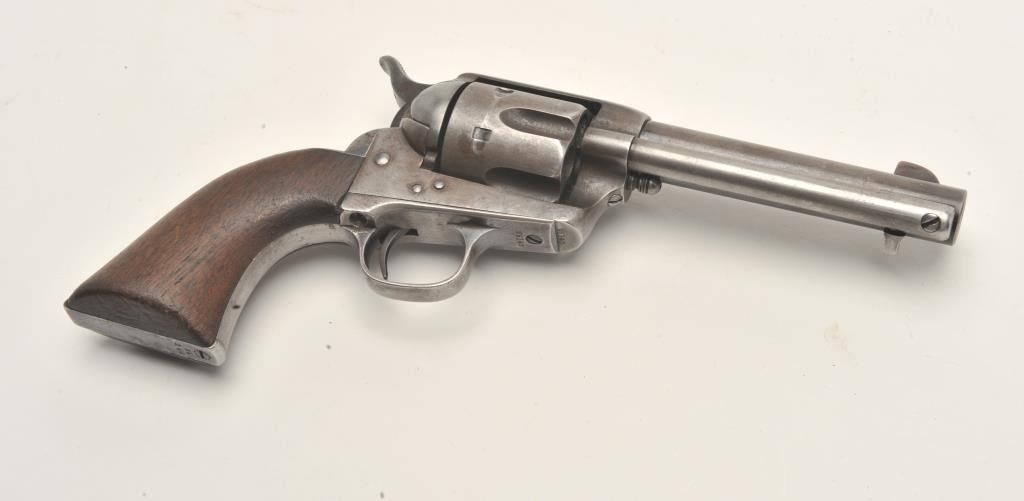 Colt SAA revolver, .45 caliber, 4.75” barrel (later barrel, ca. 1920s-30s), blued finish, wood grips, S/N 95140, in overall good to very good condition showing a dark patina with traces of scattered original finish inprotected areas; very good bore, crisp action, sharp markings and good grips. Accompanied by Colt factory letter noting .45 caliber, blued finish with barrel length and stocks “Not Listed”; shipped to Hibbard,Spencer, Bartlett & Co. on August 24, 1883, fifteen guns in shipment. (Antique). Est.: $1,500-$3,000.