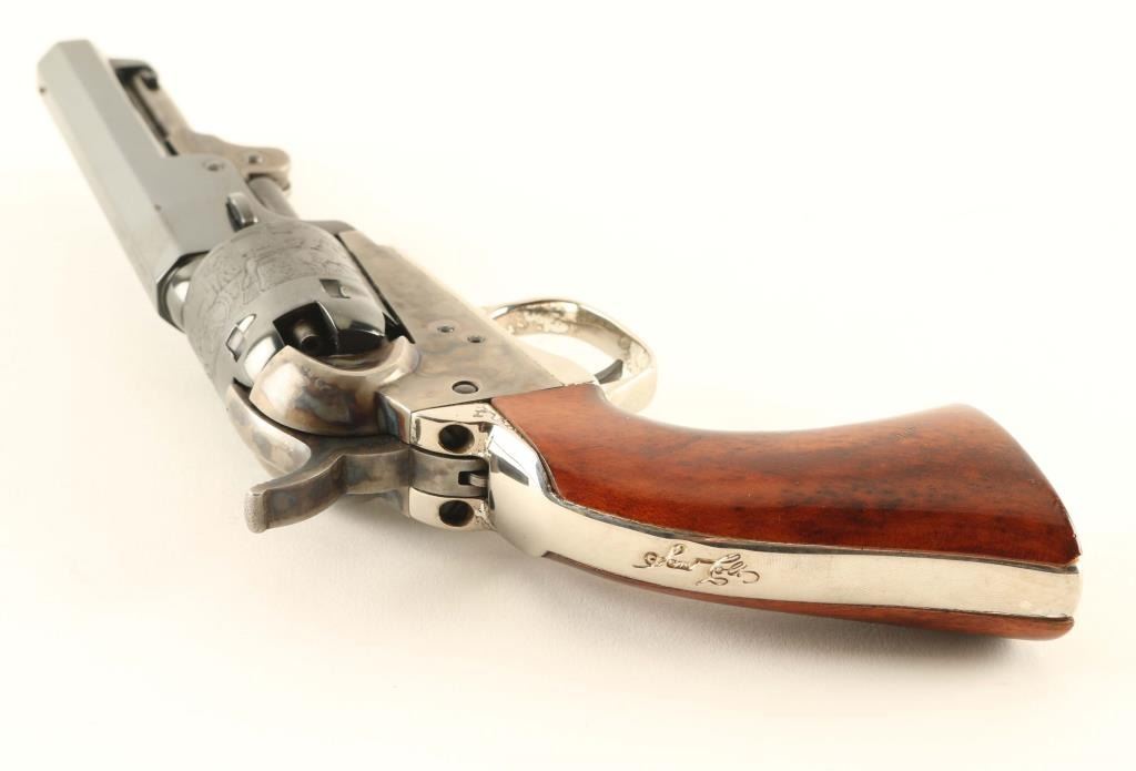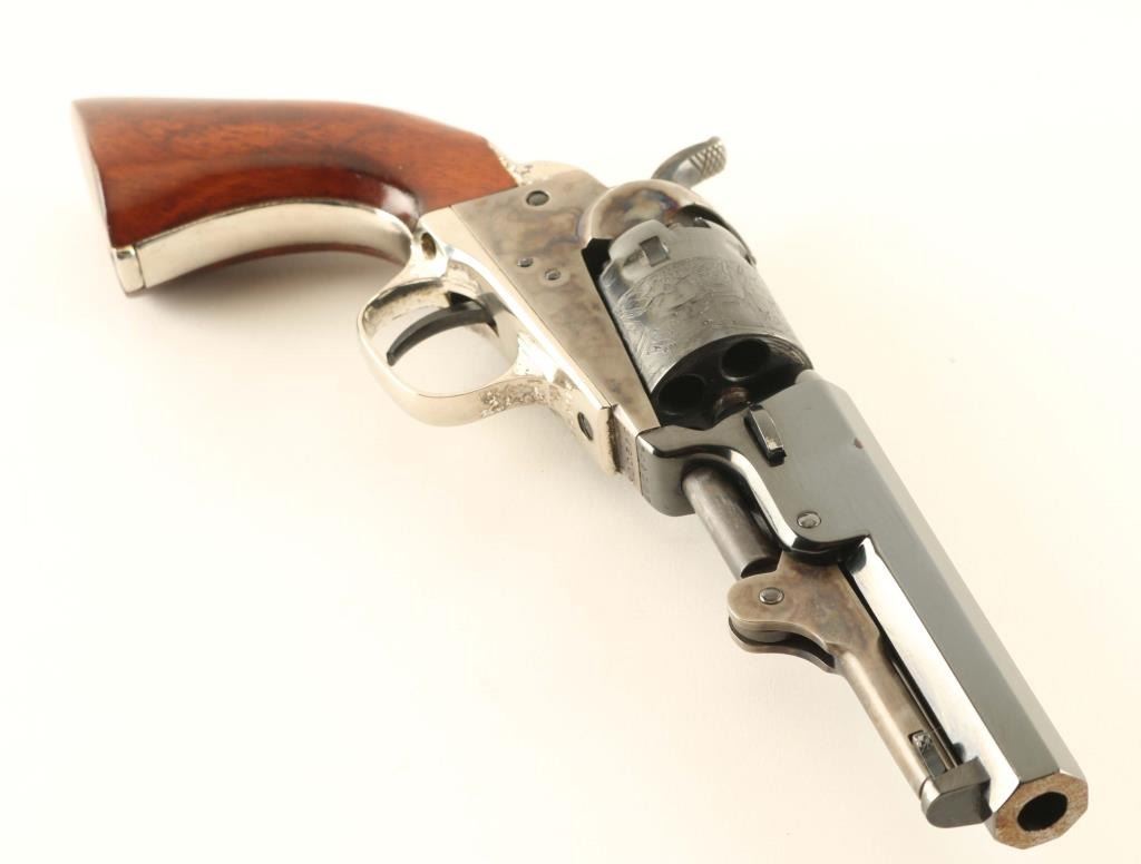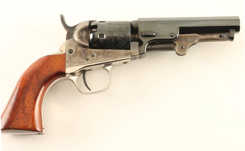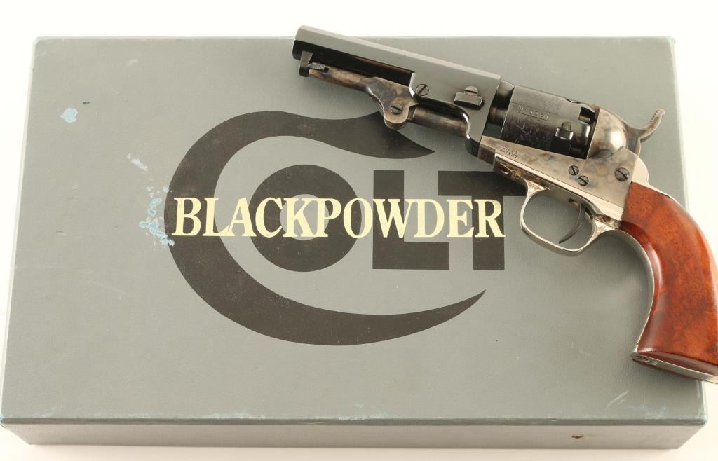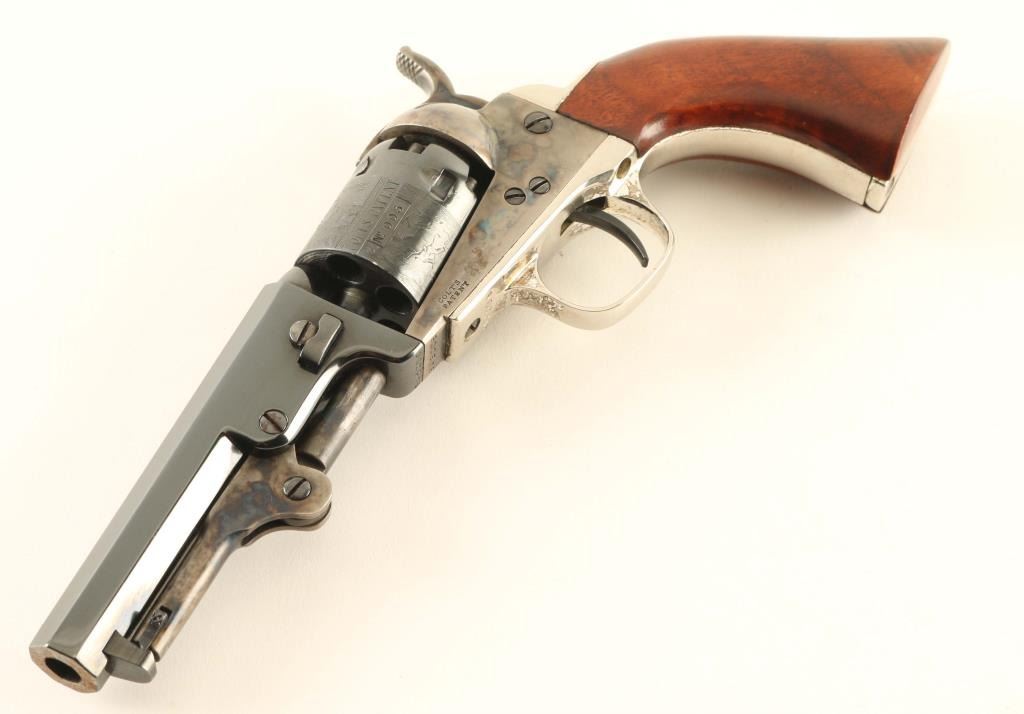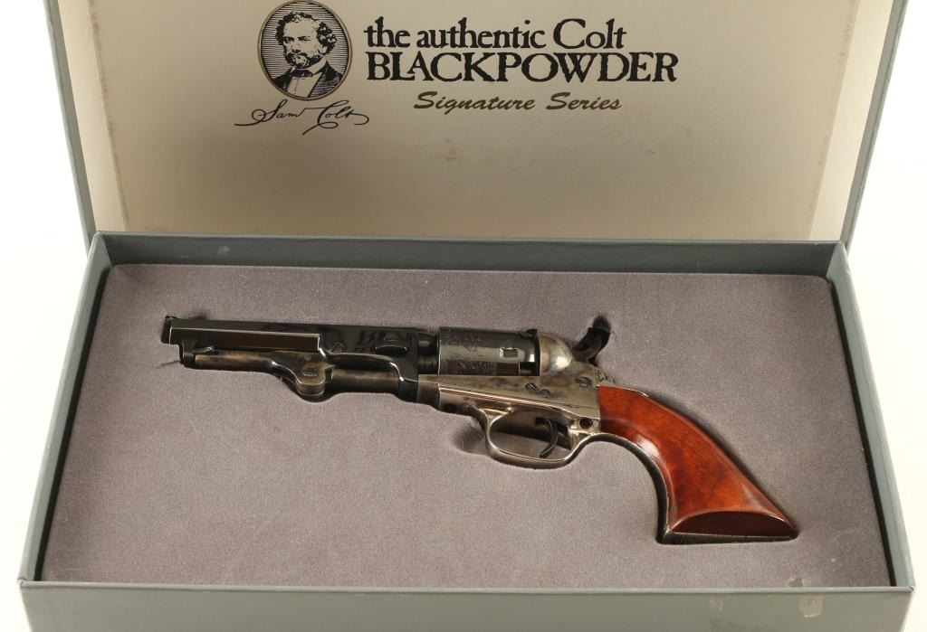 'The Authentic Colt Blackpowder, Signature Series' Small frame single action percussion revolver chambered for .31 caliber ammunition, manufactured in Italy circa 1994-2002. Features a blued & case hardened finish, 4" octagonal barrel, brass cone front sight, 'v' notch rear sight cut into the hammer lip, unfluted five-shot cylinder with roll stamped stagecoach hold-up scene, loading lever, smooth thin trigger, knurled hammer spur, nickel plated grip frame with Sam Colt’s signature engraved on the backstrap and smooth one-piece walnut grip. Includes a factory one-piece grey cardboard box with fitted insert & EXCAM marked bullet mold. Revolver retains approximately 90% of its original finish showing thinning case colors and some rust on the barrel. Action is sound, the bore is excellent and the wood grip is very good. From the Jim Lockwood, Legends of Leather Prescott, AZ Collection. Condition is near NRA Very Good in box. ***Antique Firearm***