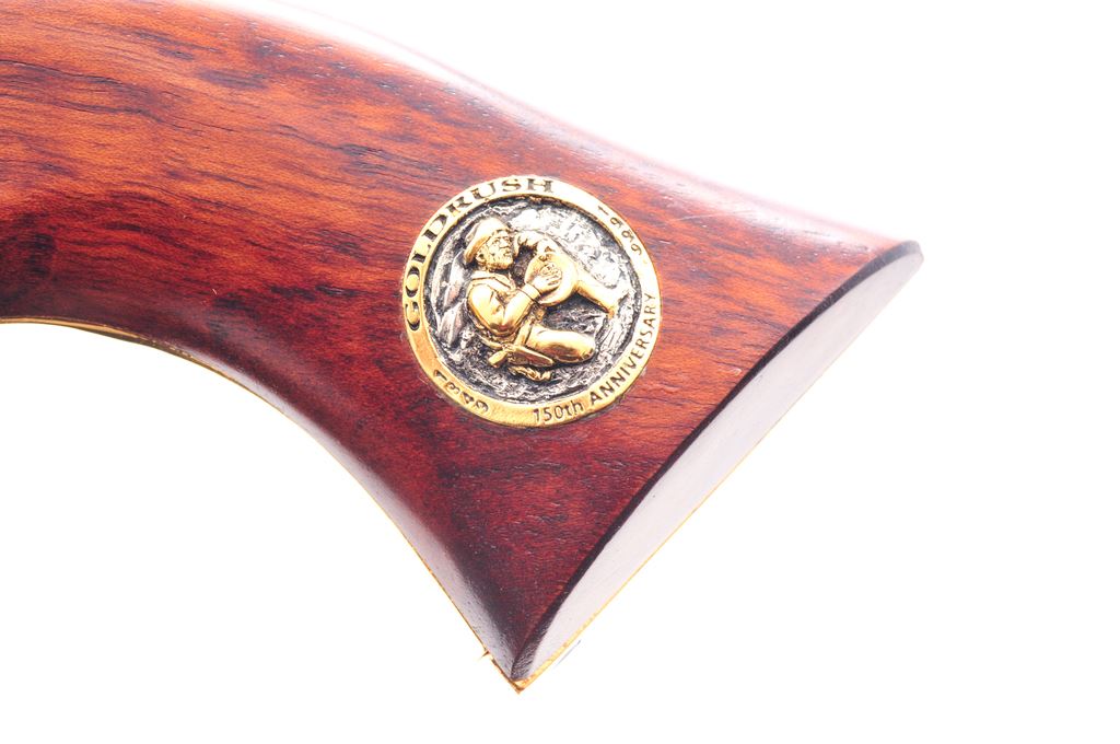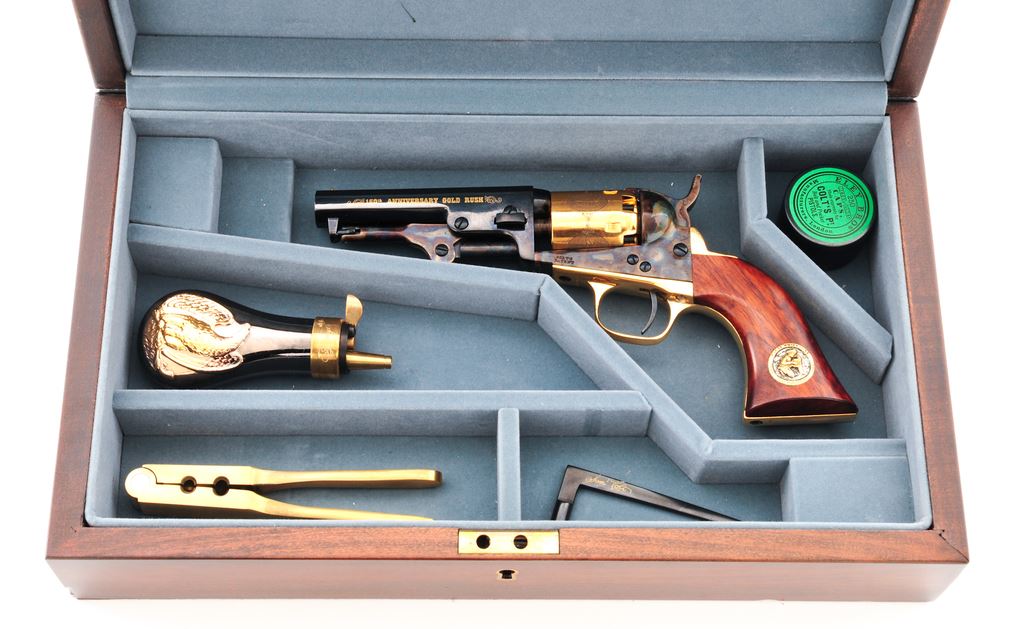 Colt Signature Series 1849 Pocket 150th Anniversary Gold Rush Revolver, with accessory kit, #342756, .31 cal., 4'' barrel, blue and case hardened finish; 24K gold plated cylinder, triggerguard, and backstrap; cylinder with prospecting scenes. Smooth walnut grips with ''Gold Rush'' medallion in the left grip. Backstrap with Sam Colt's signature in script; both sides of the barrel read ''150TH ANNIVERSARY GOLD RUSH'', in gold lettering. Complete with the factory Colt wood display case, owner's manual, display case key, original ''Signature Series'' box, and white cardboard box that is hand numbered to the gun. Also included is the model #A2031 ''Pocket .31'' accessory kit which includes the powder flask, bullet mold, nipple wrench, and cap tin. All of the accessories in this kit are marked in script with Sam Colt's signature. This revolver rates near excellent. Cylinder with general light scratching but appears unfired. Case colors are vibrant; frame appears to have had a lacquer type finish applied with visible light brush marks and dirt particles embedded into the added finish. Grips are excellent. Wood display case with very faint scratching to the lid that is only visible when held at the right angle. Accessories are in as new condition. Est.: $350-$550. (No FFL Required)