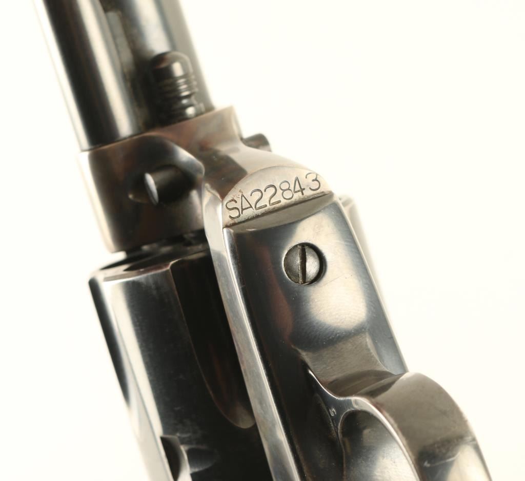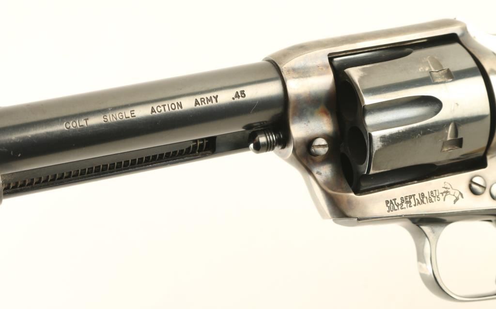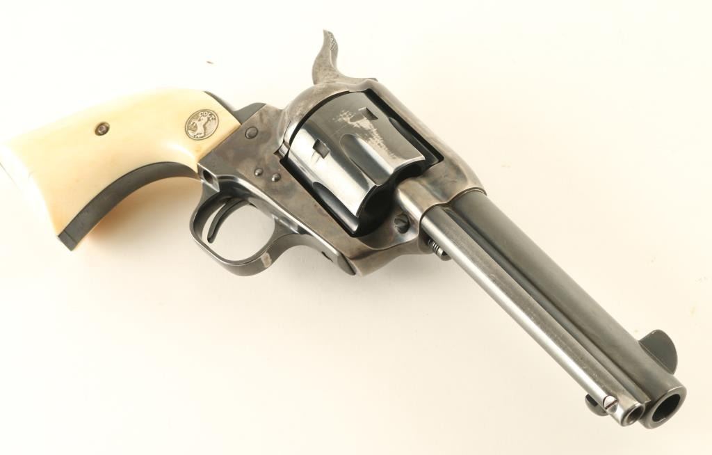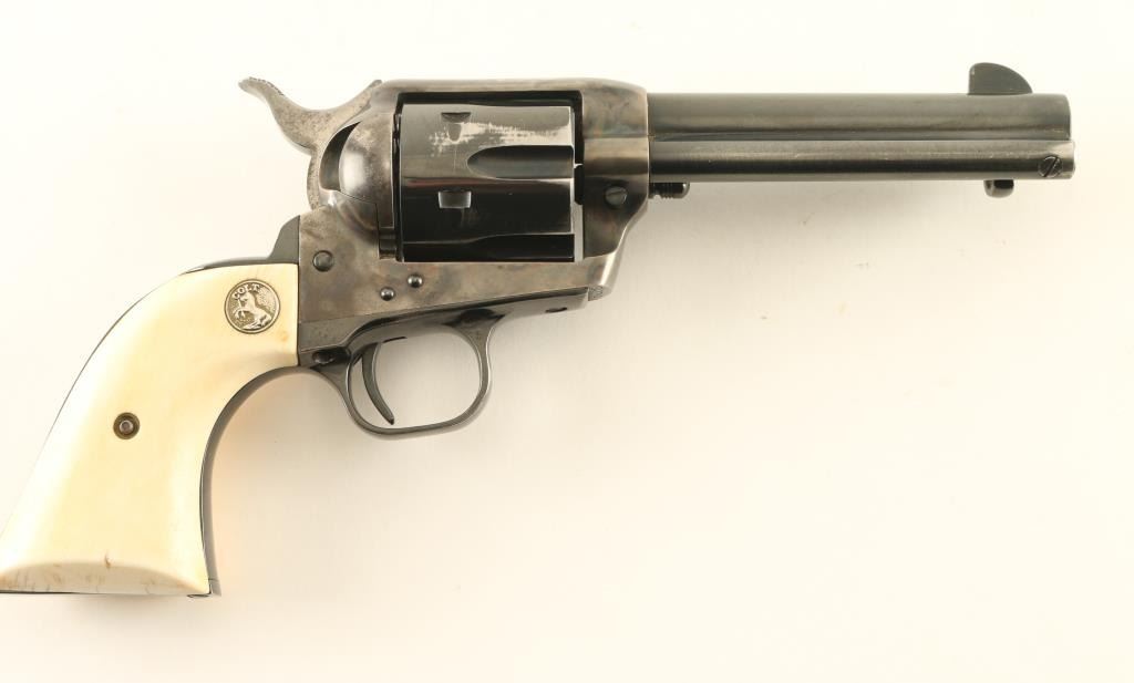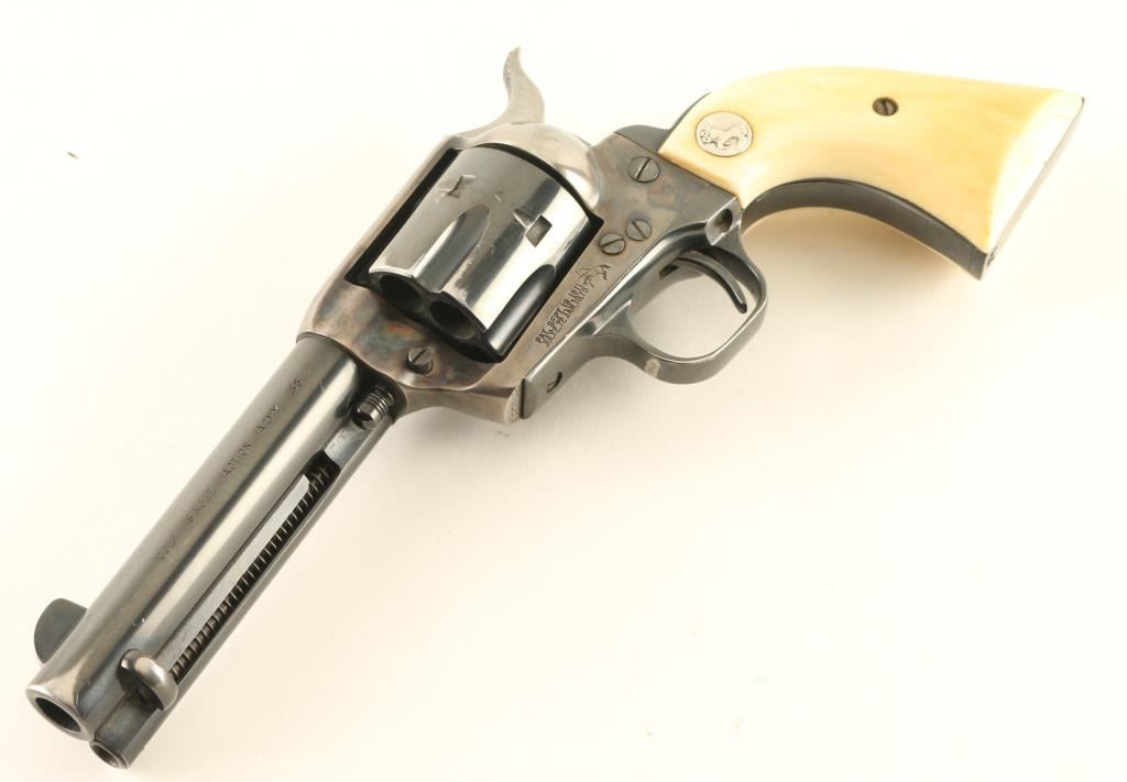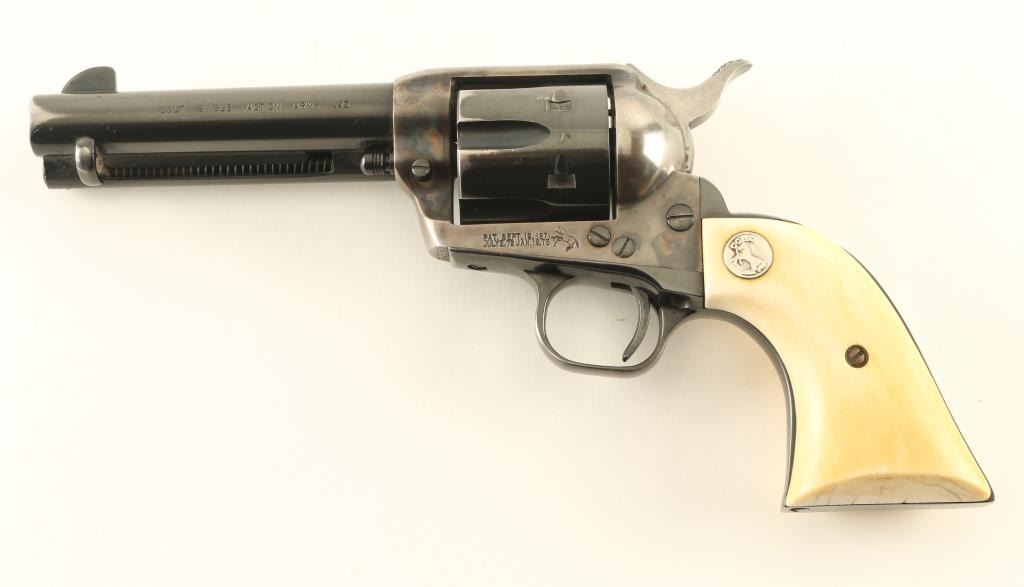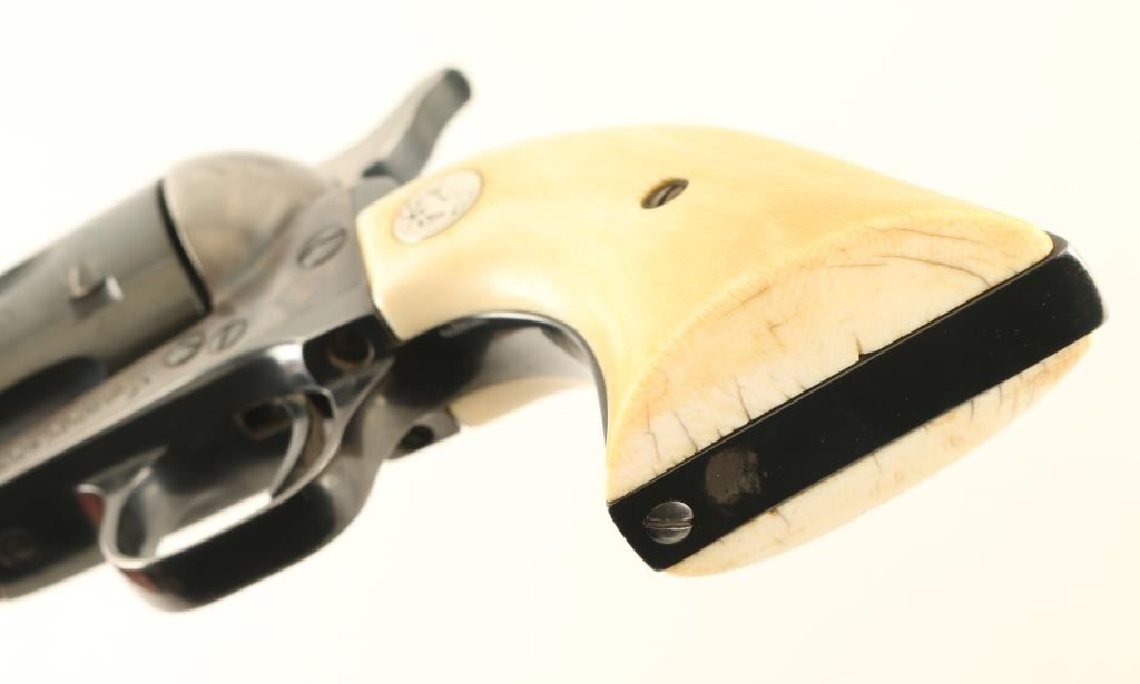 ‘Third Generation’ Single action six-shot revolver chambered in .45 Colt, manufactured circa 1979. The third generation of the S.A.A. is characterized by a new barrel thread pitch & pressed cylinder bushing, production ran from 1976-1982. Features a blued & case hardened finish, 4 ¾” barrel with single line address, blade front sight, square notched rear sight, fluted cylinder, ejector rod, smooth thin trigger, hammer with polished flats & knurled spur, and two-piece ivory grips with inlayed silver Colt medallions. Revolver retains approximately 80% of its original finish showing holster wear, muted case colors, finish loss on the grip straps and a small amount of scattered light rust. Action is crisp with four clicks & good lock-up, the bore is excellent and the ivory grips are very good with caramel color & light crazing on the butt. Condition is near NRA Very Good. ***Modern Firearms*** *From The Jim Lockwood: Legends In Leather Collection