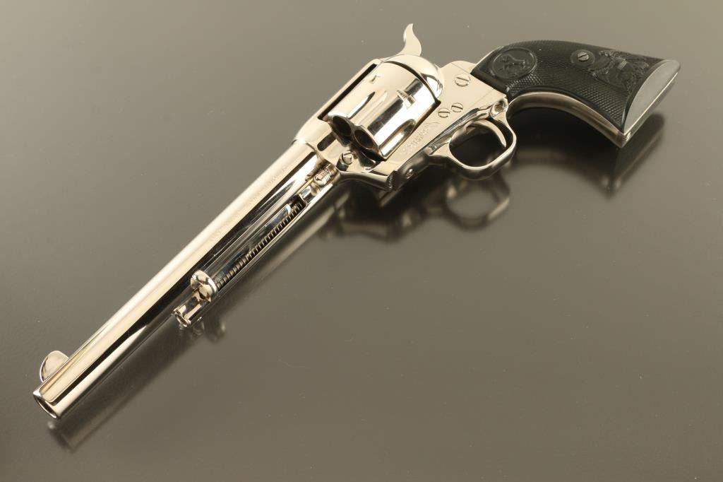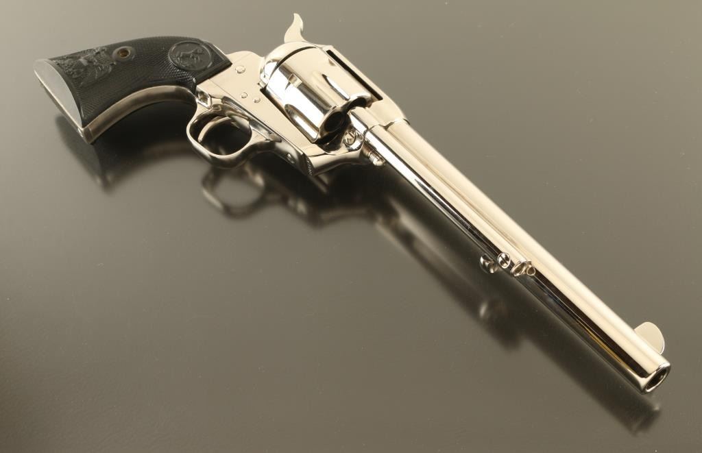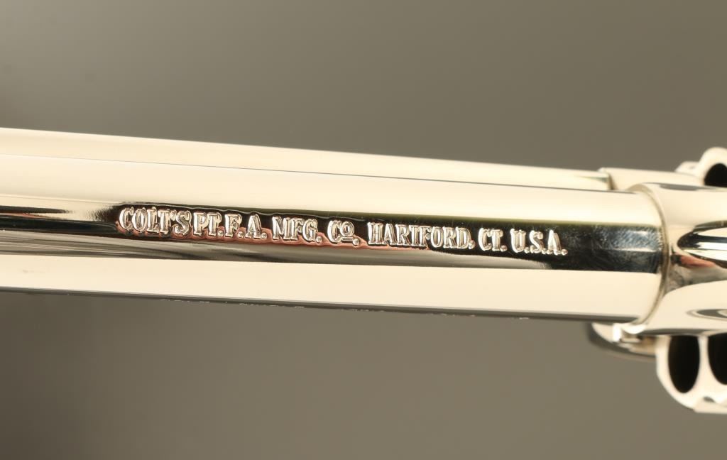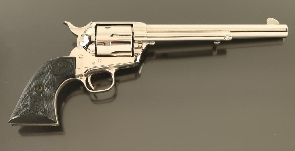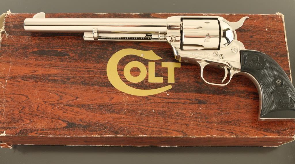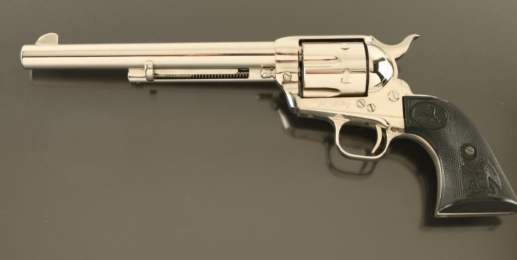 Single action revolver features nickel finish, black plastic grips with Rampant Colt logo and embossed eagle, 7.5" barrel, fixed sights. Bore is excellent condition, has been fired and needs a normal cleaning. Overall condition is like new. Includes manual, factory styrofoam box with faux wood grained cardboard sleeve (missing one end tab). Condition is NRA Excellent - Like New *** Modern Firearm ***