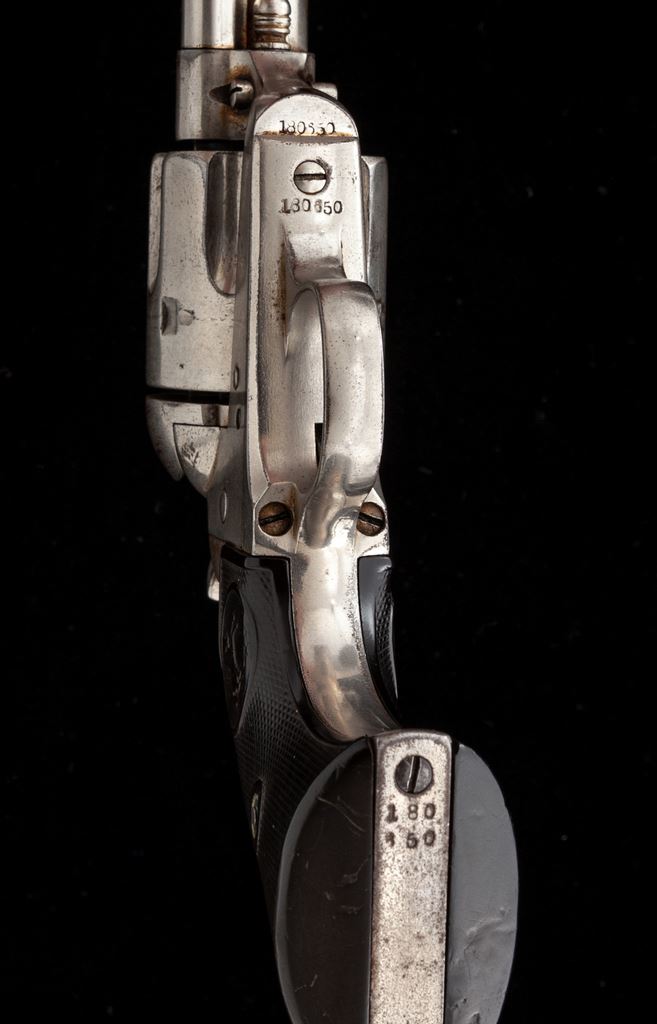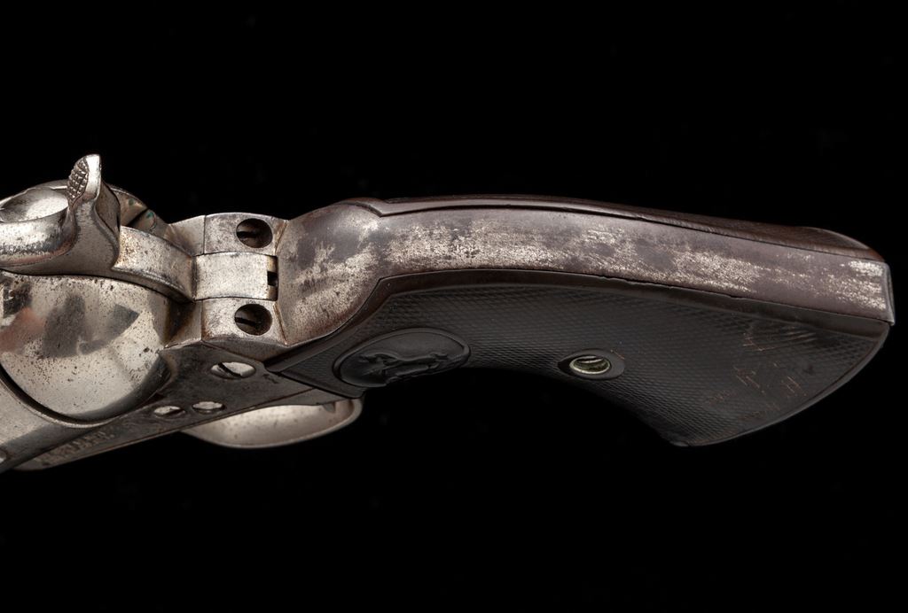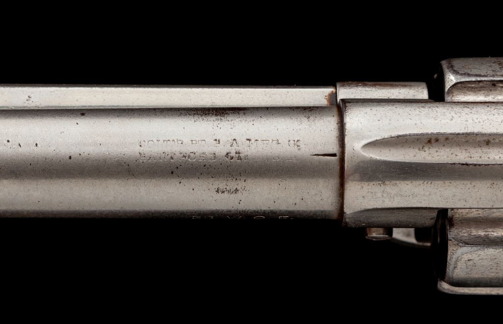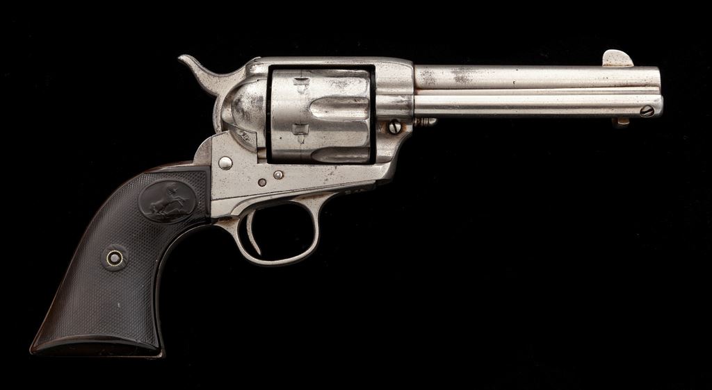 Colt Single Action Army Cartridge Revolver, #180650, .38 WCF cal., 4.75'' round barrel marked ''Colt's Pt. F.A. Mfg. Co. / Hartford, CT U.S.A.'' in two lines and ''38 W.C.F.'' on left side, two-line patent date and encircled Rampant Colt on left frame, ejector gate marked ''536'', with checkered encircled Colt Eagle hard rubber grips. All visible serial numbers match; cylinder is unnumbered. Mfg'd 1898. Appears to have been originally finished in full nickel plate. Condition is good to very good showing what appears to be a combination of original and later nickel plating, with most of the nickel missing on the backstrap; screw slots are mostly unmarred. Grips are worn from use but fit well and appear original; left grip panel shows dings at bottom. Action is crisp with tight lockup; bore is fair to good with visible rifling. Est.: $1,500-$2,000. (Antique)