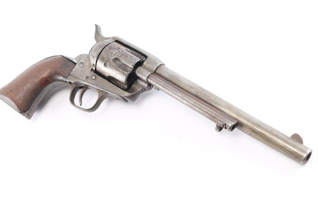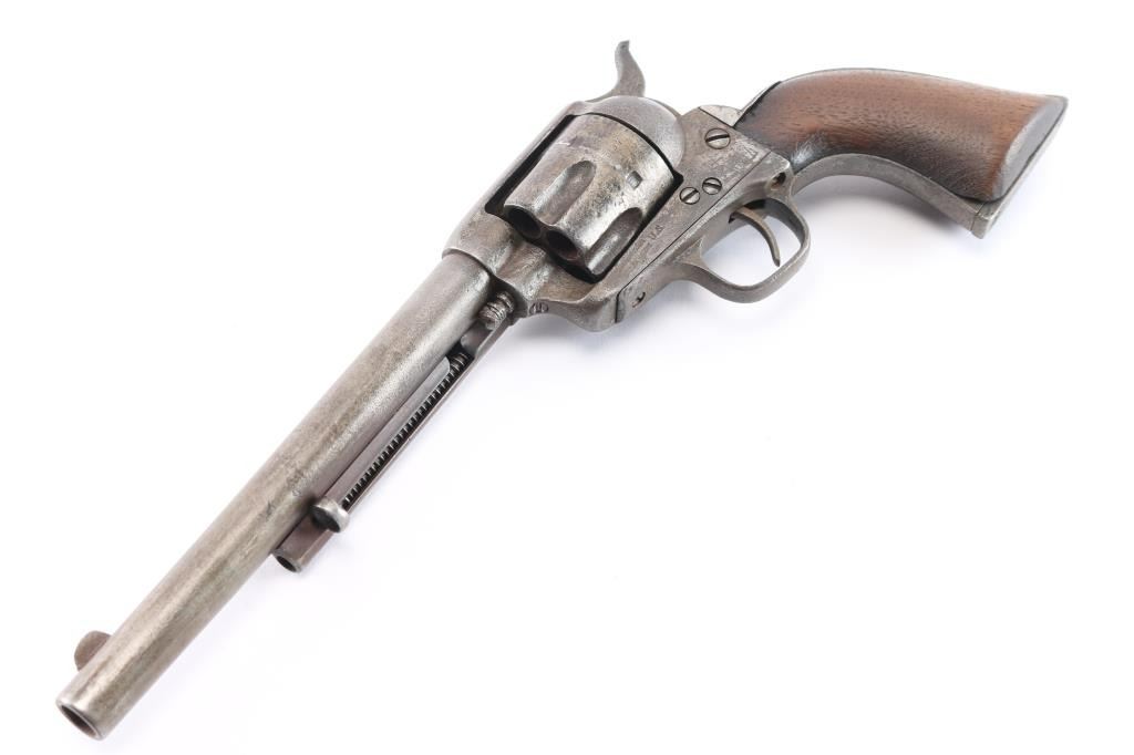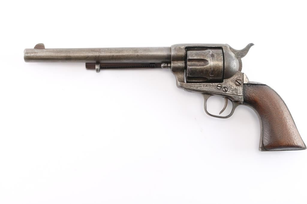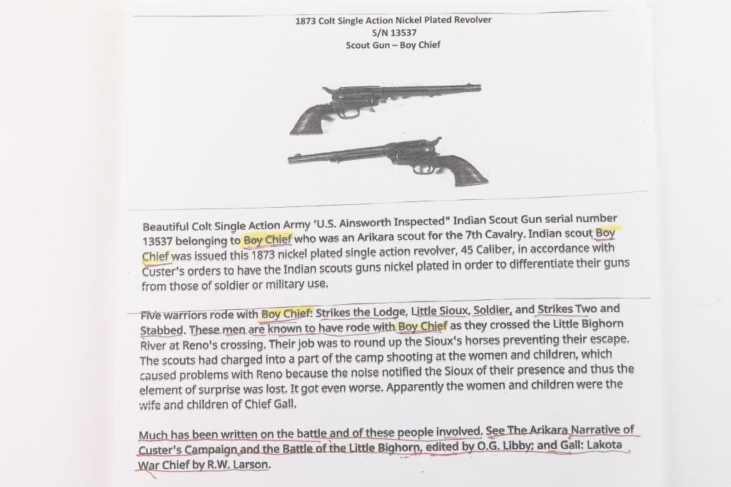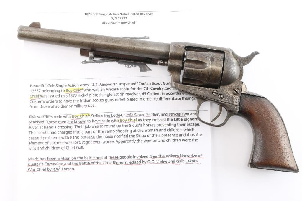 Colt Single Action Army U.S. martially inspected Cavalry revolver, inspected by Ainsworth with research indicating ownership by the "Boy Chief". Serial #13517 with traces of old period nickel plate, some pitting and erosion, wood grips showing large ship and losses with even frontier wear and use. Matching visible numbers, correct small parts and screws. Grips undersized greatly from wear, sanding or replacement. A research folder (included) notes sale of Arikana Scouts 1873 single action revolvers and lists 13517, this revolver, as Boy Chief (Black Calf). Also lists, sale of 115 revolvers by Hartley and Graham. The aforementioned list does not document the original source, though this revolver by serial number is known as the Boy Chief Colt S.A. from a prominent western history collection.