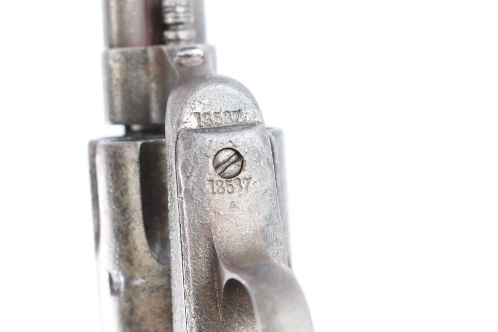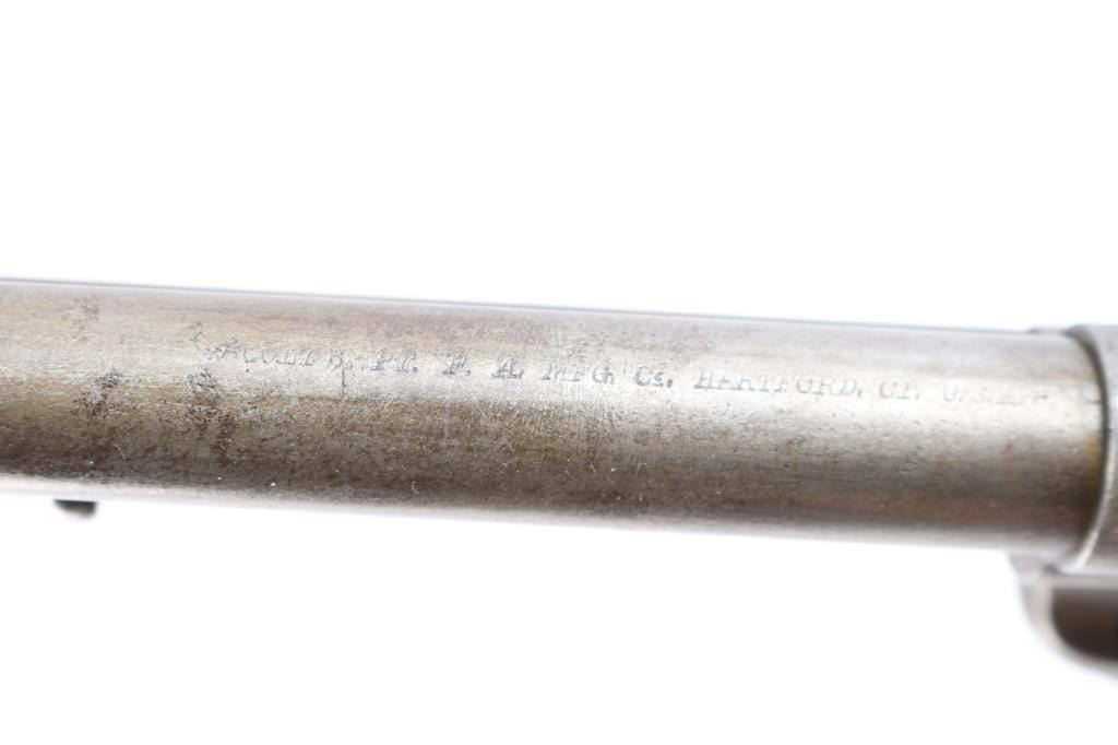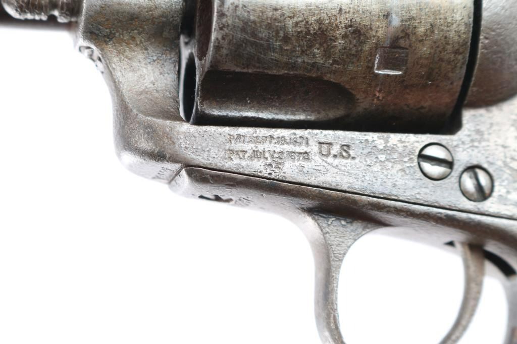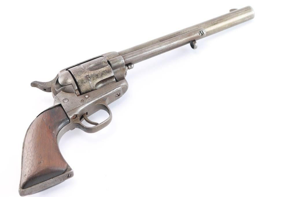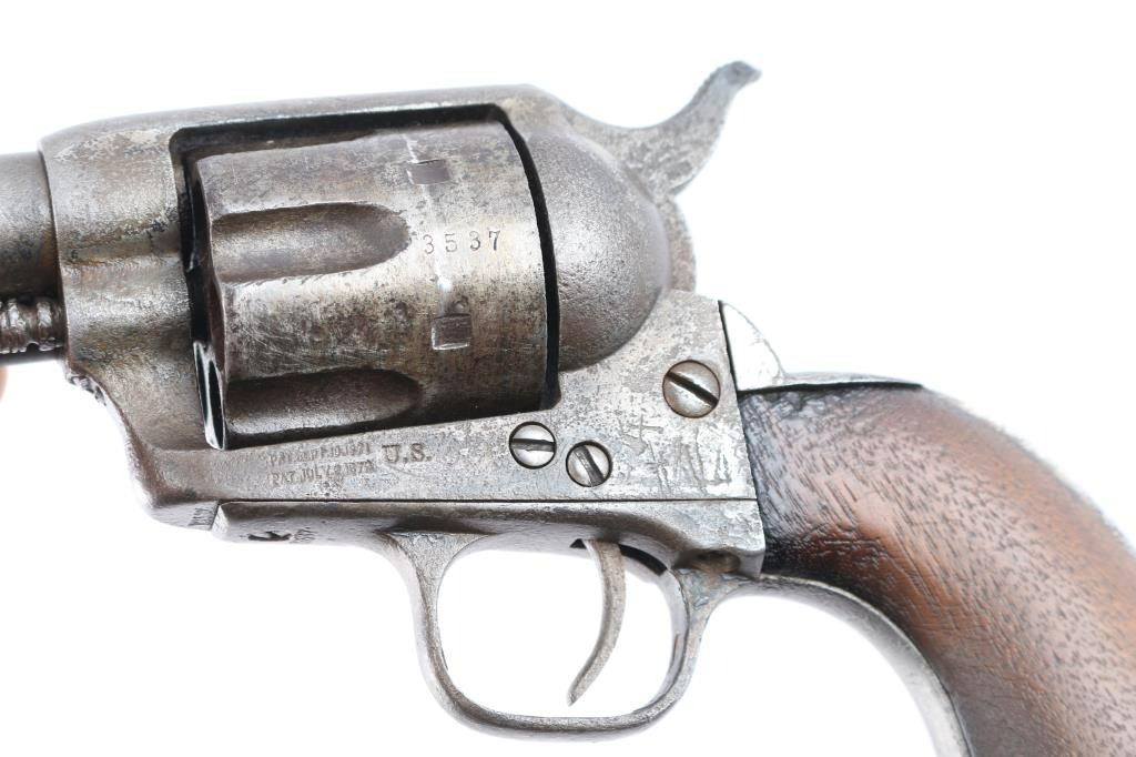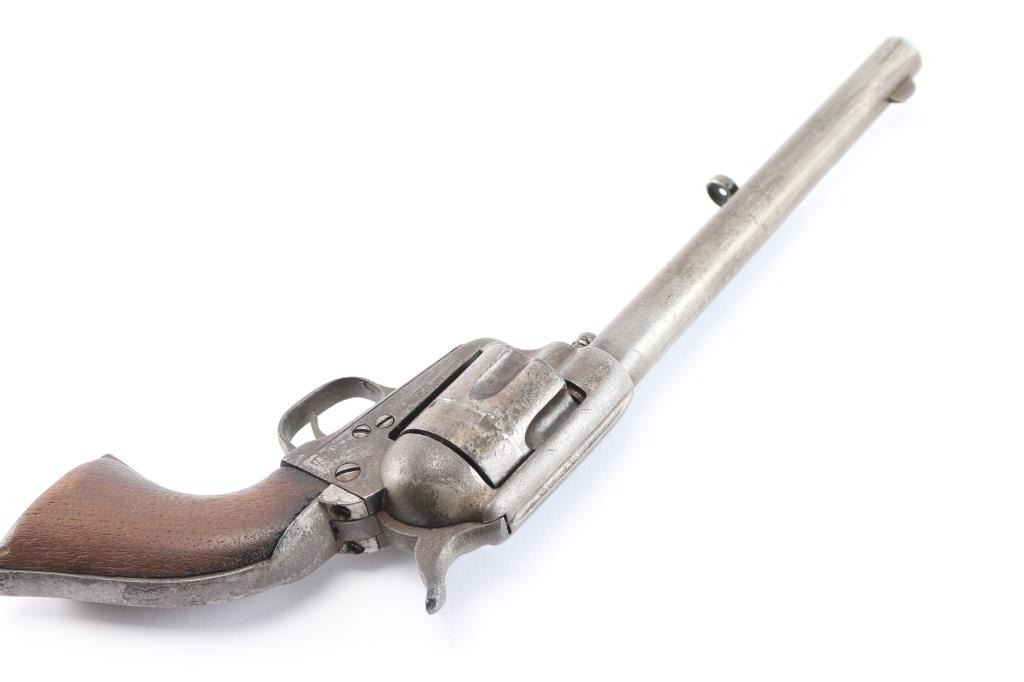 Colt Single Action Army U.S. martially inspected Cavalry revolver, inspected by Ainsworth with research indicating ownership by the "Boy Chief". Serial #13517 with traces of old period nickel plate, some pitting and erosion, wood grips showing large ship and losses with even frontier wear and use. Matching visible numbers, correct small parts and screws. Grips undersized greatly from wear, sanding or replacement. A research folder (included) notes sale of Arikana Scouts 1873 single action revolvers and lists 13517, this revolver, as Boy Chief (Black Calf). Also lists, sale of 115 revolvers by Hartley and Graham. The aforementioned list does not document the original source, though this revolver by serial number is known as the Boy Chief Colt S.A. from a prominent western history collection.